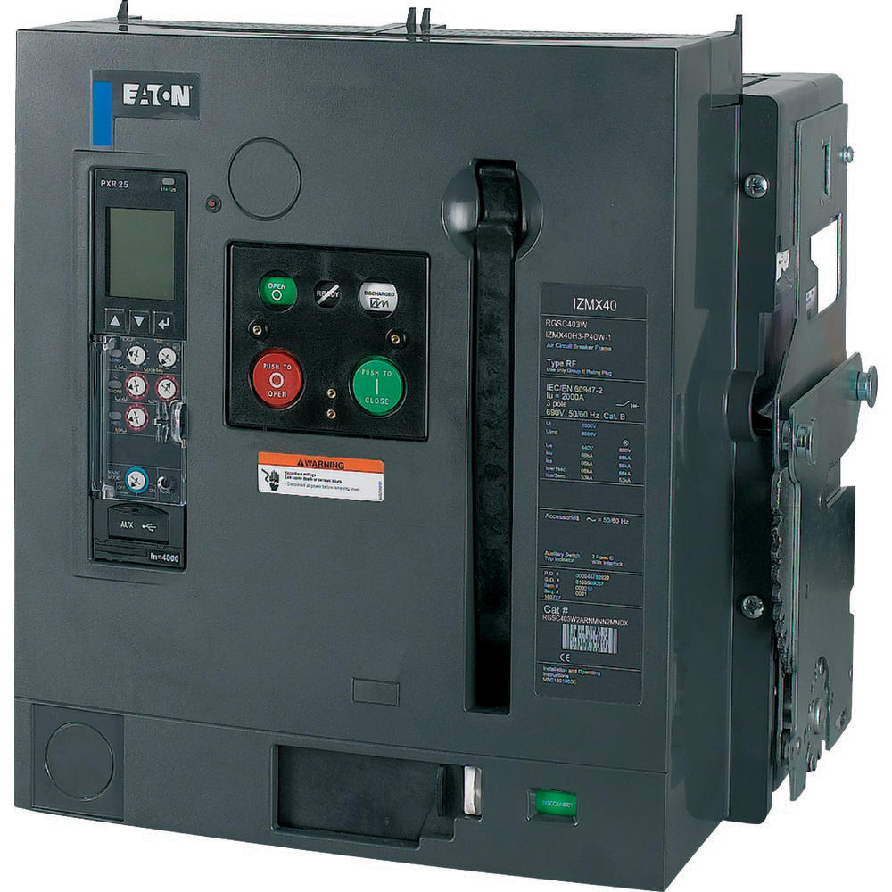 Leistungsschalter IZMX40 (Offene Leistungsschalter/Trennschalter), 3-polig, Strombereich: Bis zu 4000 A, Bemessungsstrom = Bemessungsdauerstrom (In = Iu): 1250 A, bis 440 V 50/60 Hz (Icu): 66 kA, bis 440 V 50/60 Hz (Ics): 66 kA, Überlastauslöser, min. (Ir): 500 A, Überlastauslöser, max. (Ir): 1250 A, Installationsart: Ausfahrtechnik, Standard/Genehmigung: IEC, Schutzfunktion: P Messung