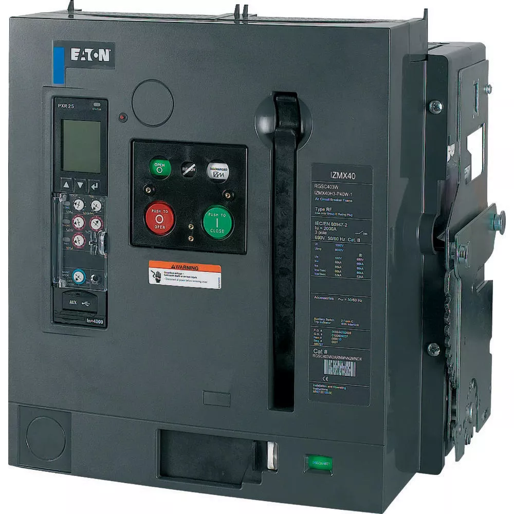 Leistungsschalter IZMX40 (Offene Leistungsschalter/Trennschalter), 3-polig, Strombereich: Bis zu 4000 A, Bemessungsstrom = Bemessungsdauerstrom (In = Iu): 1000 A, bis 440 V 50/60 Hz (Icu): 66 kA, bis 440 V 50/60 Hz (Ics): 66 kA, Überlastauslöser, min. (Ir): 400 A, Überlastauslöser, max. (Ir): 1000 A, Installationsart: Ausfahrtechnik, Standard/Genehmigung: IEC, Schutzfunktion: Selektivschutz