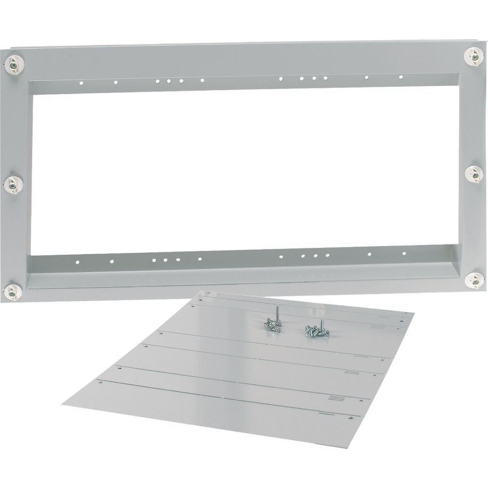 Frontplatte Mehrfachmontage NZM3, BPZ-FP-NZM3X-...-MV; vertikal; Breite 600 mm, Höhe 450 mm; max. 2x XNH 1/2x XNH 2/1x XNH 3; Stahlblech, pulverbeschichtet, RAL 7035; mit Erdung verbundene Verschlüsse, vorbereitete Ausschnitte in der Frontplatte; ohne Montageplatte