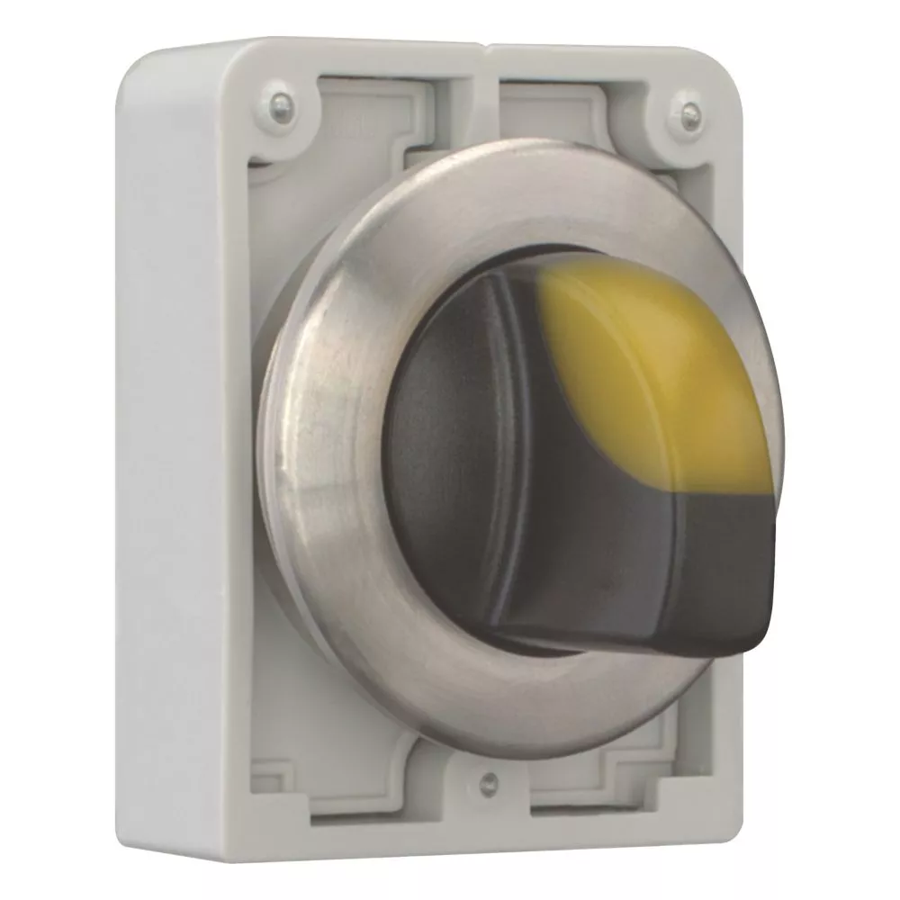 Przełącznik podświetlany, Zacisk śrubowy: RMQ-Titan, Urządzenie pojedyncze, Projekt: z pokrętłem, bez samopowrotu, 3 położenia, Kolor uchwytu na kciuk: żółty, Stopień ochrony: IP64, Pierścień czołowy stal nierdzewna, Podłączanie do SmartWire-DT: tak, z przyłączami SWD-RMQ, Wymiary przedniej części: Ø 36 mm, Instrukcje: Funkcja zatrzymania / powracania przycisku, może zostać zmieniony za pomocą elementów kodujących M22-XC-Y, Normy: IEC/EN 60947, VDE 0660, Stopień ochrony: IP64