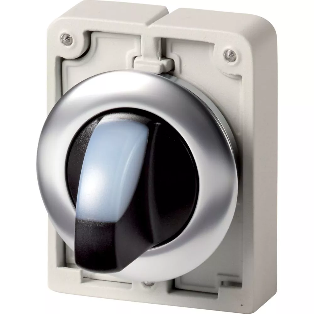 Przełącznik podświetlany, Zacisk śrubowy: RMQ-Titan, Urządzenie pojedyncze, Projekt: z pokrętłem, bez samopowrotu, 2 położenia, Kolor uchwytu na kciuk: Biały, Stopień ochrony: IP64, Pierścień czołowy stal nierdzewna, Podłączanie do SmartWire-DT: tak, z przyłączami SWD-RMQ, Wymiary przedniej części: Ø 36 mm, Instrukcje: Funkcja zatrzymania / powracania przycisku, może zostać zmieniony za pomocą elementów kodujących M22-XC-Y, Normy: IEC/EN 60947, VDE 0660, Stopień ochrony: IP64