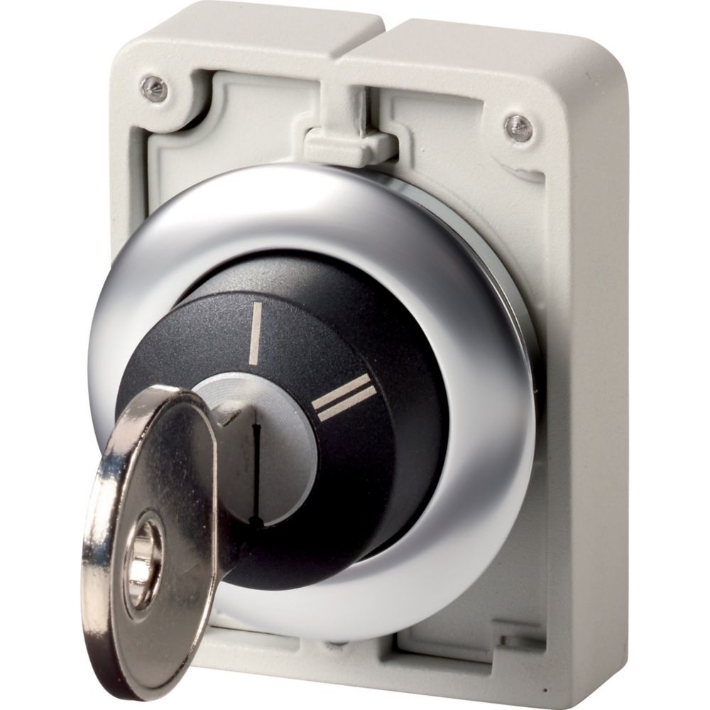 Element uruchamiający z kluczem, Zacisk śrubowy: RMQ-Titan, Urządzenie pojedyncze, Projekt: Mechanizm blokujący pracę, na kluczyk, bez samopowrotu, nie nadaje się do zamków systemowych, 2 położenia, II, wkładka przycisku: czarna, z oznaczeniem, stopień ochrony: IP64, Pierścień czołowy stal nierdzewna, Podłączanie do SmartWire-DT: tak, z przyłączami SWD-RMQ, Wymiary przedniej części: Ø 36 mm, Instrukcje: Funkcja zatrzymania / powracania przycisku, może zostać zmieniony za pomocą elementów kodujących M22-XC-Y, Konfigurowalny kluczyk wysuwny z adapterami kodującymi M22-XC-…, Z 1 kluczem, Normy: IEC/EN 60947, VDE 0660, Stopień ochrony: IP64