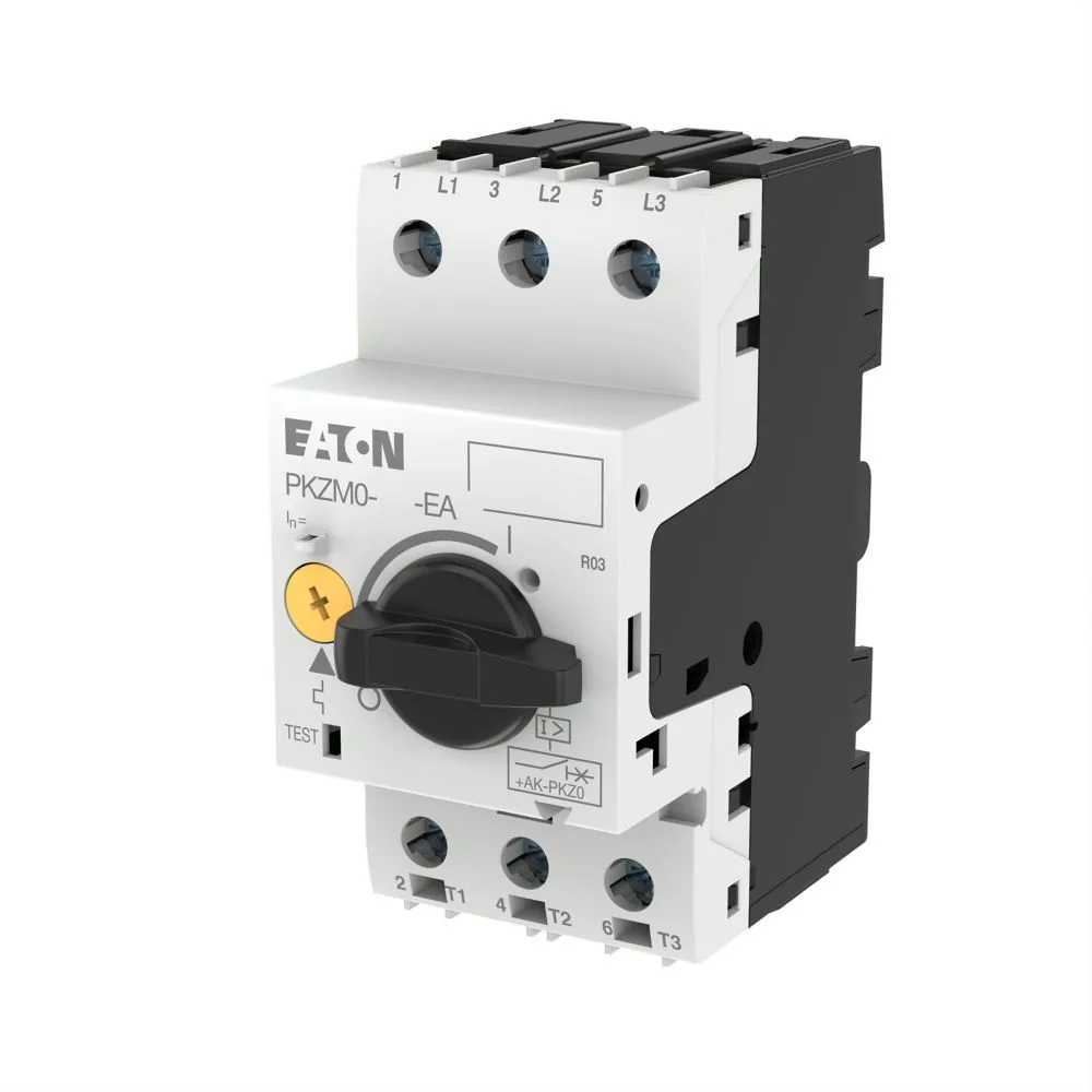 Motorschutzschalter nach IEC/EN 60947, 3-polig PKZM0 Baugröße, mit einstellbarem Überlastauslöser und unverzögertem Kurzschlussauslöser, phasenausfallempfindlich, Schraub und Schnappmontage, mit Schraubklemmen, Kappeneinbaumaß 45 mm, Bemessungsbetriebsspannung Ue 690 V, Schutzart IP20, fingersicher nach VDE 0106 T. 100, verfügbares Zubehör: Hilfsschalter Modul, Spannungsauslöser, Schalter Modul, Clipsplatte