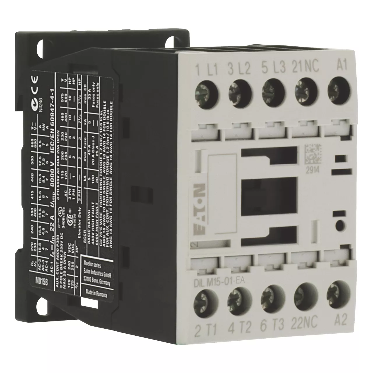 Stycznik, Zastosowanie: Styczniki do silników, Styczniki do 170 A, 3-biegunowy, Kategoria użytkowa: AC-1: Obciążenia nieindukcyjne lub obciążenia o małej indukcyjności, piece oporowe, NAC-3: Standardowe silniki indukcyjne AC: rozruch, wyłączanie w trakcie pracy, AC-4: Stand. silniki indukcyjne AC: rozruch, podłączanie, cofanie, praca spowolnion, Sposób podłączenia: Zaciski śrubowe, Liczba biegunów: 3-biegunowy, Znamionowy prąd roboczy AC-3, 380 V 400 V: Ie = 15,5 A, Znamionowy prąd roboczy AC-1 Prąd cieplny umowny na wolnym powietrzu, 3-biegunowy, 50–60 Hz Otwarcie przy 40°C: Ith =Ie= 22 A, w obudowie: Ith = 18 A, Znamionowy prąd roboczy AC-1 Prąd cieplny umowny na wolnym powietrzu