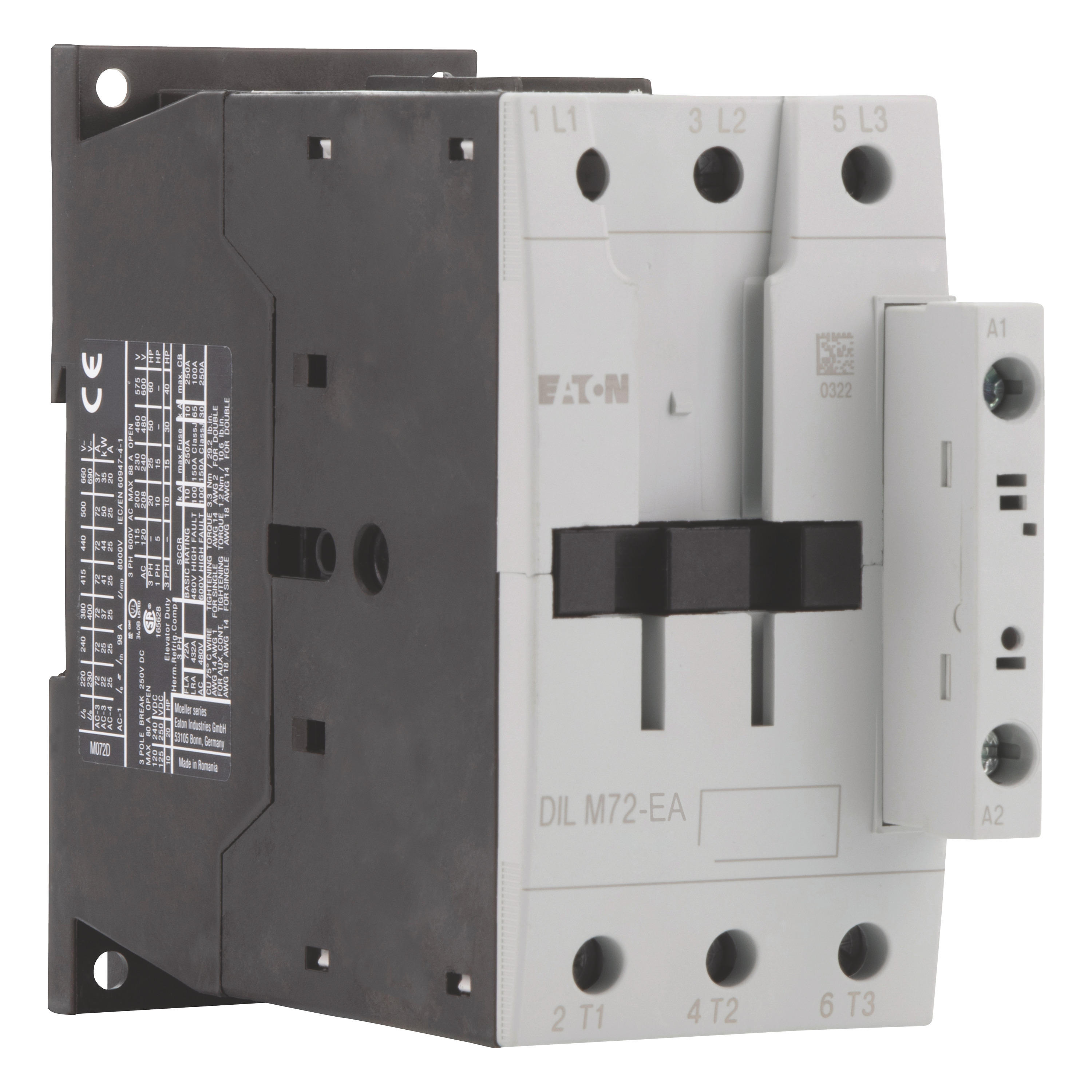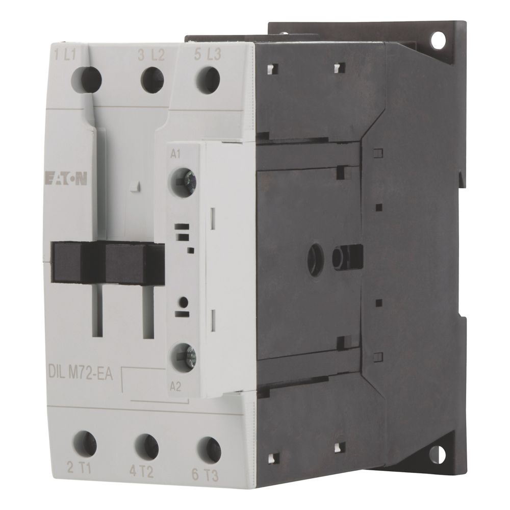 Leistungsschütz, Anwendung: Leistungsschütze für Motoren, Schütze bis 170 A, 3-polig, Gebrauchskategorie: AC-1: Nicht oder leicht induktive Lasten, Widerstandsöfen, NAC-3: Käfigläufermotoren: anlassen, während Betrieb ausschalten, AC-4: Käfigläufermotoren: anlassen, Einstecken, reversieren, Tippen, Anschlusstechnik: Schraubklemmen, Hinweise: Nicht geeignet für Motoren der Effizienzklasse IE3., Anzahl der Pole: 3-polig, Bemessungsbetriebsstrom AC-3, 380 V, 400 V: Ie= 72 A, Bemessungsbetriebsstrom AC-1 konventioneller thermischer Strom, 3-polig, 50 - 60 Hz Offen bei 40 °C: Ith =Ie= 98 A, gekapselt: Ith = 72 A