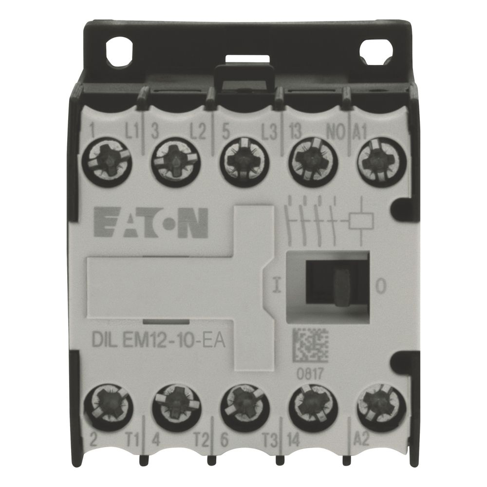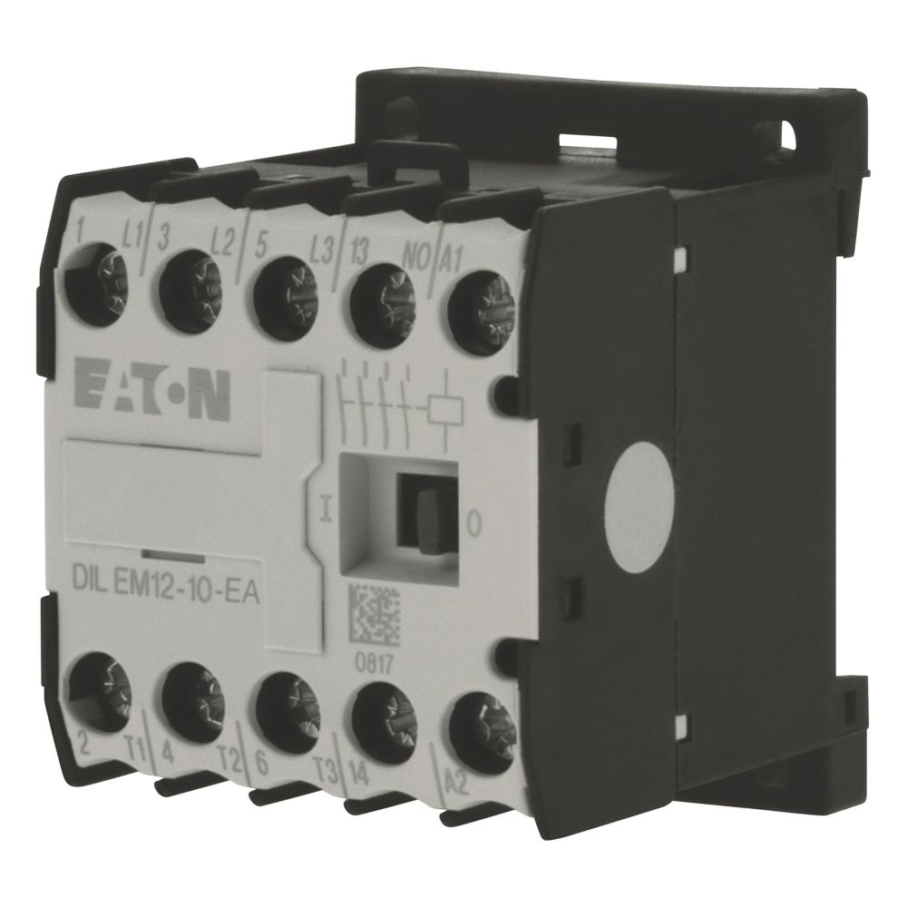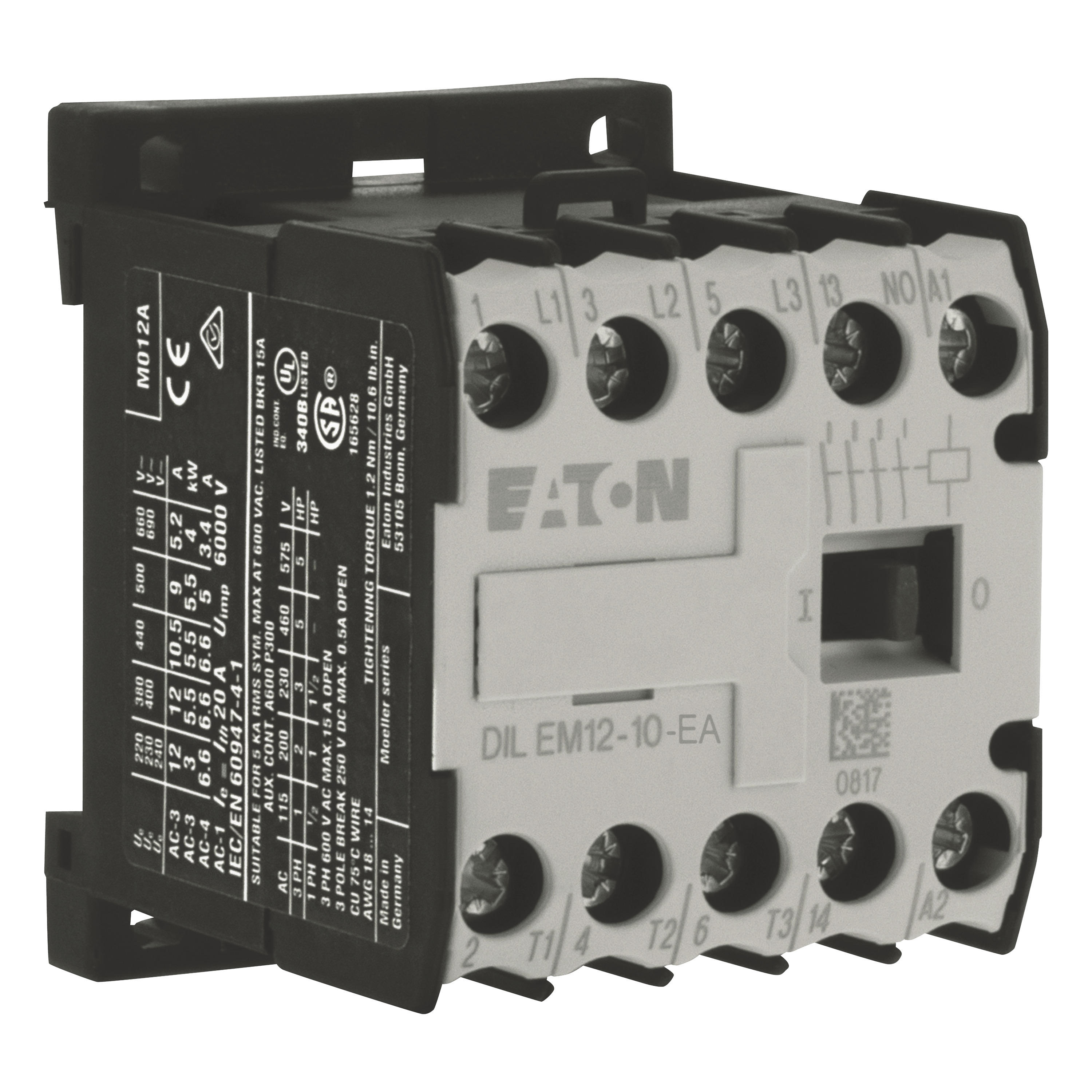 Stycznik, Zastosowanie: Styczniki do silników, Styczniki miniaturowe do silników i obciążeń rezystancyjnych, Styczniki DILEM, Kategoria użytkowa: AC-1: Obciążenia nieindukcyjne lub obciążenia o małej indukcyjności, piece oporowe, NAC-3: Standardowe silniki indukcyjne AC: rozruch, wyłączanie w trakcie pracy, AC-4: Stand. silniki indukcyjne AC: rozruch, podłączanie, cofanie, praca spowolnion, Sposób podłączenia: Zaciski śrubowe, Opis: Ze stykiem pomocniczym, Liczba biegunów: 3-biegunowy, Znamionowy prąd roboczy AC-3, 380 V 400 V: Ie = 12 A, Znamionowy prąd roboczy AC-1 Prąd cieplny umowny na wolnym powietrzu, 3-biegunowy, 50–60 Hz Otwarcie przy 40°C: Ith =Ie= 22 A, w obudowie: Ith = 16 A