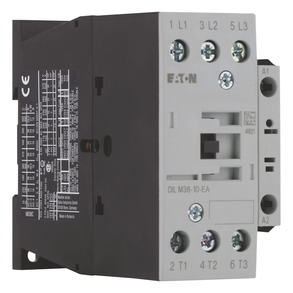 Stycznik, Zastosowanie: Styczniki do silników, Styczniki do 170 A, 3-biegunowy, Kategoria użytkowa: AC-1: Obciążenia nieindukcyjne lub obciążenia o małej indukcyjności, piece oporowe, NAC-3: Standardowe silniki indukcyjne AC: rozruch, wyłączanie w trakcie pracy, AC-4: Stand. silniki indukcyjne AC: rozruch, podłączanie, cofanie, praca spowolnion, Sposób podłączenia: Zaciski śrubowe, Uwagi: Nie nadaje się do silników o klasie sprawności IE3., Liczba biegunów: 3-biegunowy, Znamionowy prąd roboczy AC-3, 380 V 400 V: Ie = 38 A, Znamionowy prąd roboczy AC-1 Prąd cieplny umowny na wolnym powietrzu, 3-biegunowy, 50–60 Hz Otwarcie przy 40°C: Ith =Ie= 45 A, w obudowie: Ith= 36 A