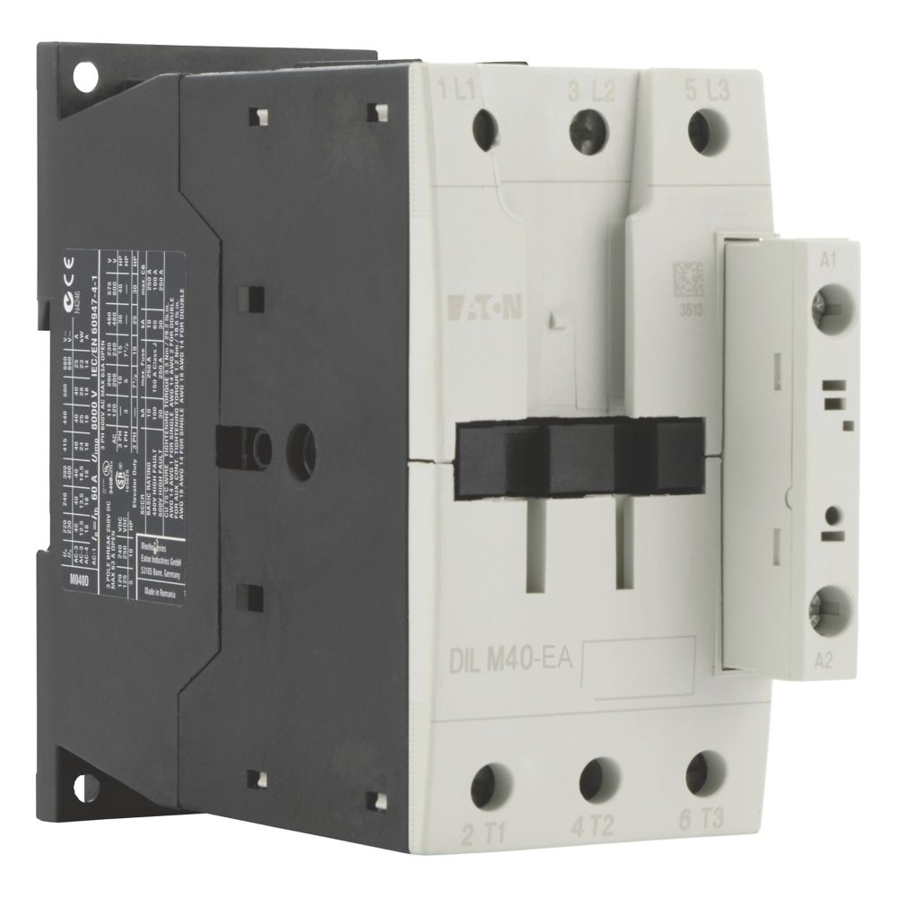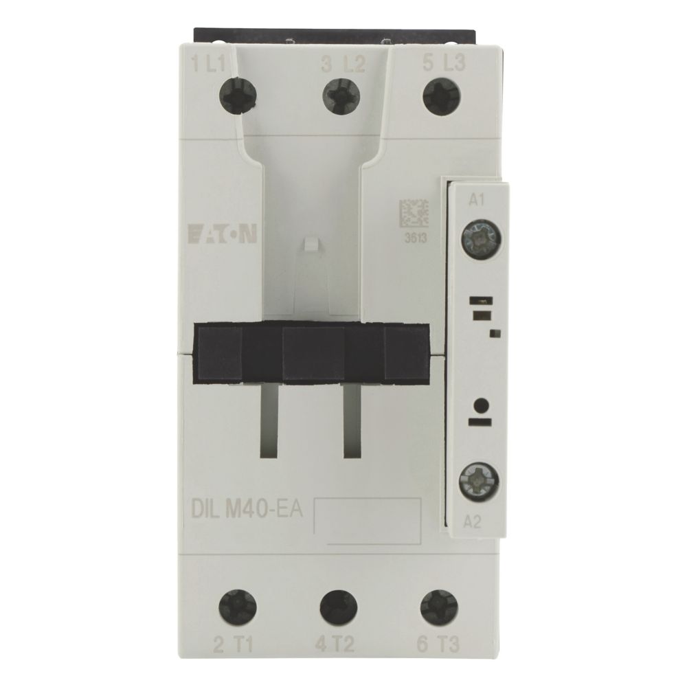 Stycznik, Zastosowanie: Styczniki do silników, Styczniki do 170 A, 3-biegunowy, Kategoria użytkowa: AC-1: Obciążenia nieindukcyjne lub obciążenia o małej indukcyjności, piece oporowe, NAC-3: Standardowe silniki indukcyjne AC: rozruch, wyłączanie w trakcie pracy, AC-4: Stand. silniki indukcyjne AC: rozruch, podłączanie, cofanie, praca spowolnion, Sposób podłączenia: Zaciski śrubowe, Uwagi: Odpowiednie również dla silników o klasie sprawności IE3., Urządzenia spełniające normy IE3 są oznaczone odpowiednim logo na opakowaniu., Liczba biegunów: 3-biegunowy, Znamionowy prąd roboczy AC-3, 380 V 400 V: Ie= 40 A, Znamionowy prąd roboczy AC-1 Prąd cieplny umowny na wolnym powietrzu, 3-biegunowy