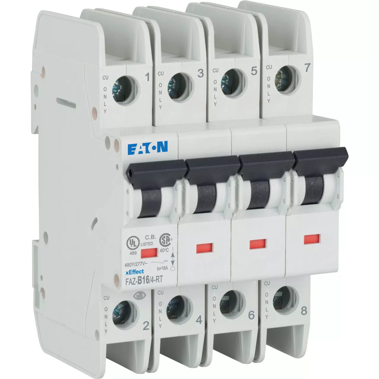 Hoogwaardige installatieautomaat, conform UL 489, CSA C22.2 nr. 5 en ook IEC 60947-2 norm, voor toepassingen, die zijn toegestaan voor UL 1077 of CSA C22.2 nr. 235, hulpschakelaar en spanningsschakelaars geschikt voor latere installatie, met verwijderbare klemschroeven voor gebruik met ring-kabelschoen, Contactstandindicator rood-groen, eenvoudige montage op DIN-rail