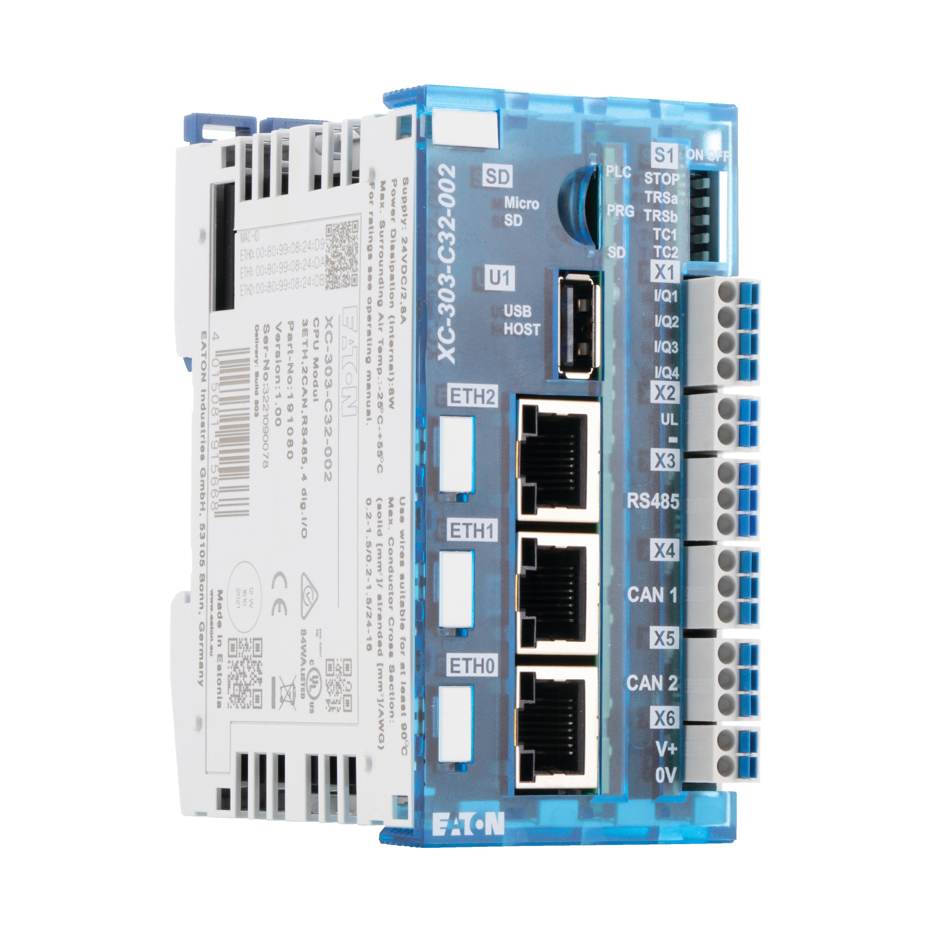 Z XC-303, Firma Eaton oferuje wydajny i elastyczny system sterowania, który w połączeniu z kompaktowym systemem we/wy XN300 i nowatorskim panelem wielodotykowym XV300 umożliwia producentom maszyn i urządzeń uzyskanie prostego i nowoczesnego systemu automatyki. Interfejsy Ethernet umożliwiające połączenie z różnymi sieciami oraz standardowe interfejsy CAN i RS485 rozszerzają funkcje urządzenia XC-303, zapewniając uniwersalny punkt danych i komunikacji dla urządzeń sieciowych. Kompaktowy sterownik komunikacyjny można zaprogramować w systemie CODESYS 3