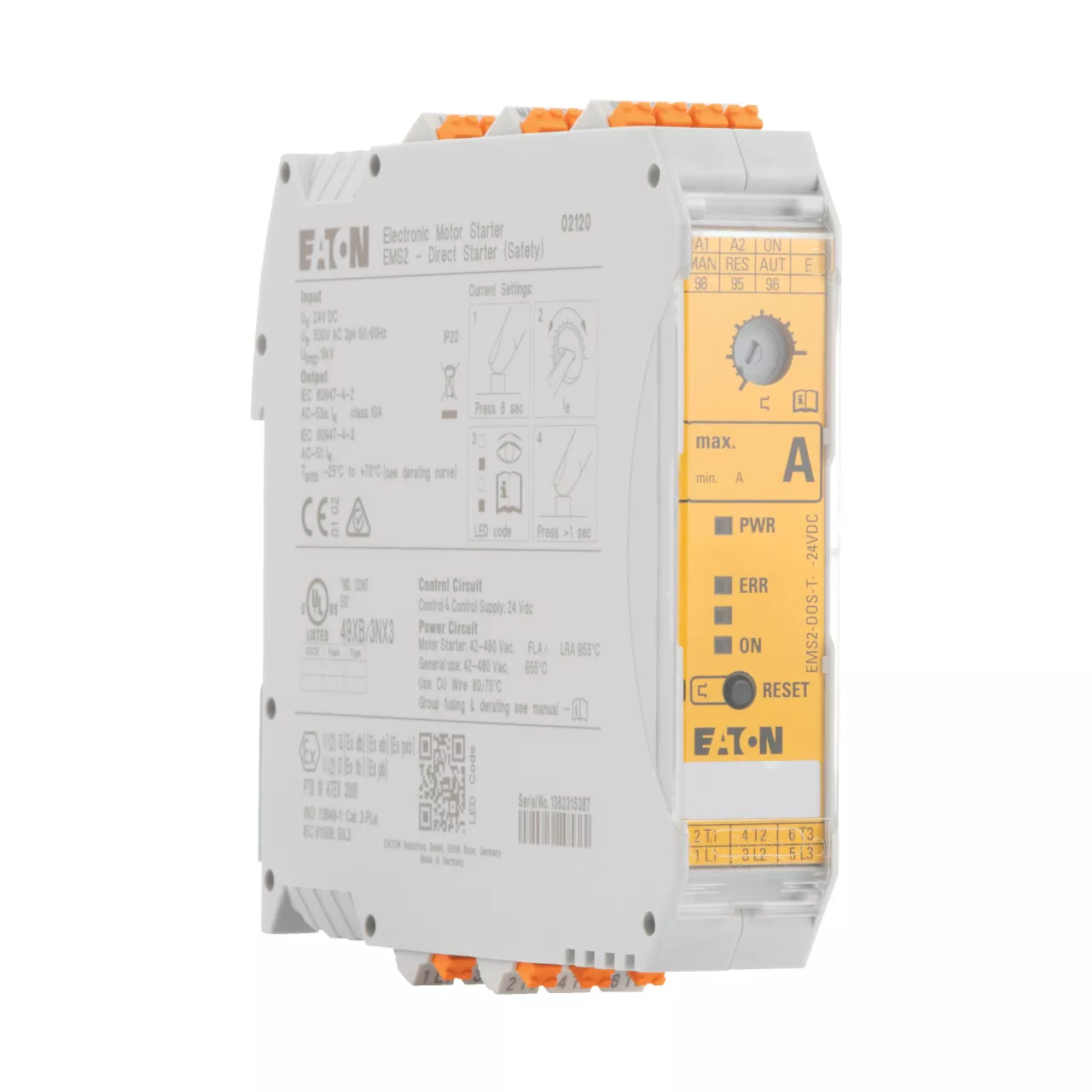 Rozruszniki bezpośredni, Zacisk śrubowy: Elektroniczny rozrusznik silnikowy, Opis: Rozrusznik DOL, Zabezpieczenie silnikowe, Aktor zatrzymania awaryjnego, Konstrukcja obwodu: bezpieczny stan wyjścia z obejściem, rozłącznik trójfazowy., Zgodność, Aprobata ochrony przeciwwybuchowej (zgodnie z ATEX 94/9/EC): II (2) G [Ex e] [Ex d] [Ex px], II (2) D [Ex t] [Ex p], Zgodność, Aprobata certyfikacji testu prototypu-EC PTB 13 ATEX 3003, maks. moc znamionowa dla trójfazowych silników, 50–60 Hz AC-53a 380 V 400 V 415 V: P = 0,55 – 3 kW, Zakres nastawczy wyzwalaczy przeciążeniowych: Ir = 1,5 – 9 A_x, Napięcie sterujące: 24 V DC, Sposób podłączenia: Zaciski sprężynowe wtykowe
