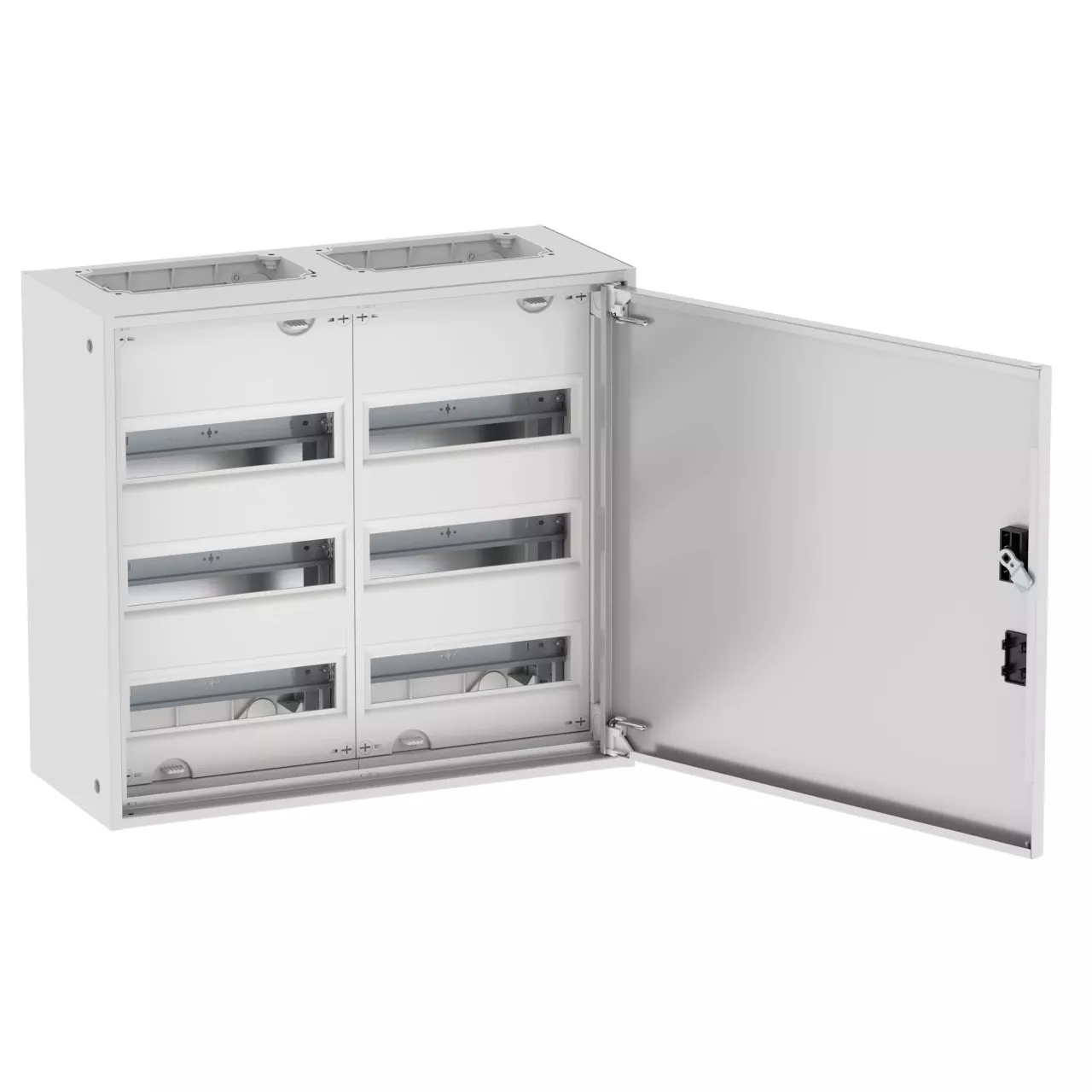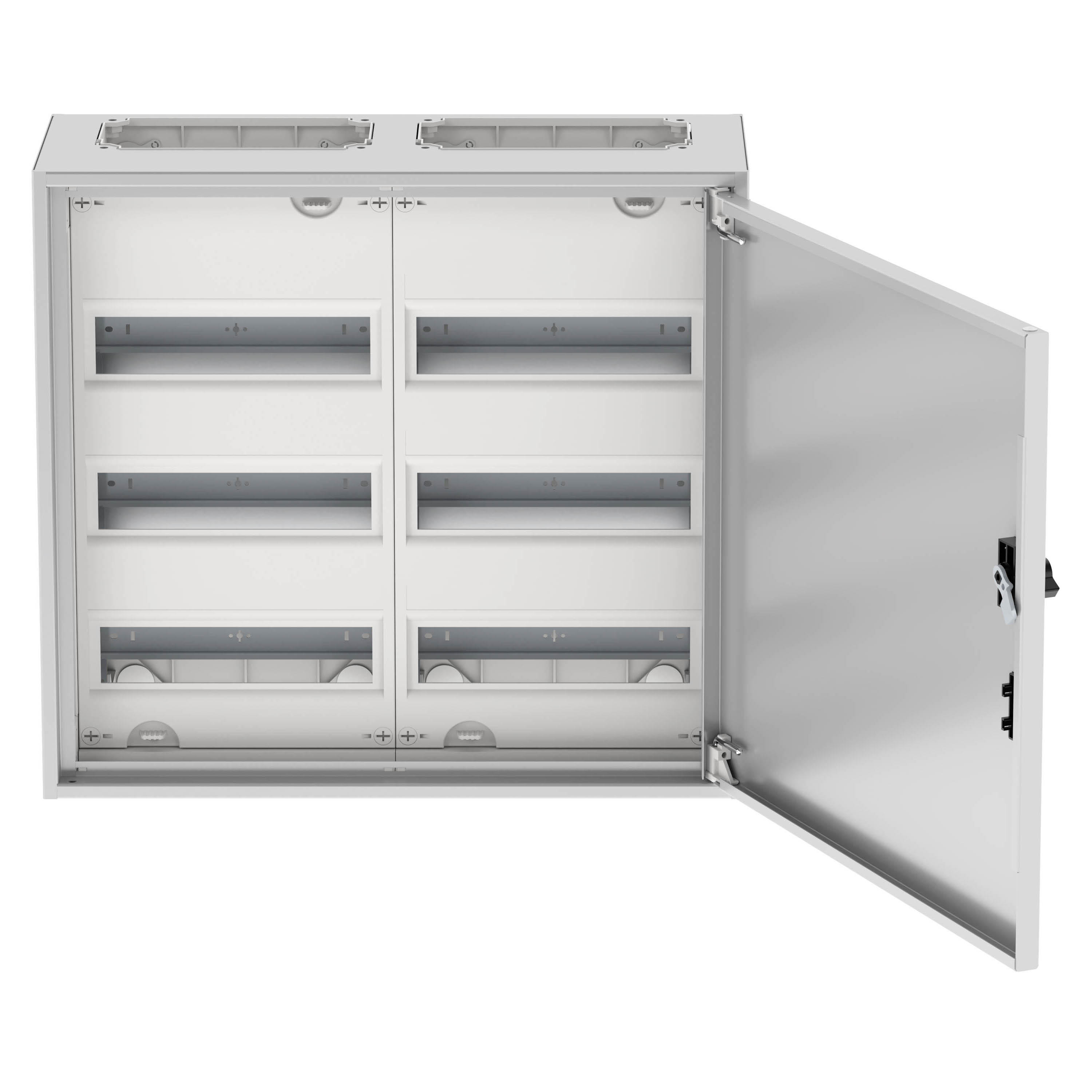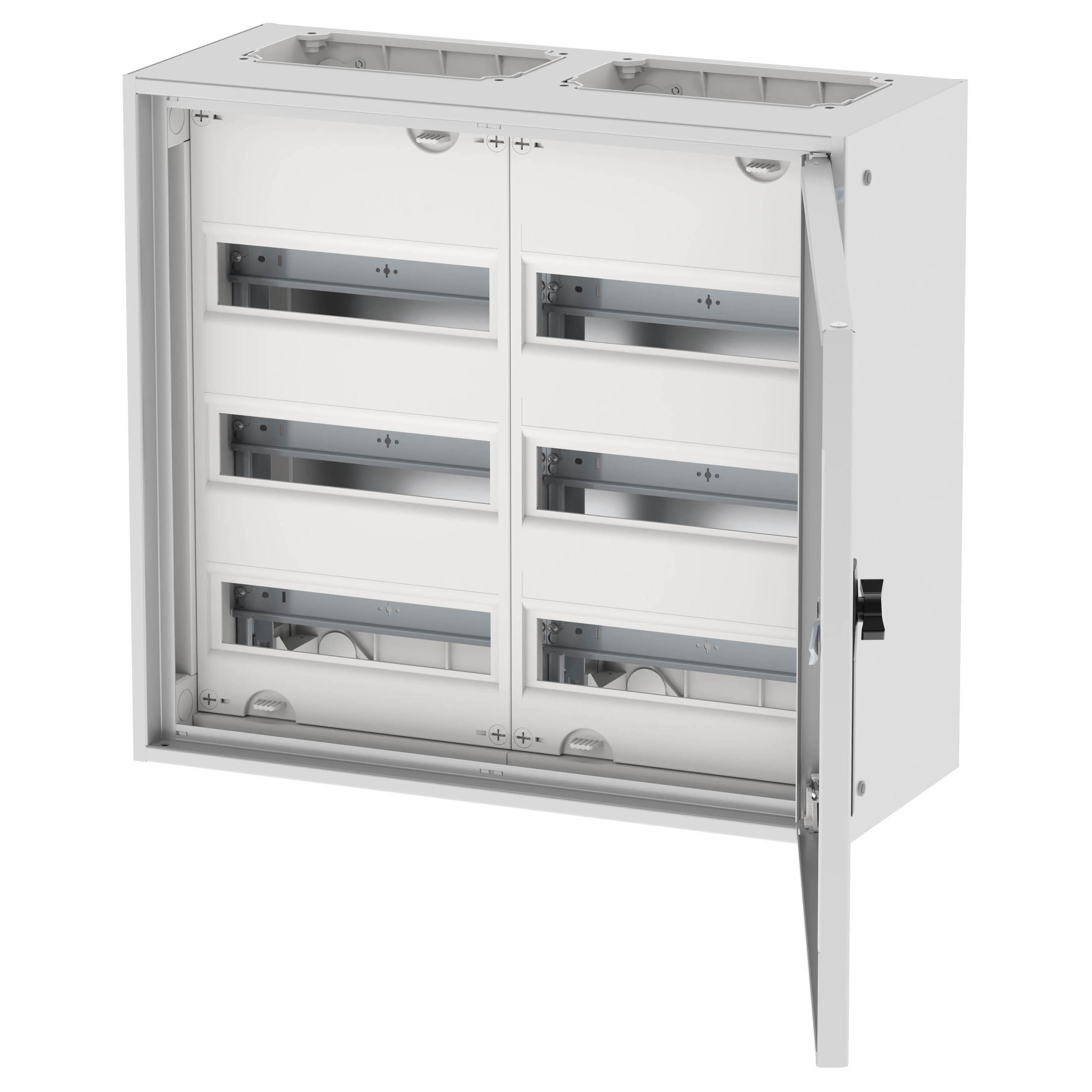 Wandgehäuse EWK inklusive Normeinbaueinheiten, 72 TE für modulare DIN-Geräte, Schutzhaube aus Kunststoff, Tragschienen aus verzinktem Qualitätsstahl, Kompakte Gehäuseabmessungen mit Tiefe von nur 230 mm, Bemessungsbetriebsstrom max. 160 A, zur Direktmontage an der Wand, IP31 Schutzart nach IEC/EN 62208, Schutzklasse 2, schutzisoliert, Verstellbare Scharniere für einfachen Wechsel des Türanschlages, sehr robust, Tür 1-flügelig, 1 Riegel, Leitungseinführung möglich per F3A-2K Flansch (nicht im Lieferumfang enthalten), inklusive N-Klemme: 2x (6x2,5–16 mm² + 21x1,5–4 mm²), inklusive PE-Klemme: 2x (6x2,5–16 mm² + 21x1,5–4 mm²), Farbe: weiß, RAL 9016
