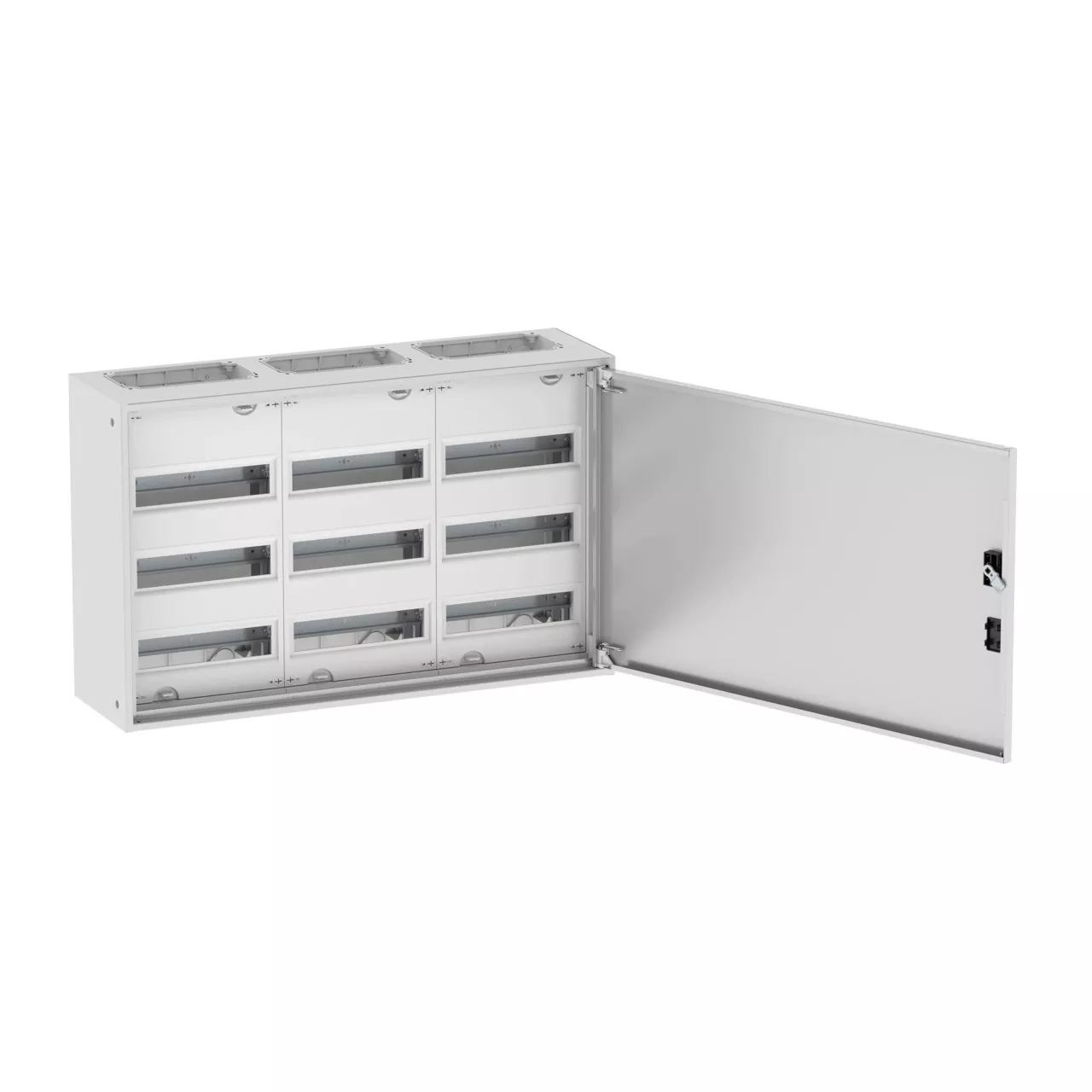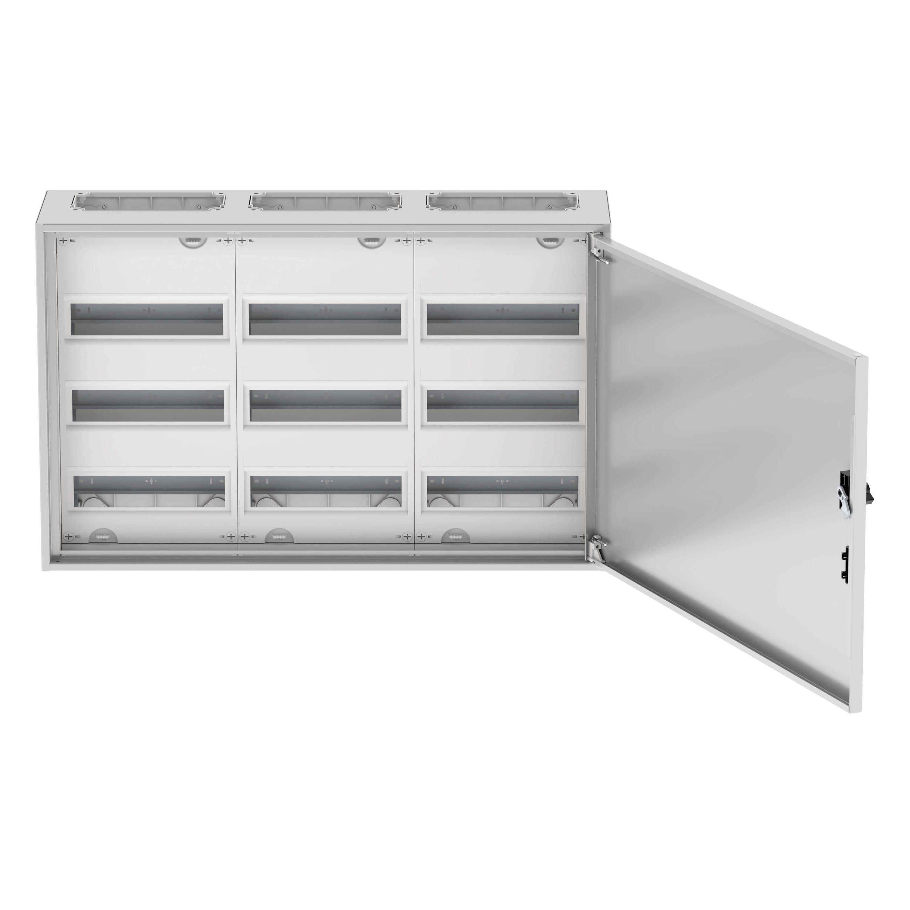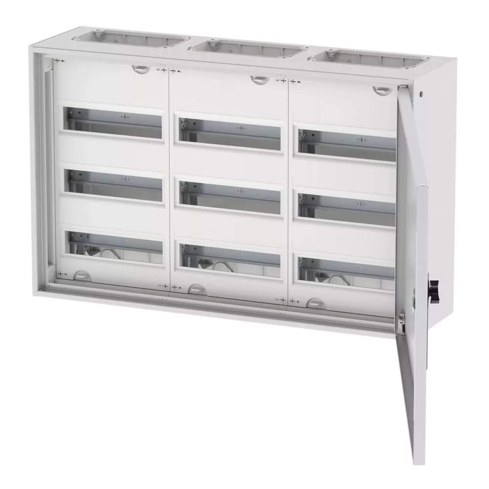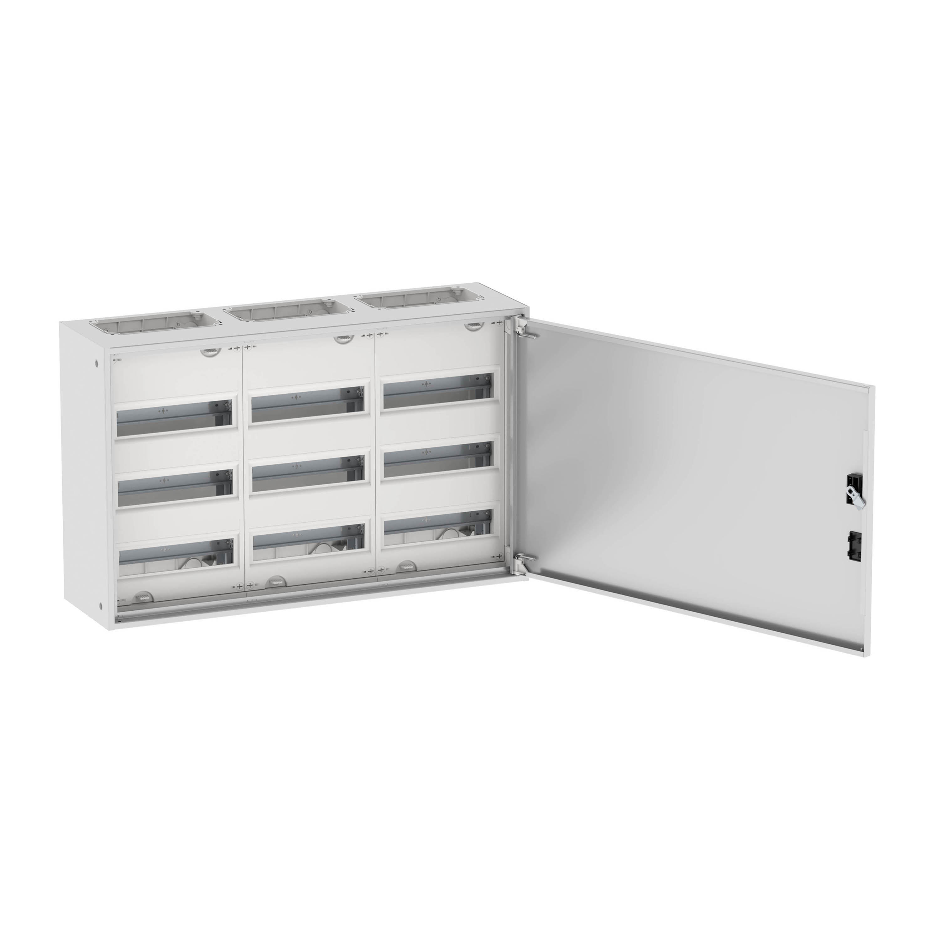 Wandgehäuse EWK inklusive Normeinbaueinheiten, 108 TE für modulare DIN-Geräte, Schutzhaube aus Kunststoff, Tragschienen aus verzinktem Qualitätsstahl, Kompakte Gehäuseabmessungen mit Tiefe von nur 230 mm, Bemessungsbetriebsstrom max. 160 A, zur Direktmontage an der Wand, IP31 Schutzart nach IEC/EN 62208, Schutzklasse 2, schutzisoliert, Verstellbare Scharniere für einfachen Wechsel des Türanschlages, sehr robust, Tür 1-flügelig, 1 Riegel, Leitungseinführung möglich per F3A-2K Flansch (nicht im Lieferumfang enthalten), inklusive N-Klemme: 3x (6x2,5–16 mm² + 21x1,5–4 mm²), inklusive PE-Klemme: 3x (6x2,5–16 mm² + 21x1,5–4 mm²), Farbe: weiß, RAL 9016
