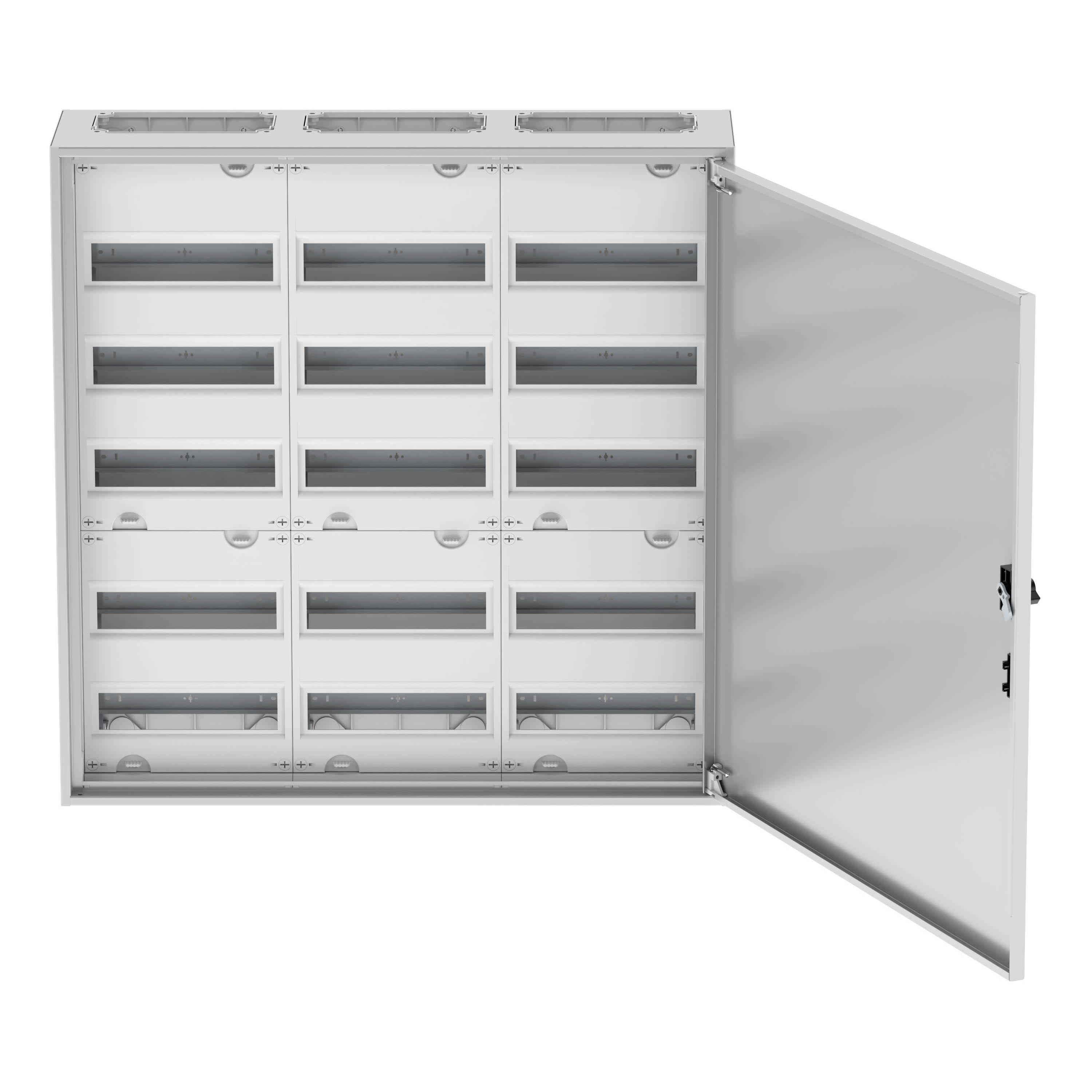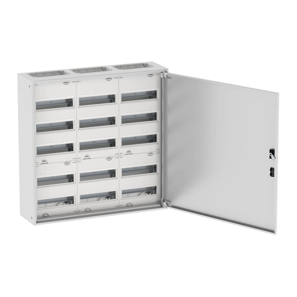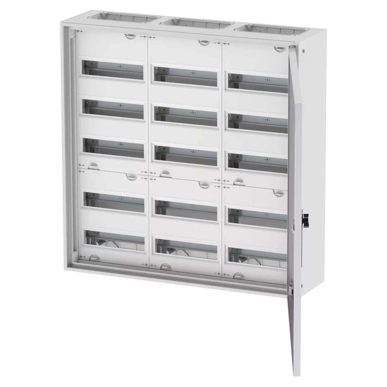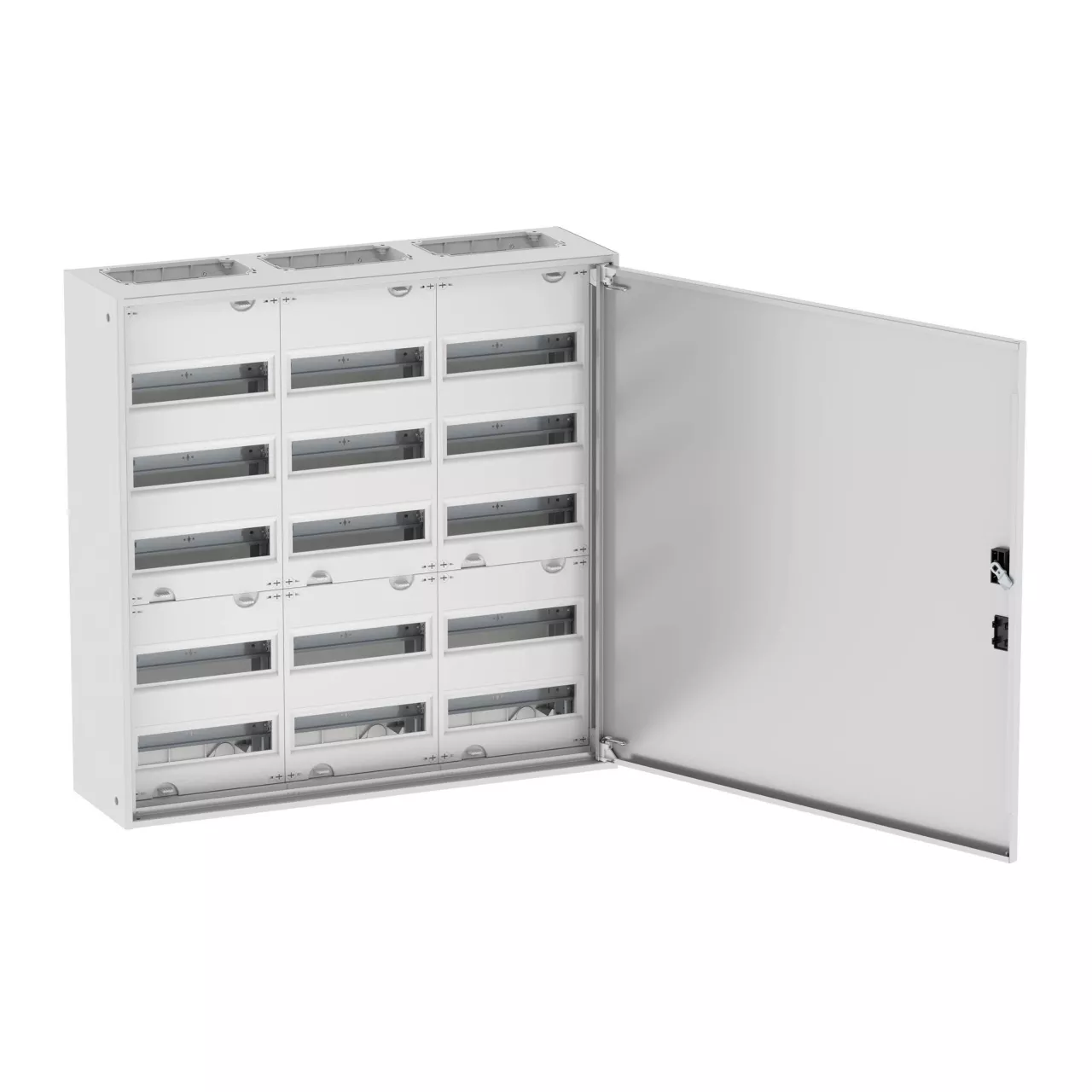 Wandgehäuse EWK inklusive Normeinbaueinheiten, 180 TE für modulare DIN-Geräte, Schutzhaube aus Kunststoff, Tragschienen aus verzinktem Qualitätsstahl, Kompakte Gehäuseabmessungen mit Tiefe von nur 230 mm, Bemessungsbetriebsstrom max. 160 A, zur Direktmontage an der Wand, IP31 Schutzart nach IEC/EN 62208, Schutzklasse 2, schutzisoliert, Verstellbare Scharniere für einfachen Wechsel des Türanschlages, sehr robust, Tür 1-flügelig, 1 Riegel, Leitungseinführung möglich per F3A-2K Flansch (nicht im Lieferumfang enthalten), inklusive N-Klemme: 3x (6x2,5–16 mm² + 21x1,5–4 mm²), inklusive PE-Klemme: 3x (6x2,5–16 mm² + 21x1,5–4 mm²), Farbe: weiß, RAL 9016