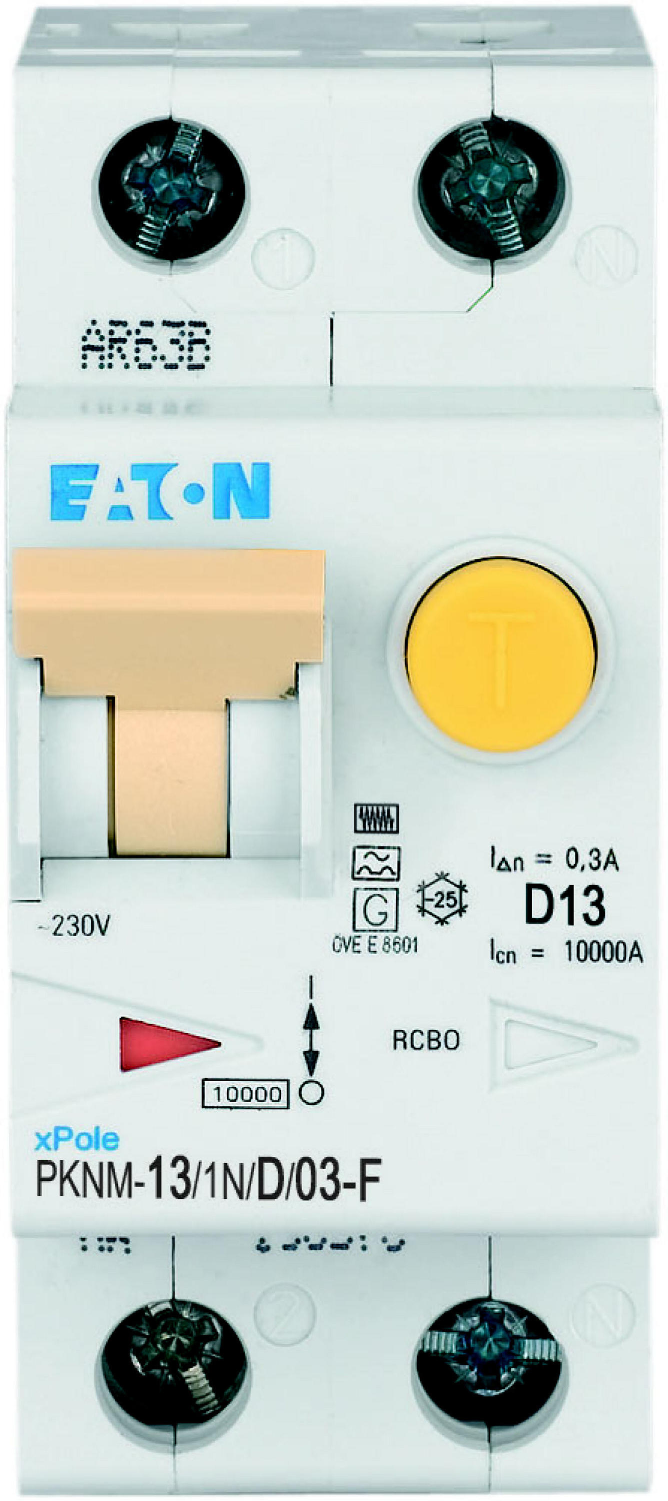 PKNM-13/1N/D/03-F-MW Wyłącznik kombinowany 10kA, In=13A, IΔN=0,3A, char. D, Typ F, 1+N bieg. Seria PKNM
