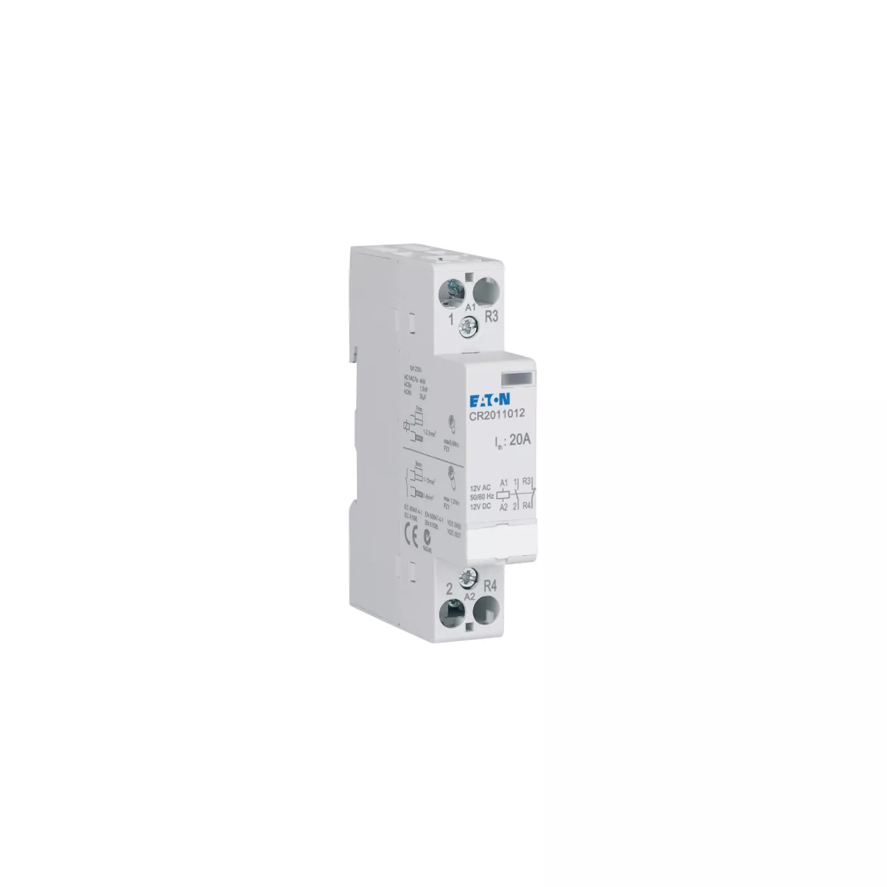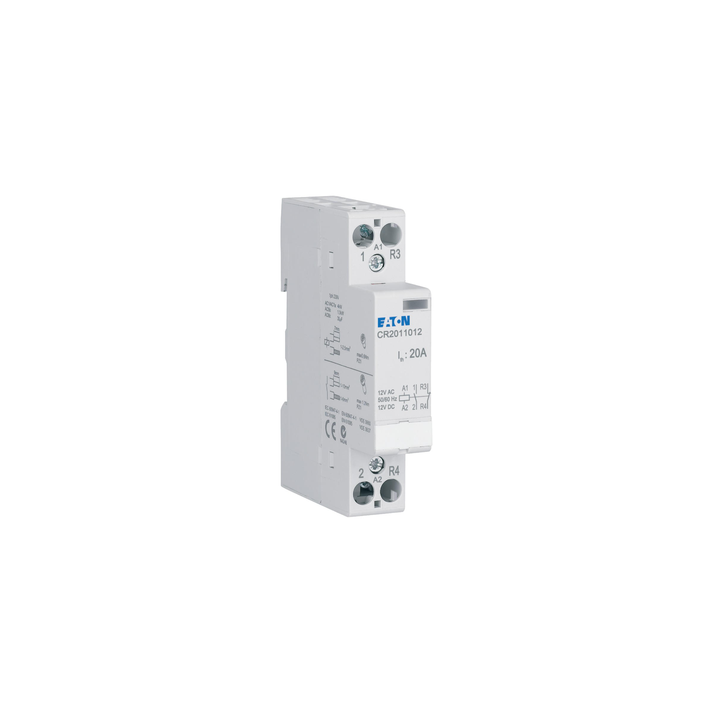 Installatie magneetschakelaar, nominale spanning stuurcircuit 12 V AC/DC, nominale bedrijfsstroom bij AC1 20 A, functie: 1 no + 1 nc, details volgens IEC/EN 61095, IEC/EN 60947-4-1, standaardafmeting voorkant 45 mm, montagebreedte 1 MU, DIN-rail montage