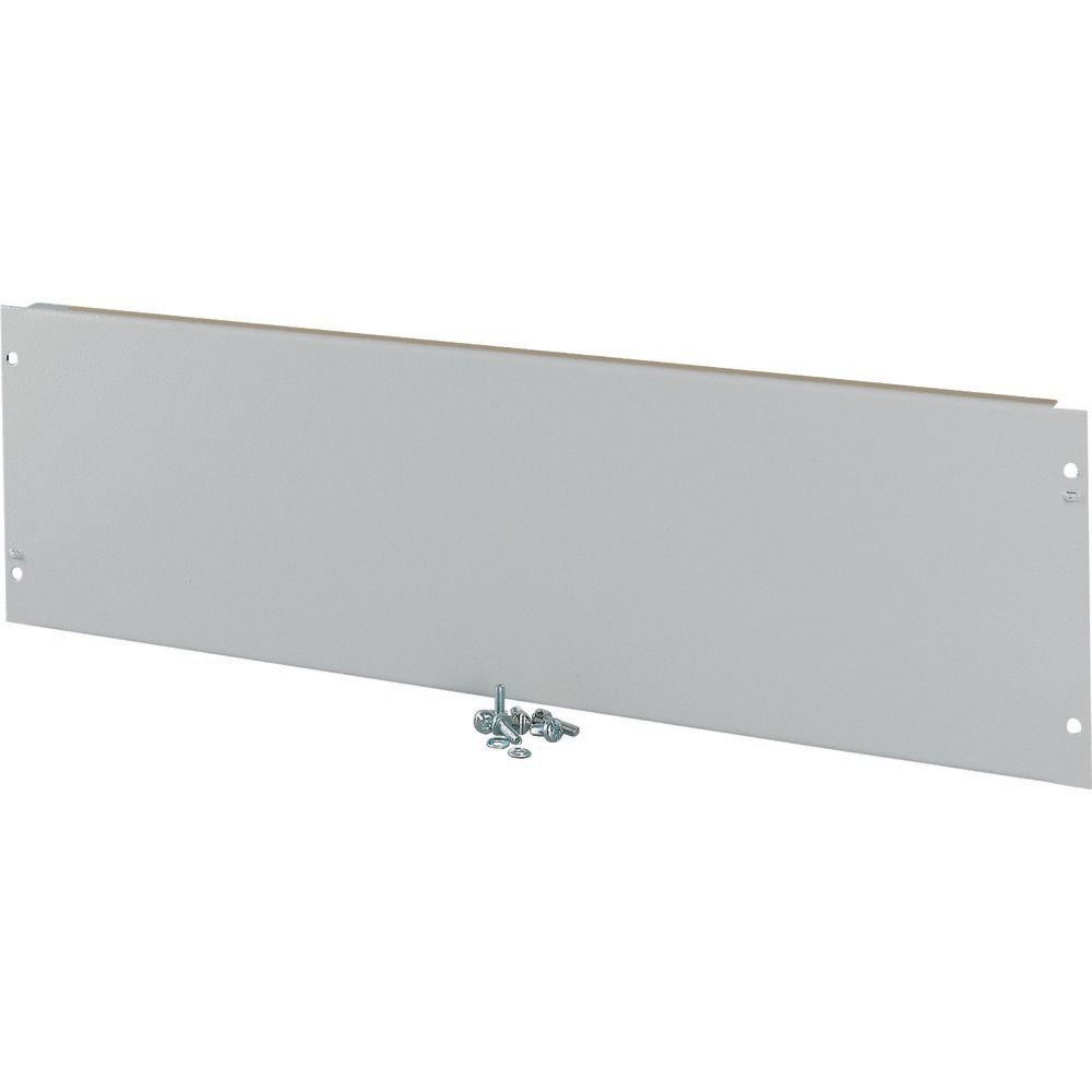 Installations-Verteiler-System – Profi Plus (Standverteiler, Aufputz- und Unterputzverteiler). Frontblindplatte, BPZ-FP-..-BL, wird zur Abdeckung von Reserveflächen und zum Schutz von ungenutzten Bereichen benötigt Breite 400 mm, Höhe 150 mm, Stahlblech, pulverbeschichtet, RAL7035, Metallfrontplatte mit elektrischem Kontakt mit Gehäuse, Lieferumfang: 1 Frontplatte