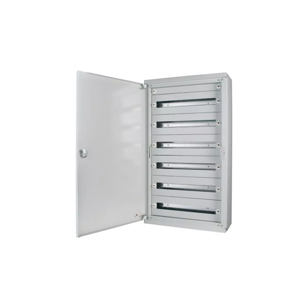 Aufputz-Installationsverteiler mit Drehriegel – vollständig montiert, IP30, weiß, RAL 9016, Breite 400 mm, Außenhöhe = 1060 mm, 78 HP, 6-reihig, inkl. Grundrahmen, Seitenwände, Boden/Dach-Paneele und Tür, enthält BPZ-DINR… DIN-Schienen-Sätze, enthält Frontplatten (150 mm) mit Geräteausschnitt (45 mm), einschließlich Kabelführung oben, mit Durchsteckflansch, mit Boden-Paneele blind, auf Grundrahmen befestigt – kein Montagesatz MSW, Moduldesign, geerdete Metallabdeckungen, vollständig montiert, anreihbar, großzügiger Verdrahtungsraum, variabler Innenausbau mit oder ohne herausnehmbarem Montagerahmen, gut strukturierte