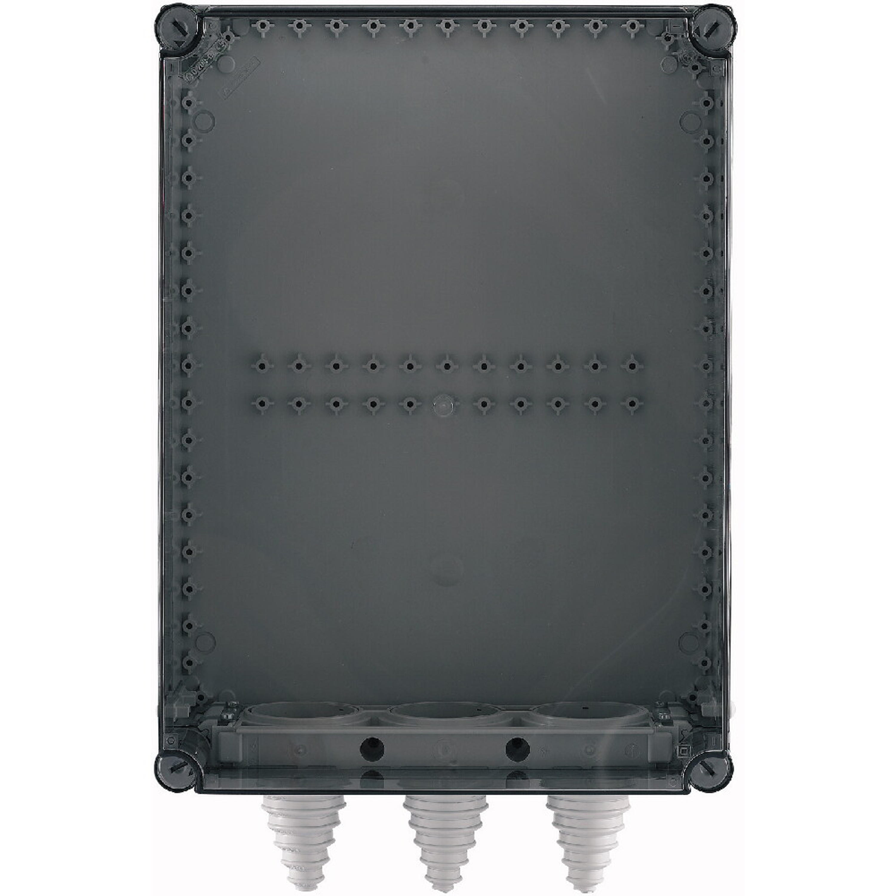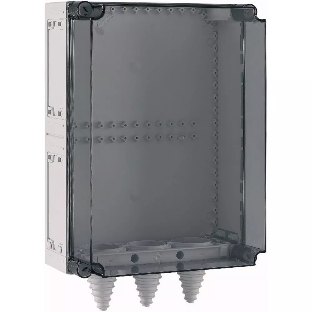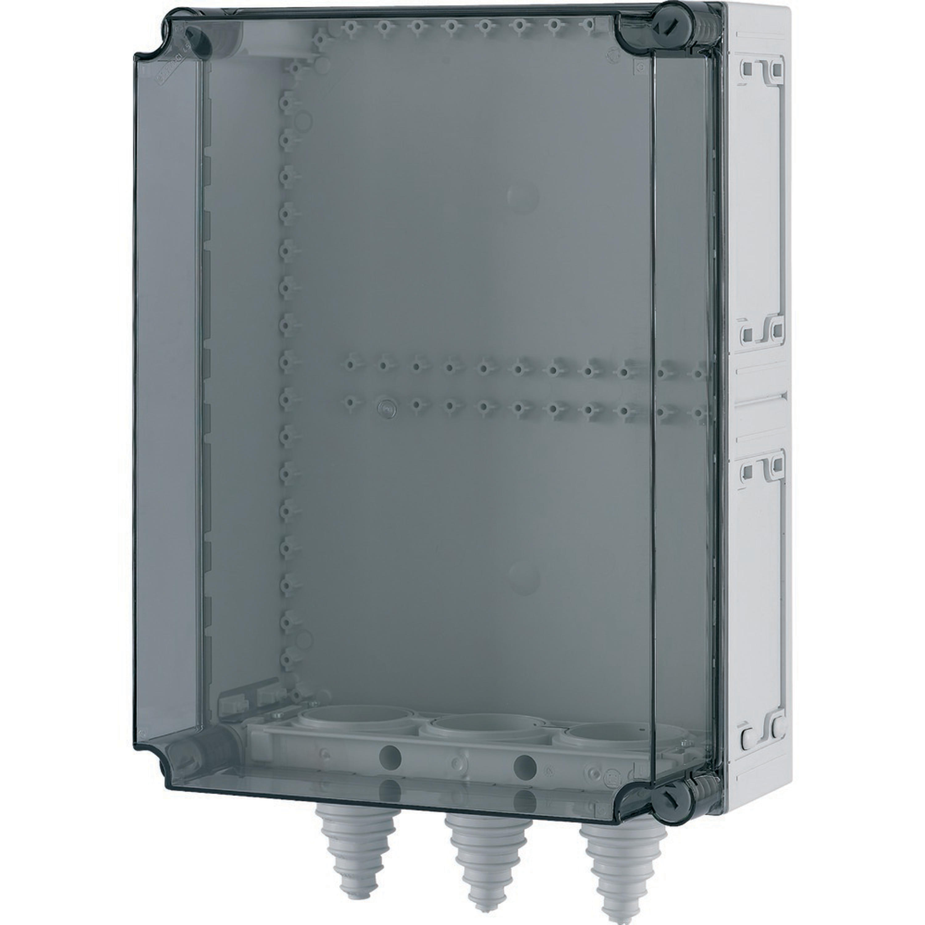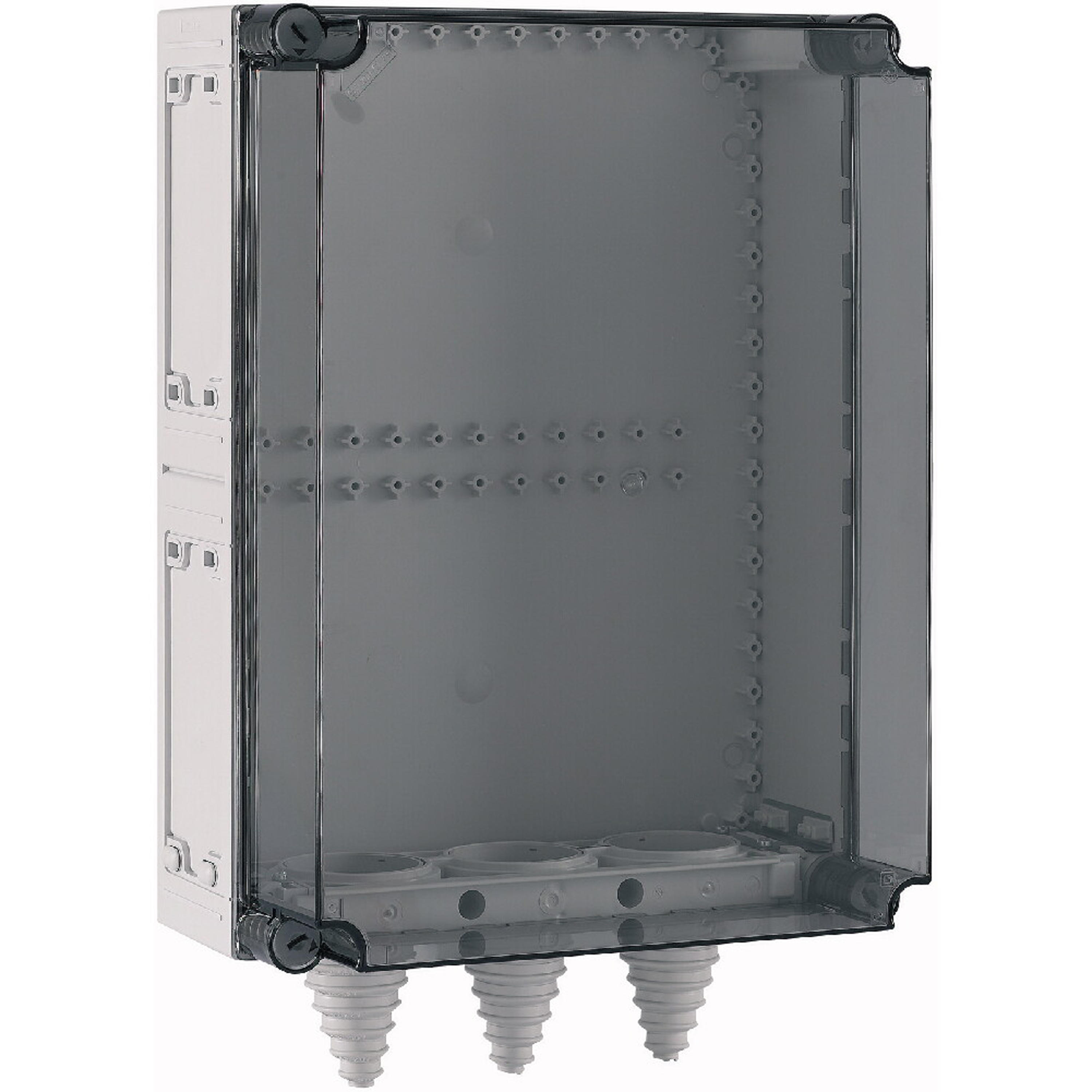 Basisgehäuse Stromverteiler mit montierten Kabelstutzen, Material: Polycarbonat, schlagfest, Schutzart IP65, patentierter Deckelverschluss mit integriertem Überdruckausgleich, Gehäuseseitenwände geschlossen, ausschlagbar, Wände oben oder unten offen, Leitungen von vorne einlegbar durch geteilte Kabelschellen, plombierbare Deckelverschlüsse, Grau (Sockel), transparent (Deckel), Einbautiefe bei Montageplatte=200mm, Abdeckungstyp: transparent, Ausführung Unterteil: oben offen unten Kabelstutzen