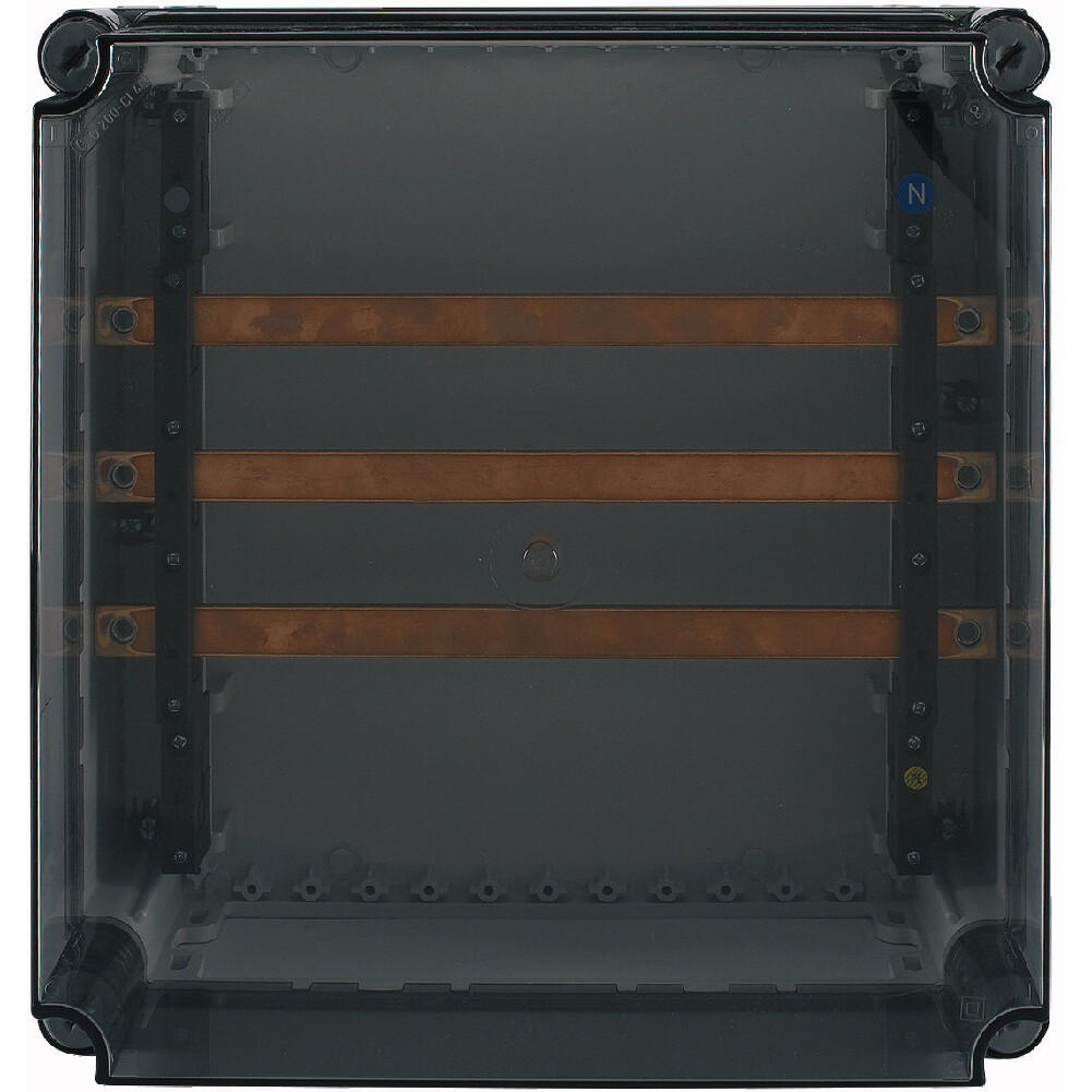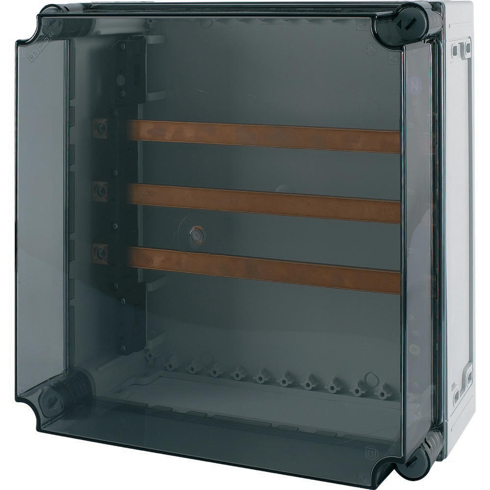 Sammelschienengehäuse mit transparentem Deckel, 3-polig, 250 A, Träger inklusive für N+PE zum Nachrüsten, mit Kupferschienen L1/L2/L3: 20 x 5 mm, N: ohne, PE: ohne, ohne Klemmen, für die individuelle Befestigung