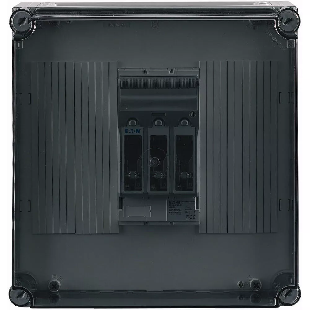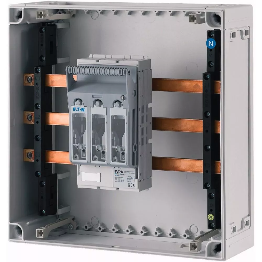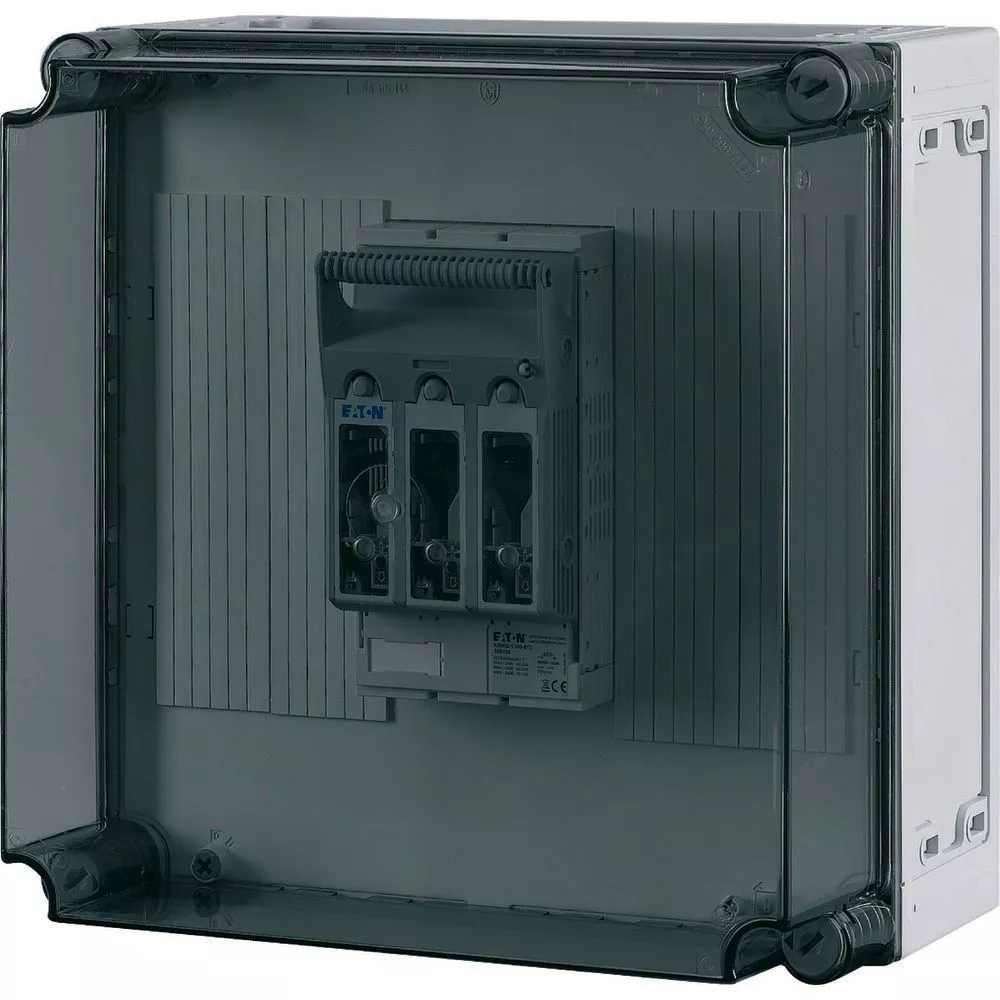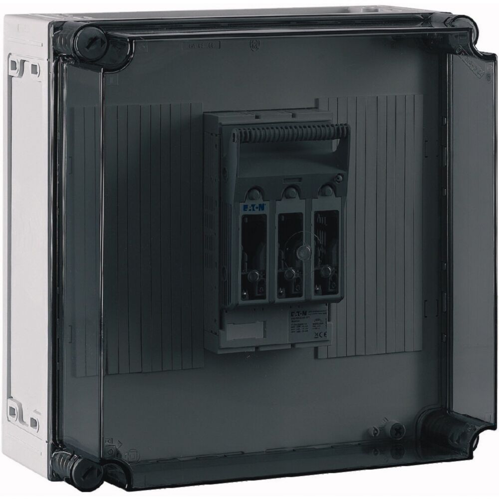 NH-Verteilerschrank mit transparentem Deckel, 1x Schaltanlage NH00 auf Sammelschienensystem 250 A, 3-polig, Träger inklusive für N+PE zum Nachrüsten, mit Kupferschienen L1/L2/L3: 20 x 5 mm, N: ohne, PE: ohne, ohne Klemmen