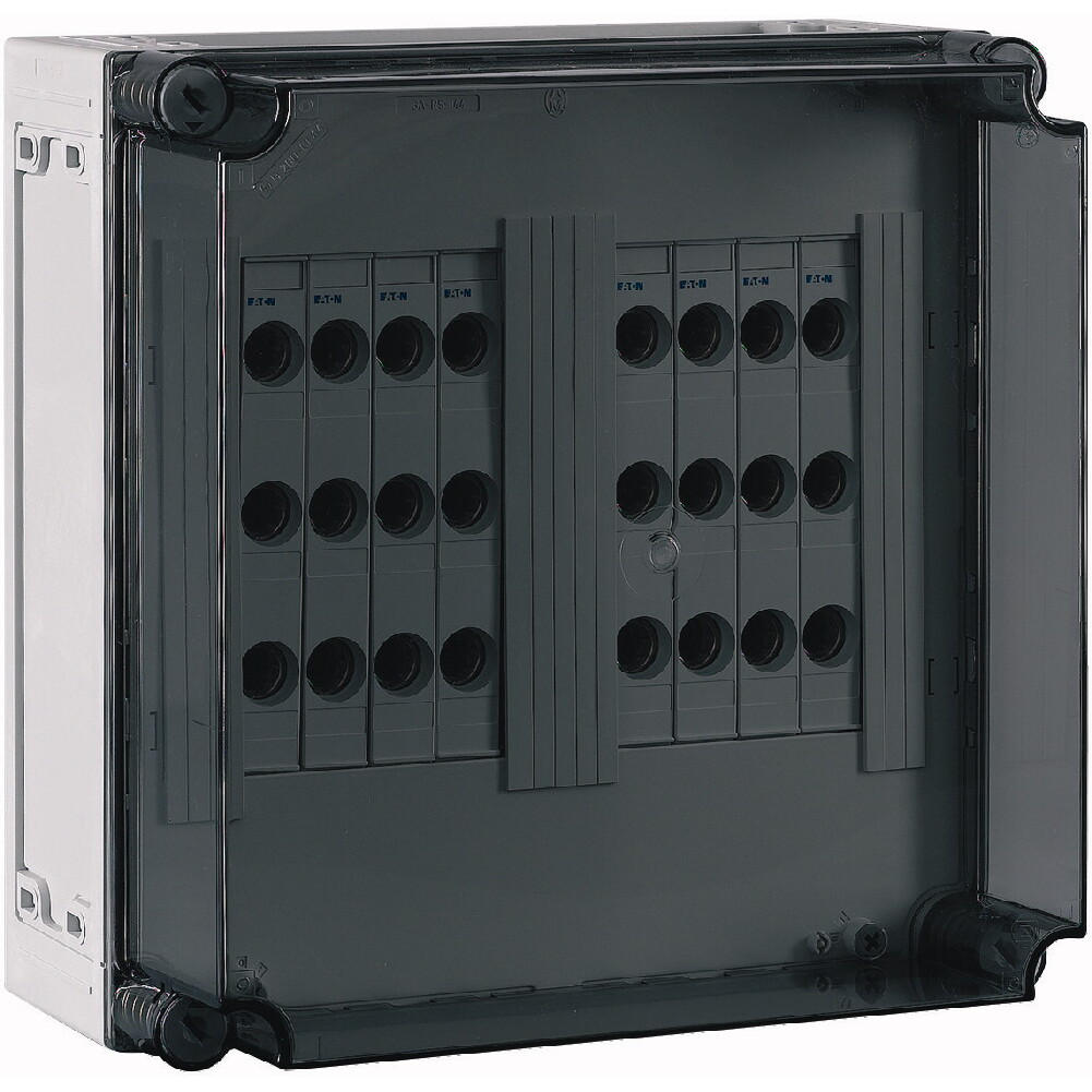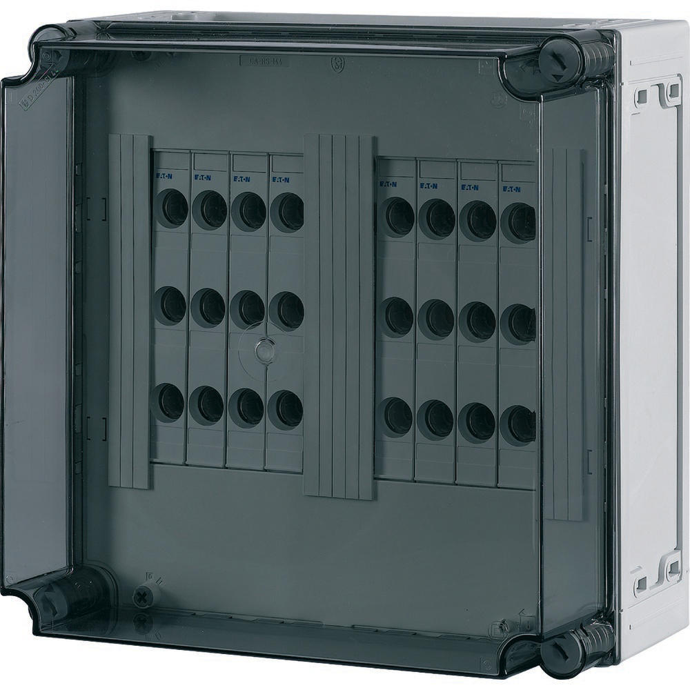 D02 Verteilerschrank mit transparentem Deckel, 8x D02-Reiter-Sicherungssockel auf Sammelschienensystem 250 A, 3-polig, Träger inklusive für N+PE zum Nachrüsten, mit Kupferschienen L1/L2/L3: 20 x 5 mm, N: ohne, PE: ohne, ohne Klemmen, Sicherungsgerät ohne Sicherungen und Schraubkappen.