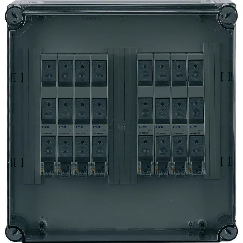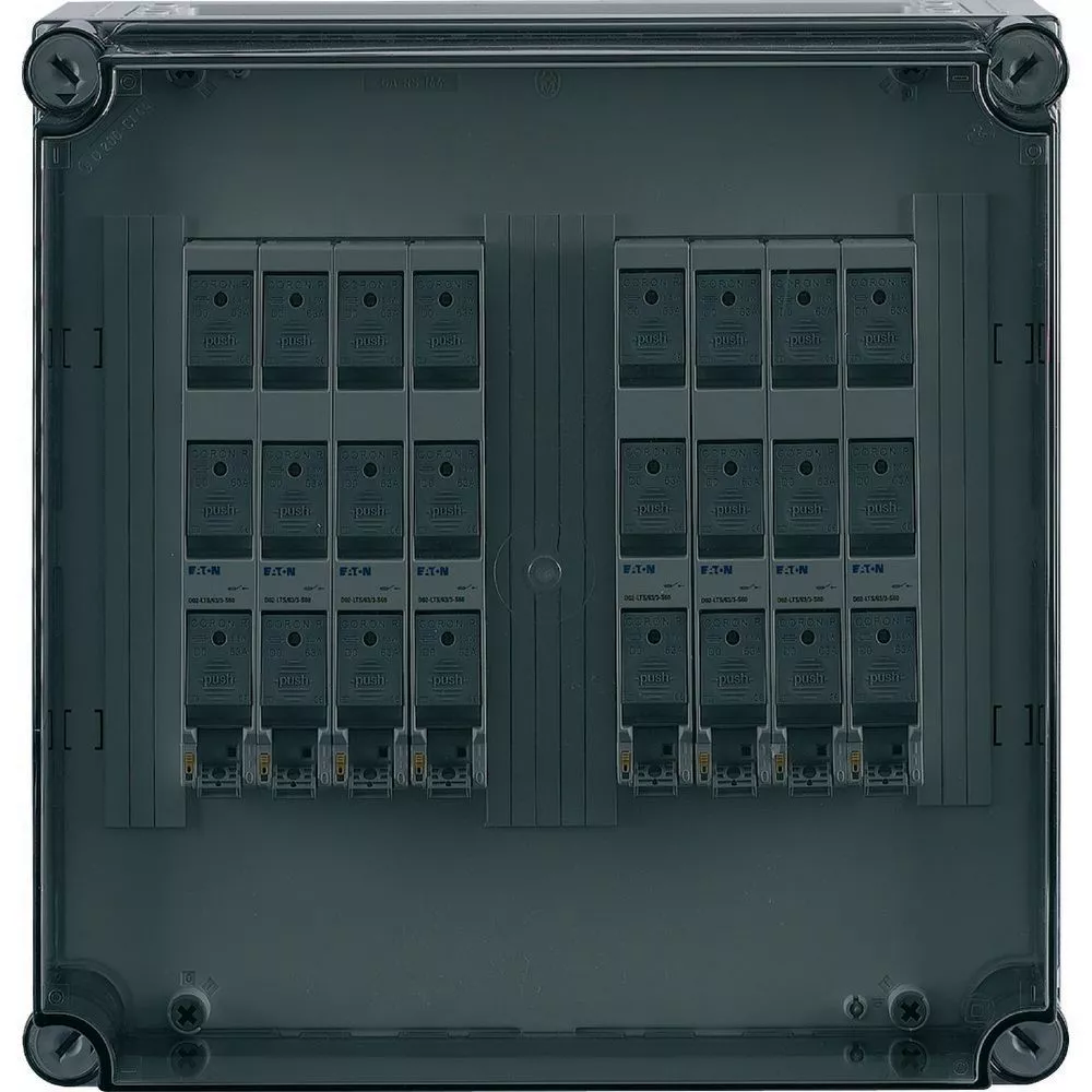 D02 Verteilerschrank mit transparentem Deckel, 8x D02 Lasttrennschalter auf Sammelschienensystem 400 A, 3-polig, Träger inklusive für N+PE zum Nachrüsten, mit Kupferschienen L1/L2/L3: 20 x 10 mm, N: ohne, PE: ohne, ohne Klemmen, Sicherungsgerät mit Schubladen und Blinkfunktion, ohne Schmelzsicherungen.