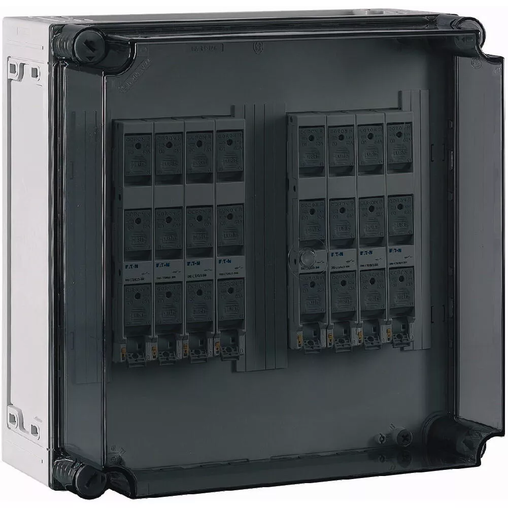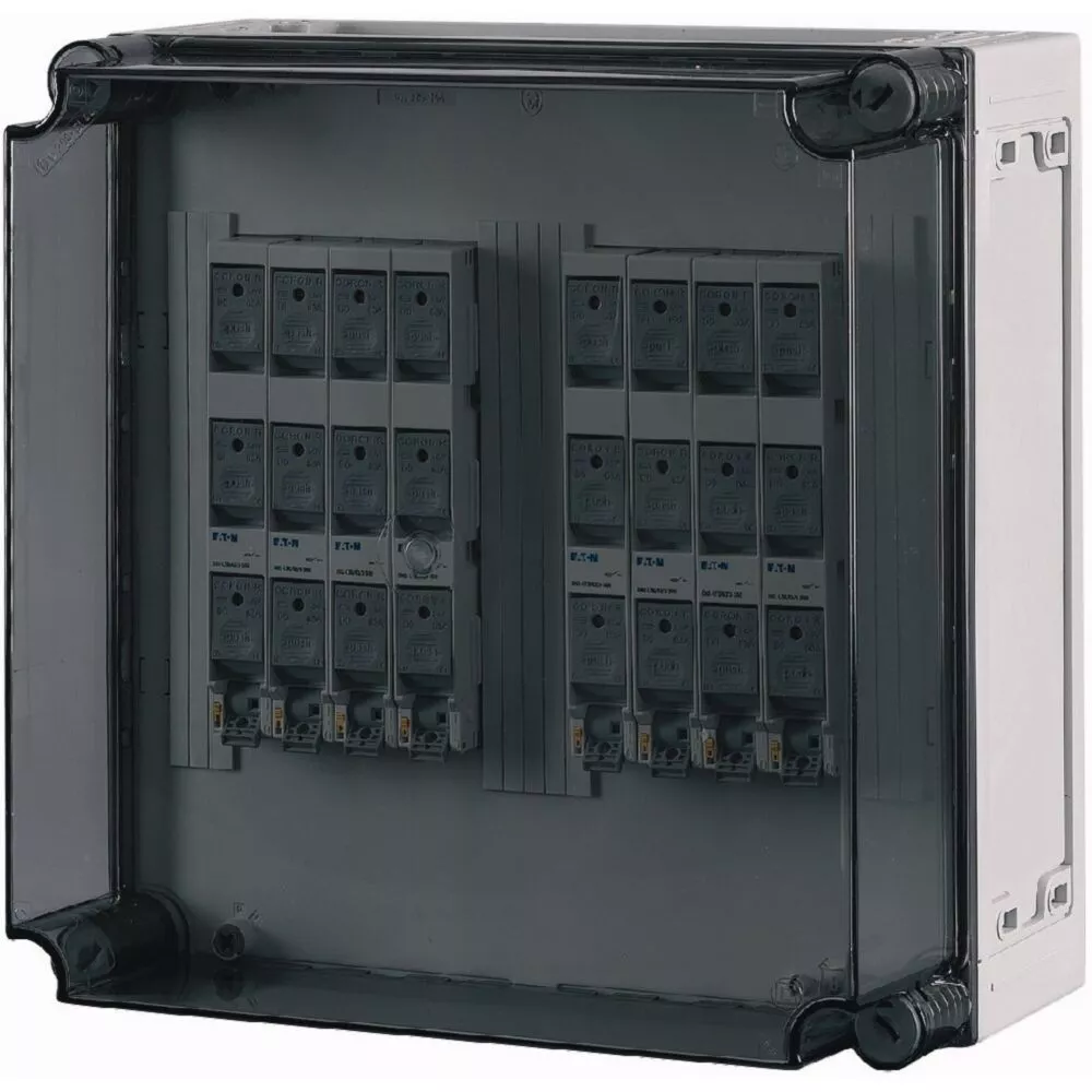 D02 Verteilerschrank mit transparentem Deckel, 8x D02 Lasttrennschalter auf Sammelschienensystem 630 A, 3-polig, Träger inklusive für N+PE zum Nachrüsten, mit Kupferschienen L1/L2/L3: 30 x 10 mm, N: ohne, PE: ohne, ohne Klemmen, Sicherungsgerät mit Schubladen und Blinkfunktion, ohne Schmelzsicherungen.