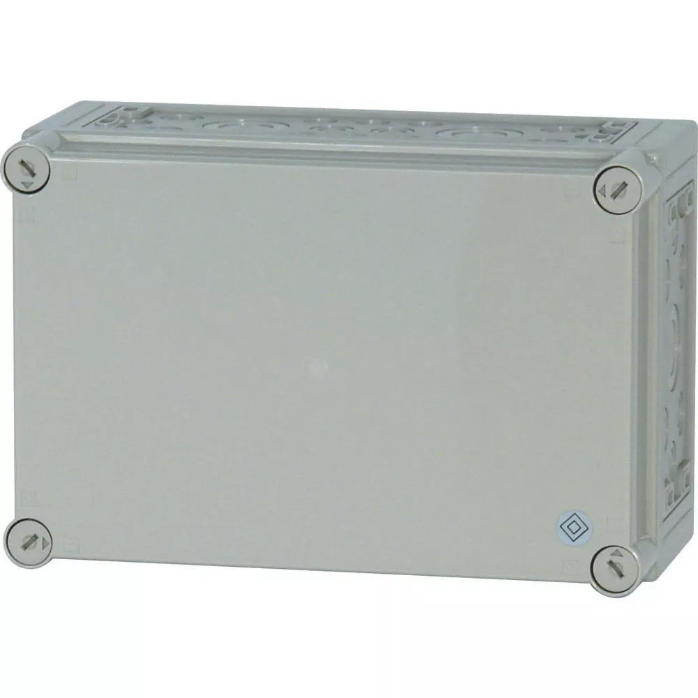 Einzel-Basisgehäuse, Material: Polycarbonat, schlagfest, Schutzart IP65, patentierter Deckelverschluss mit integriertem Überdruckausgleich, mit metrischen Vorprägungen für Kabelführungen an allen Seiten, Leistungseinführungen oben und unten, jeweils = 2x M50/32, 6x M25/16 und 8x M20, jede Seite = 1x M50/32 und 6x M25/16, Befestigungsbänder zur Wandbefestigung, plombierbare Deckelverschlüsse, Seitenwände ausschlagbar, als Verteilergehäuse umbaubar durch Ausschlagen der Seitenwände., RAL 7035 Grau (Sockel), RAL 7035 Grau (Abdeckung), Einbautiefe bei Montageplatte=150mm, Abdeckungstyp: undurchsichtig