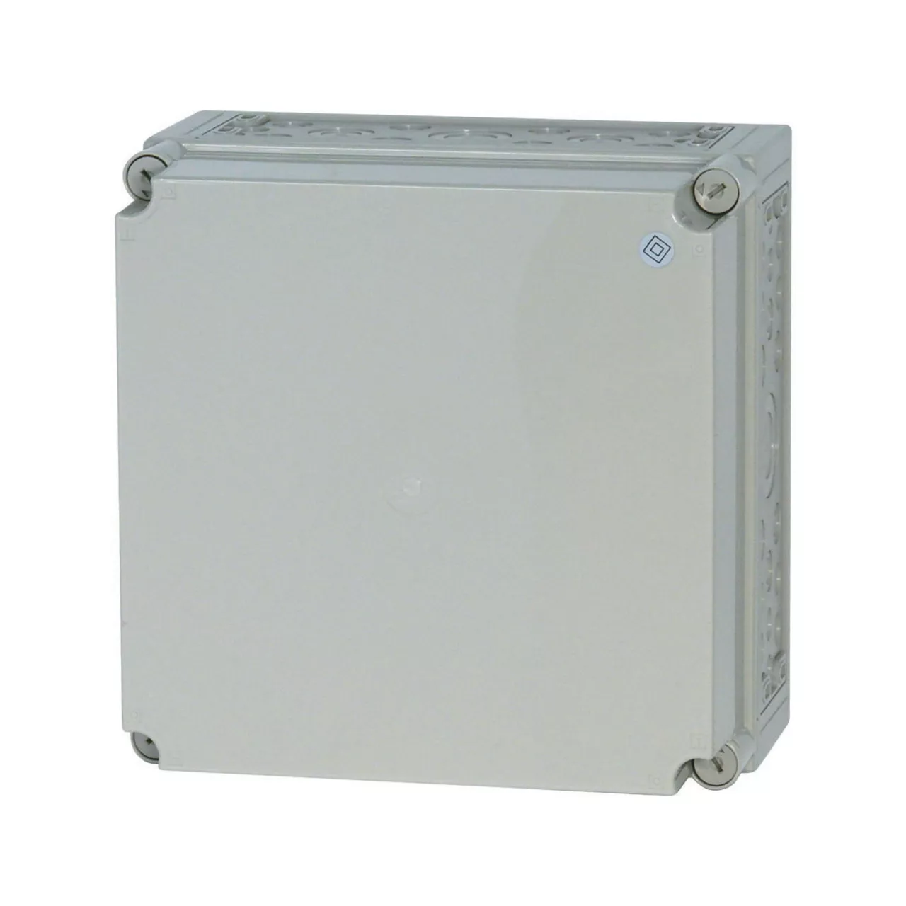 Einzel-Basisgehäuse, Material Polycarbonat, schlagfest, Schutzart IP65, patentierter Deckelverschluss mit integriertem Überdruckausgleich, mit metrischen Vorprägungen für Kabelführungen an allen Seiten, Leistungseinführungen oben und unten, jeweils = 1x M50/32, 2x M40/25, 8x M25/16 und 2x M20, jede Seite = 1x M63/40, 6x M25/16, 10x M20 und 2xM16, Befestigungsbänder zur Wandbefestigung, plombierbare Deckelverschlüsse, Seitenwände ausschlagbar, als Verteilergehäuse umbaubar durch Ausschlagen der Seitenwände., RAL 7035 Grau (Sockel), RAL 7035 Grau (Abdeckung), Einbautiefe bei Montageplatte=200mm