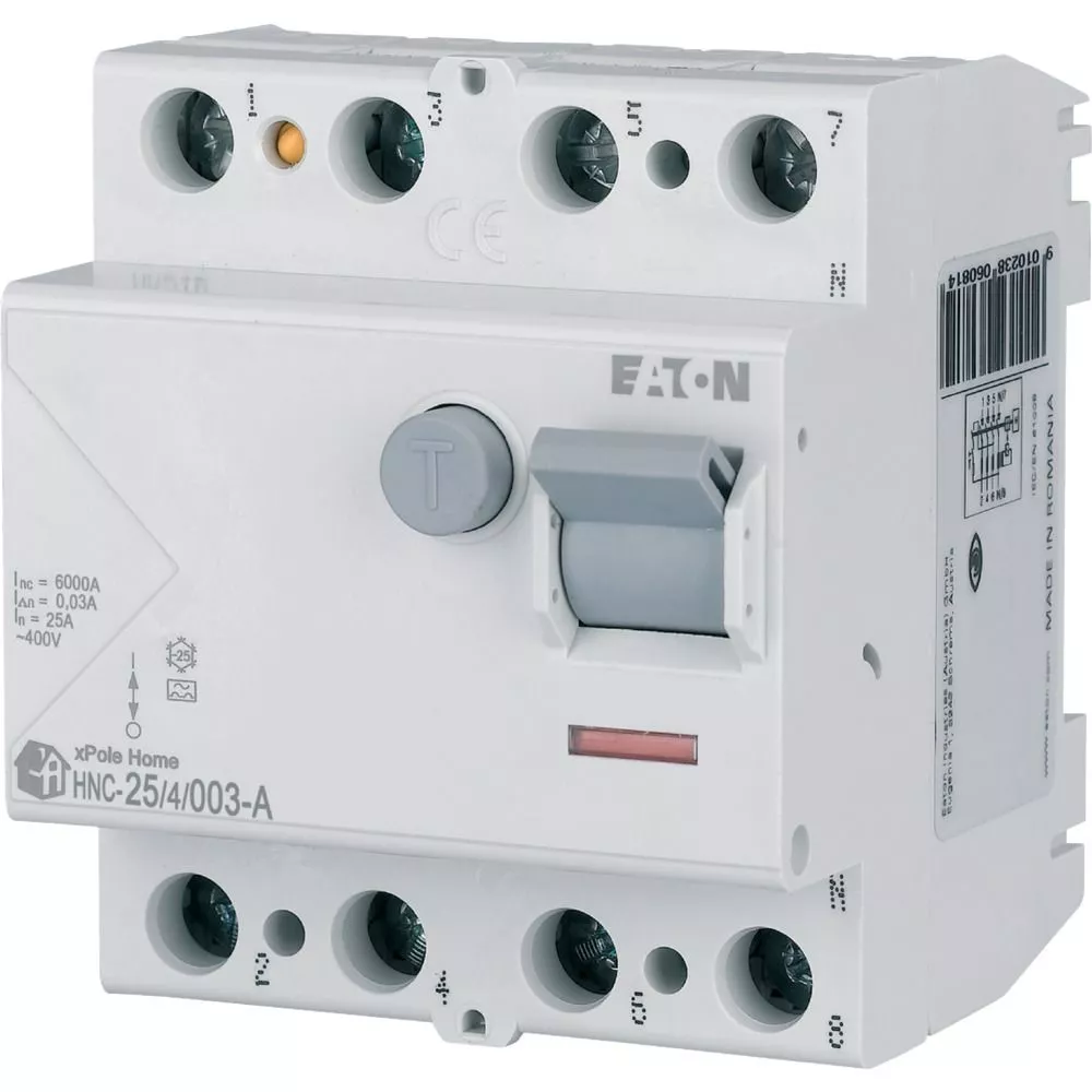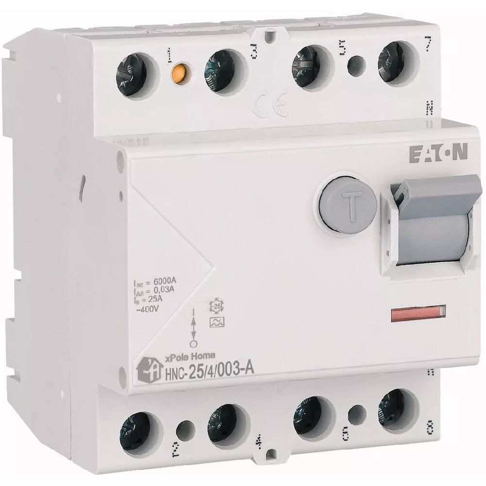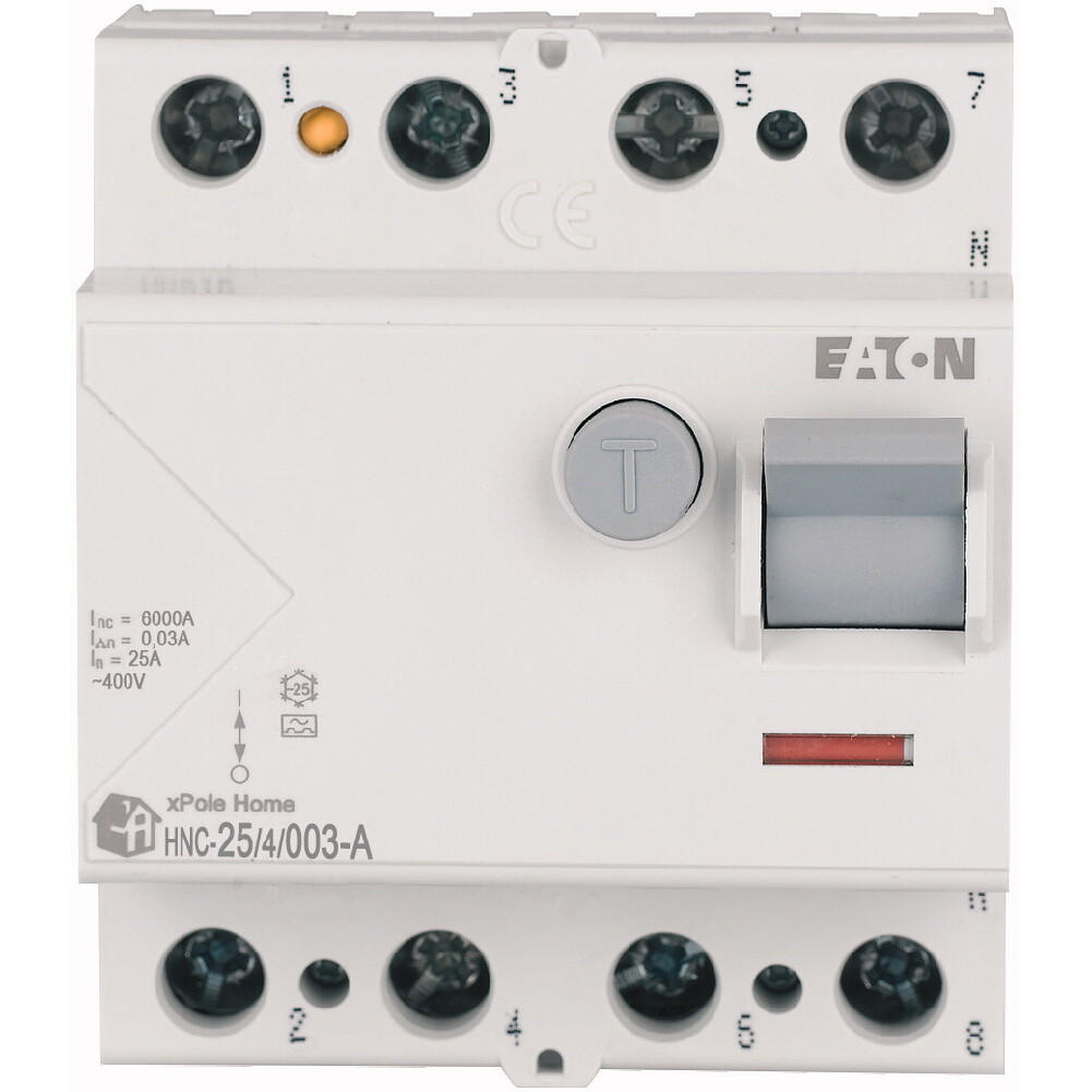 Fehlerstrom-Schutzschalter HNC, 4-polig, Bemessungsstrom Ein: 25 A, Bemessungskurzschlussfestigkeit Icn: 6 kA, Bemessungsfehlerstrom IΔN: 0,03 A, Typ A, Schaltgeräte für den Wohnungsbereich und kommerzielle Anwendungen
