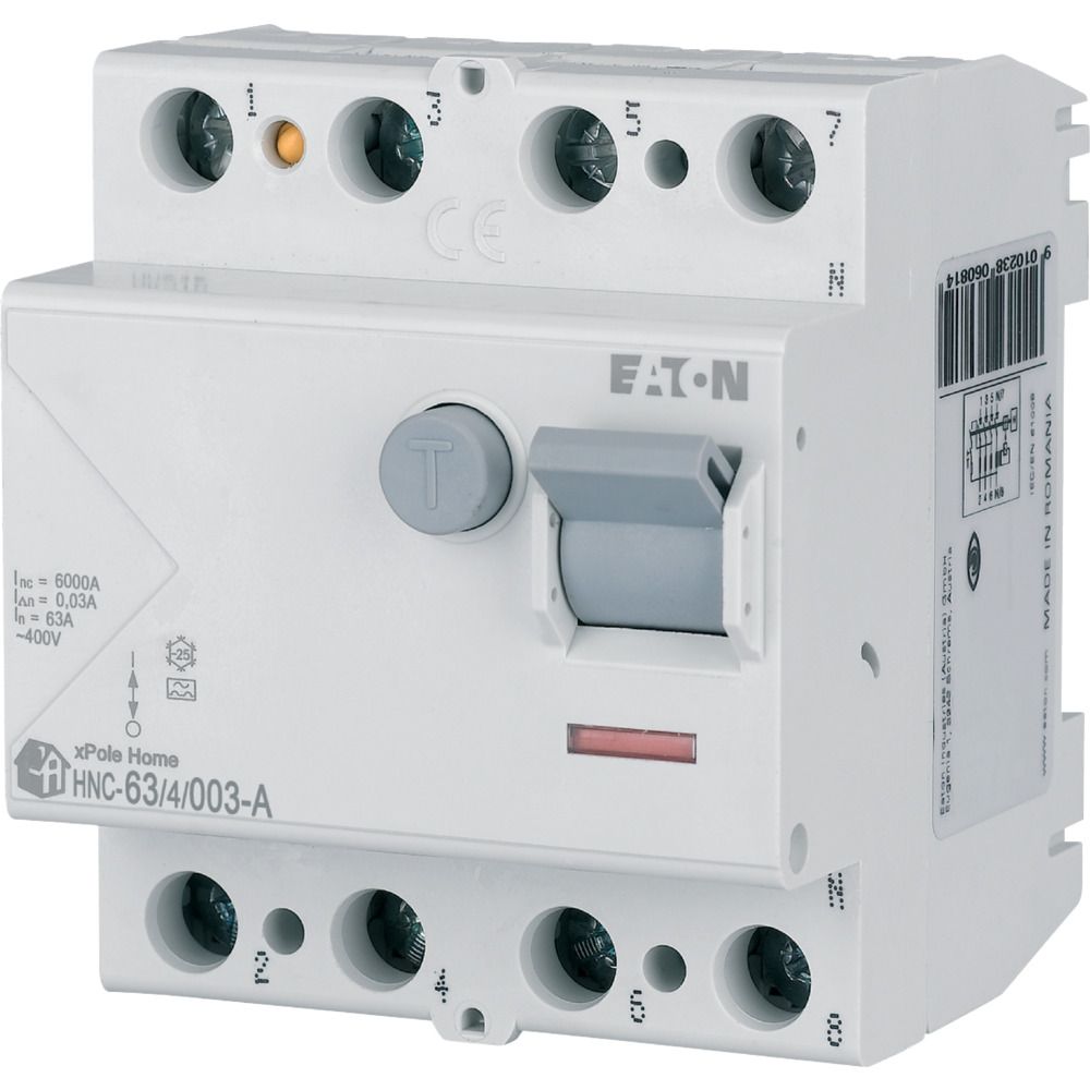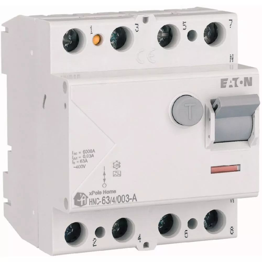Fehlerstrom-Schutzschalter HNC, 4-polig, Bemessungsstrom Ein: 63 A, Bemessungskurzschlussfestigkeit Icn: 6 kA, Bemessungsfehlerstrom IΔN: 0,03 A, Typ A, Schaltgeräte für den Wohnungsbereich und kommerzielle Anwendungen