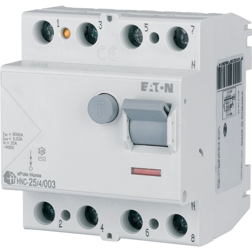 Fehlerstrom-Schutzschalter HNC, 4-polig, Bemessungsstrom Ein: 25 A, Bemessungskurzschlussfestigkeit Icn: 6 kA, Bemessungsfehlerstrom IΔN: 0,03 A, Typ Wechselstrom, Schaltgeräte für den Wohnungsbereich und kommerzielle Anwendungen