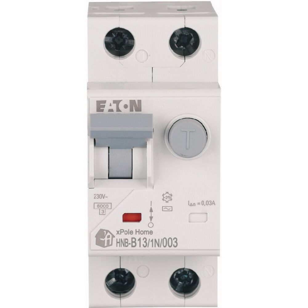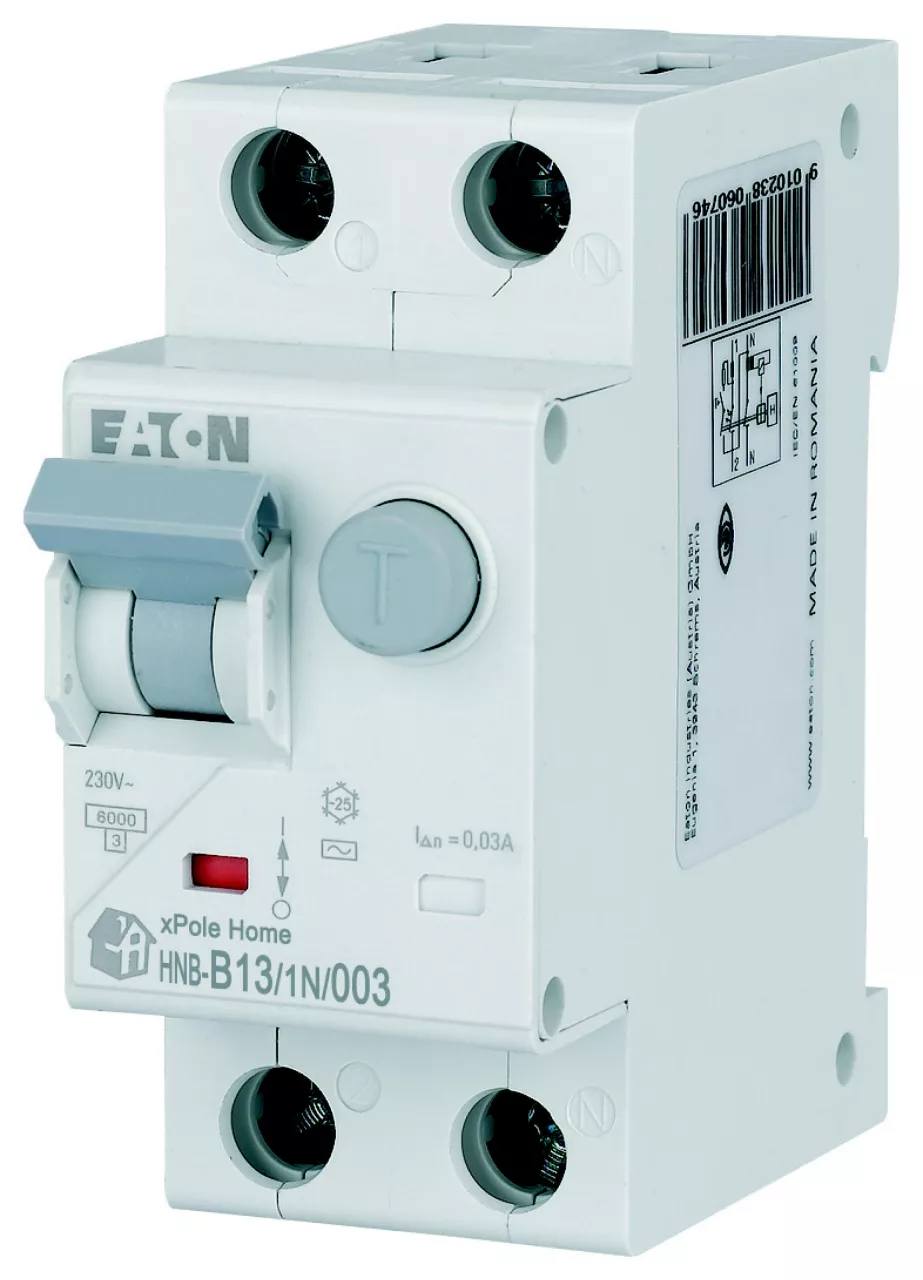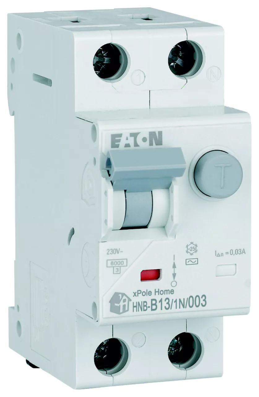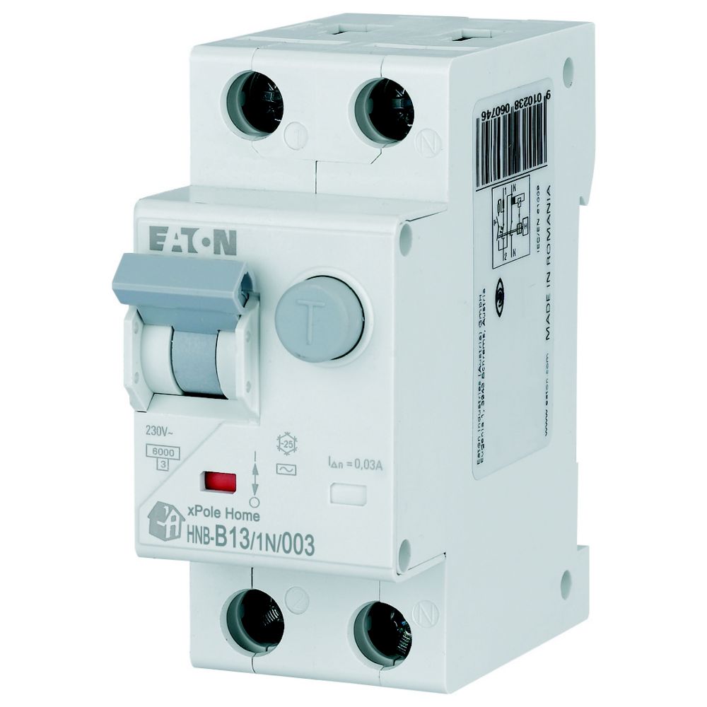 Kombinowany wyłącznik różnicowoprądowy z modułem nadprądowym, HNB, 1-biegunowy+N, prąd znamionowy In: 13 A, znamionowy prąd różnicowy: 0,03 A, znamionowaność wyłączania zgodnie z IEC/EN 61009: 6 kA, Rozdzielnice do zastosowań mieszkaniowych i komercyjnych