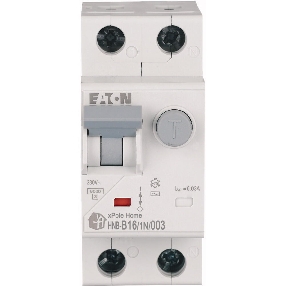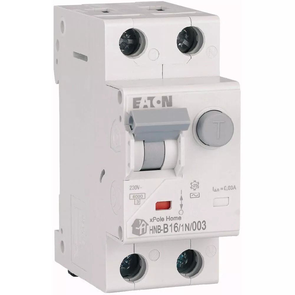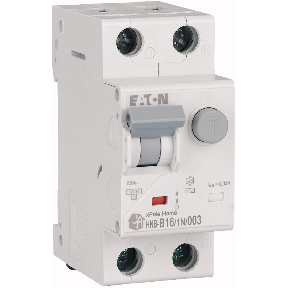 Kombinowany wyłącznik różnicowoprądowy z modułem nadprądowym, HNB, 1-biegunowy+N, prąd znamionowy In: 16 A, znamionowy prąd różnicowy: 0,03 A, znamionowaność wyłączania zgodnie z IEC/EN 61009: 6 kA, Rozdzielnice do zastosowań mieszkaniowych i komercyjnych