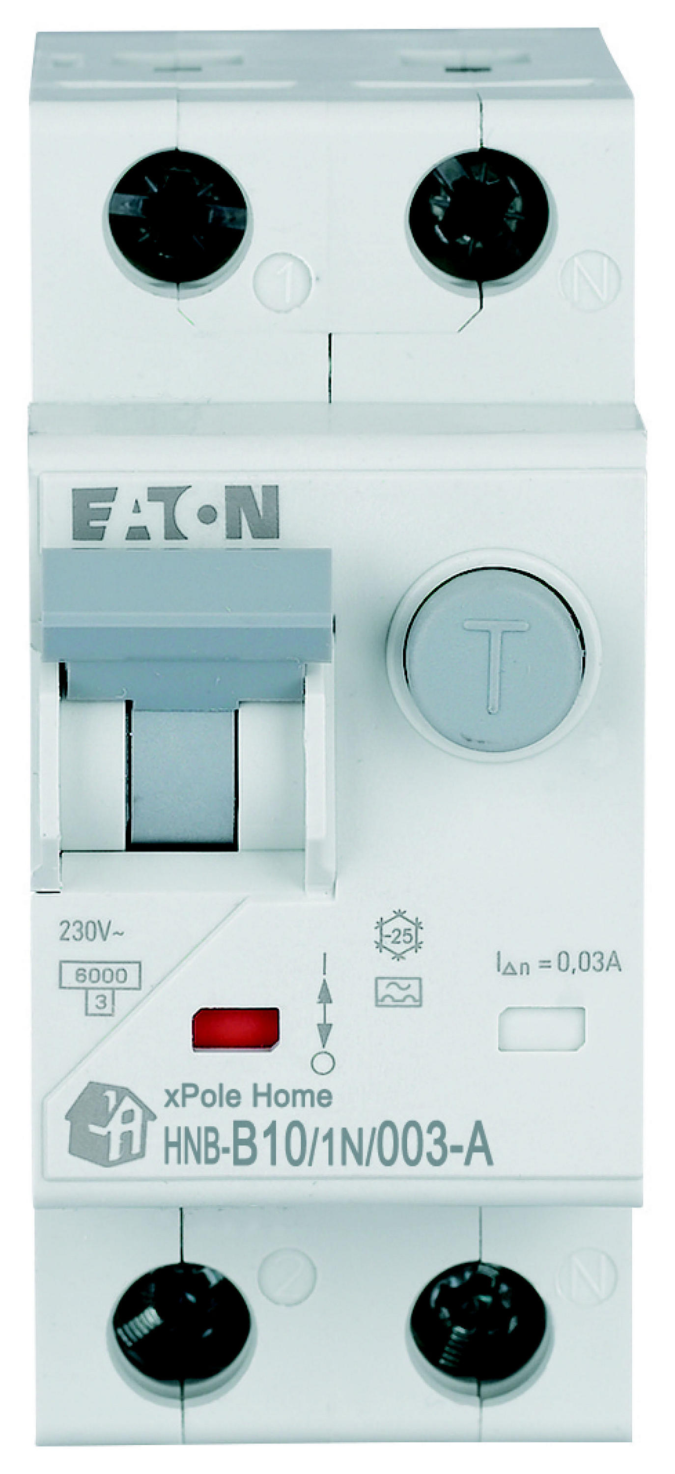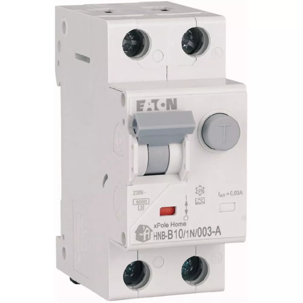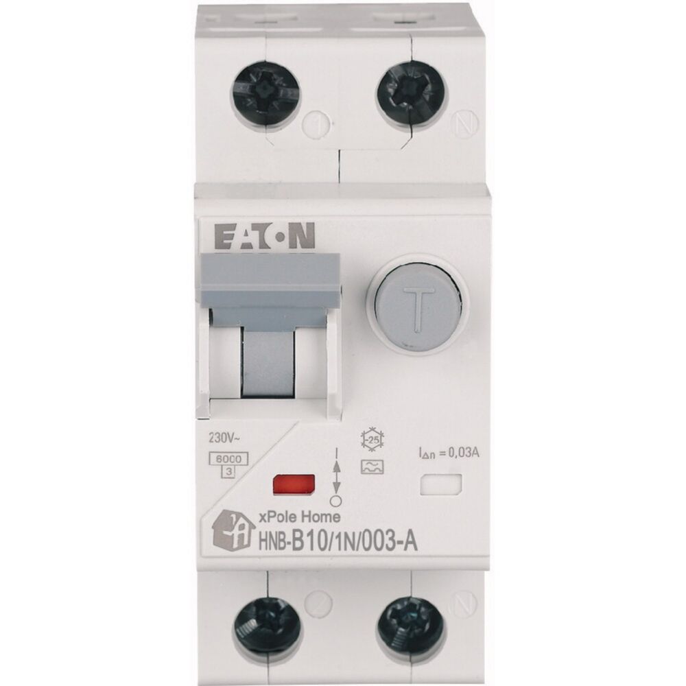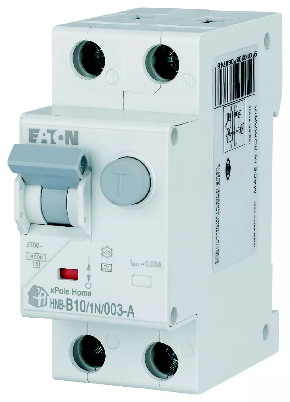 Kombinowany wyłącznik różnicowoprądowy z modułem nadprądowym, HNB, 1-biegunowy+N, prąd znamionowy In: 10 A, znamionowy prąd różnicowy IΔN: 0,03 A, znamionowaność wyłączania zgodnie z IEC/EN 61009: 6 kA, Rozdzielnice do zastosowań mieszkaniowych i komercyjnych