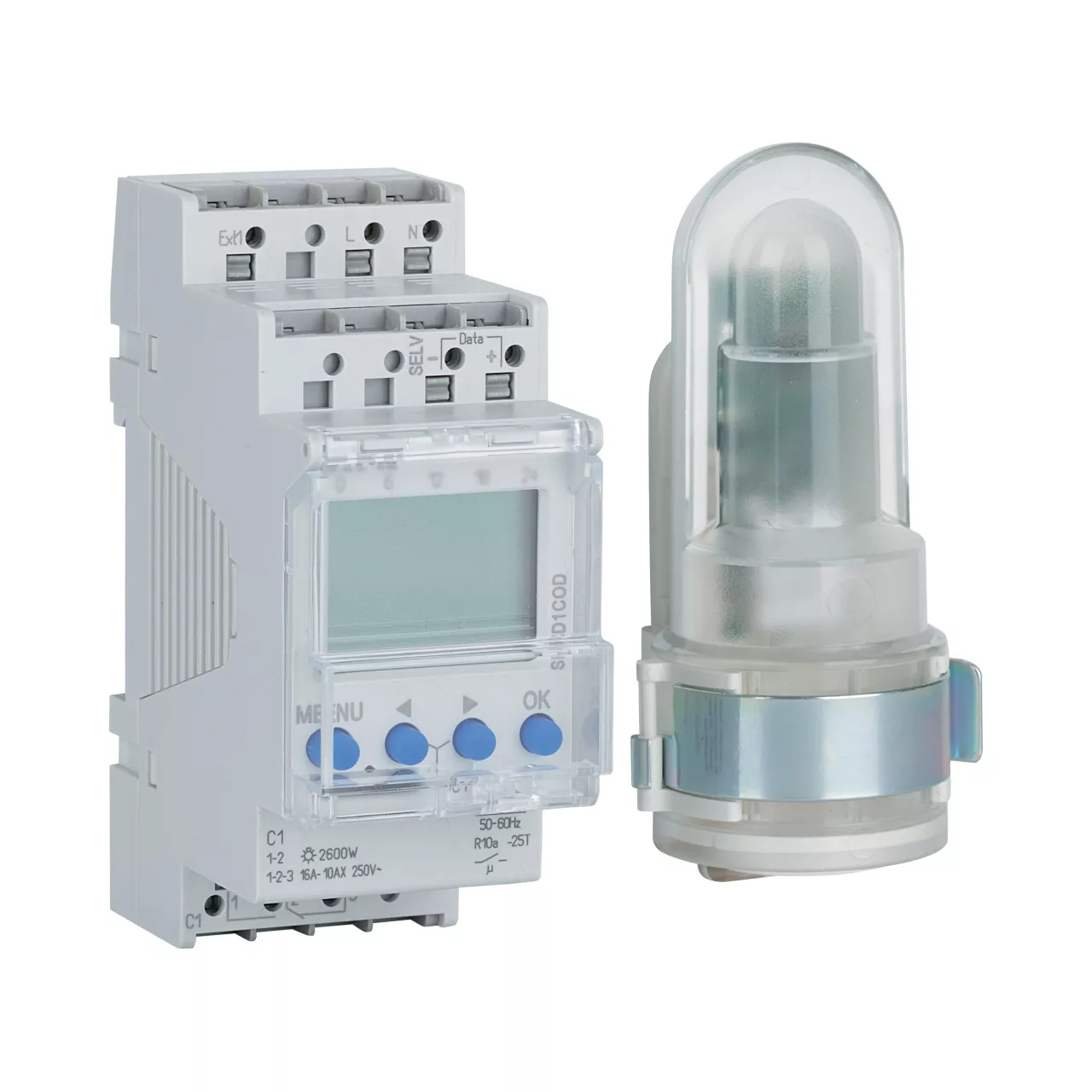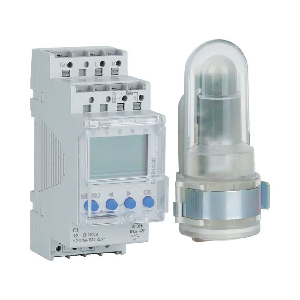 Digitaler Dämmerungsschalter mit integrierter Wochen-Zeitschaltuhr für Installationsverteiler, 35,8 mm Breite, externer Lichtsensor, Aufbaumontage mit 1,5-m-Verbindungskabel, im Lieferumfang enthalten (IP55), unterschiedliche Lux-Werte für jeden Tag der Woche programmierbar, feste EIN- und AUSSCHALT-Zeiten (z. B. nächtliche Unterbrechung), unabhängig von der Helligkeit programmierbar, unterschiedliche Lux-Werte und Schaltzeiten für jedes Spezialprogramm einstellbar, Schalthelligkeit digital anpassbar 1–99000 Lux, einstellbare Einschaltverzögerung/Ausschaltverzögerung zur Vermeidung von durch Blitzschlag oder Autoscheinwerfern ausgelösten Fehlbedienungen Voreinstellung 1 Minute