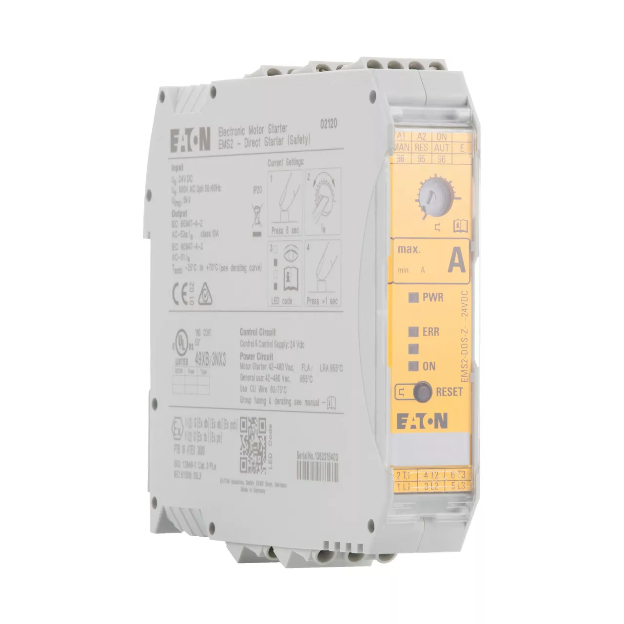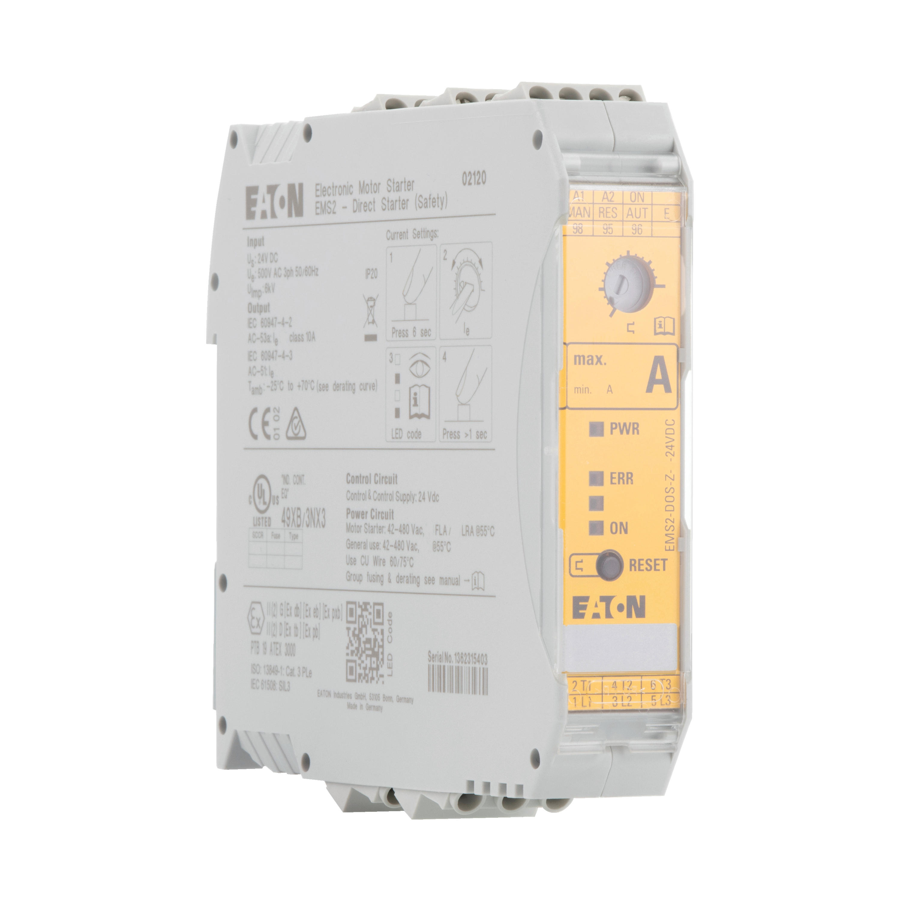 Rozruszniki bezpośredni, Zacisk śrubowy: Elektroniczny rozrusznik silnikowy, Opis: Rozrusznik DOL, Zabezpieczenie silnikowe, Aktor zatrzymania awaryjnego, Konstrukcja obwodu: bezpieczny stan wyjścia z obejściem, rozłącznik trójfazowy., Zgodność, Aprobata ochrony przeciwwybuchowej (zgodnie z ATEX 94/9/EC): II (2) G [Ex e] [Ex d] [Ex px], II (2) D [Ex t] [Ex p], Zgodność, Aprobata certyfikacji testu prototypu-EC PTB 13 ATEX 3003, maks. moc znamionowa dla trójfazowych silników, 50–60 Hz AC-53a 380 V 400 V 415 V: P = 0,55 – 3 kW, Zakres nastawczy wyzwalaczy przeciążeniowych: Ir = 1,5 – 9 A_x, Napięcie sterujące: 24 V DC, Sposób podłączenia: Zaciski śrubowe
