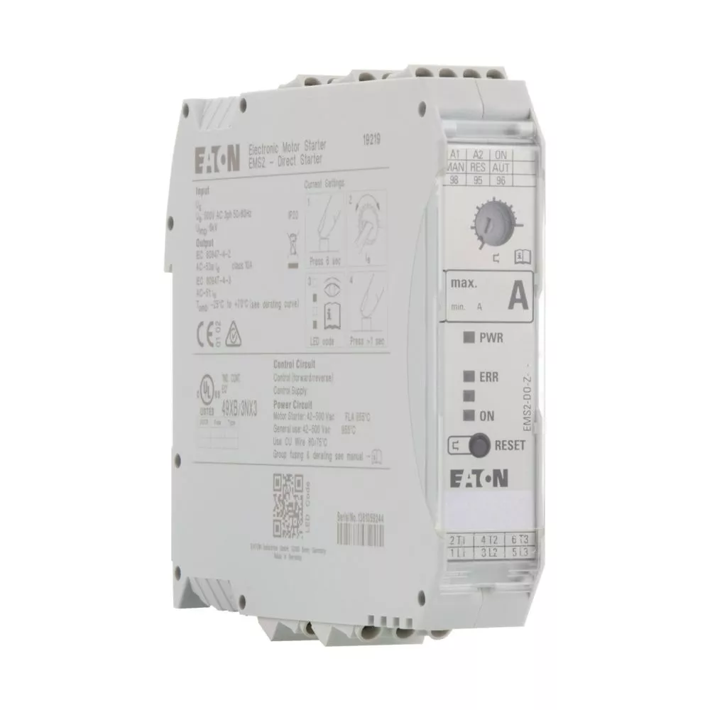 Rozruszniki bezpośredni, Zacisk śrubowy: Elektroniczny rozrusznik silnikowy, Opis: Rozrusznik DOL, zabezpieczenie silnikowe, konstrukcja obwodu: bezpieczny stan wyjścia z obejściem, rozłącznik trójfazowy, maks. moc znamionowa dla trójfazowych silników, 50–60 Hz AC-53a 380 V 400 V 415 V: P = 0,06 – 0,75 kW, Zakres nastawczy wyzwalaczy przeciążeniowych: Ir = 0,18 – 2,4 A_x, Napięcie sterujące: 230 V AC, Sposób podłączenia: Zaciski śrubowe, Podłączanie do SmartWire-DT: nie, Miejsce montażu: Pionowy, Obwód wyjściowy na dole, Normy: IEC/EN 60947-4-2, UL508