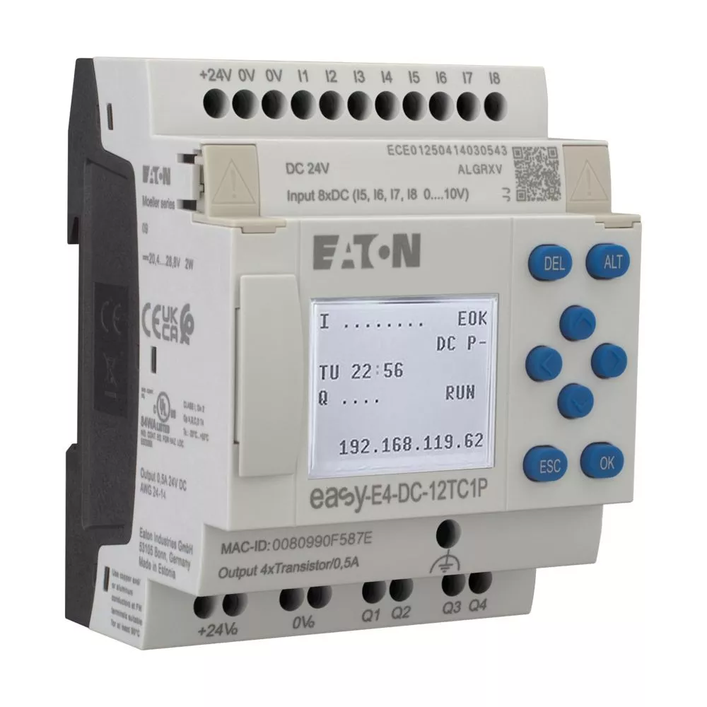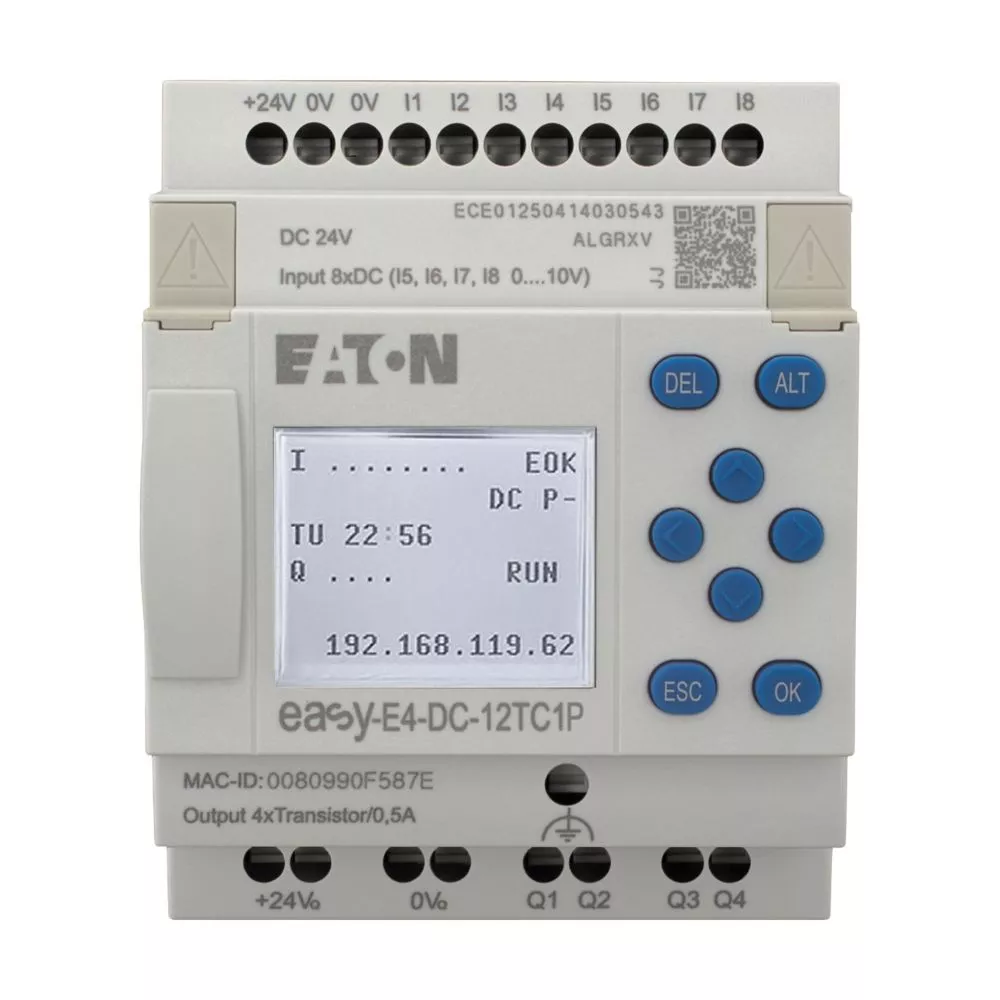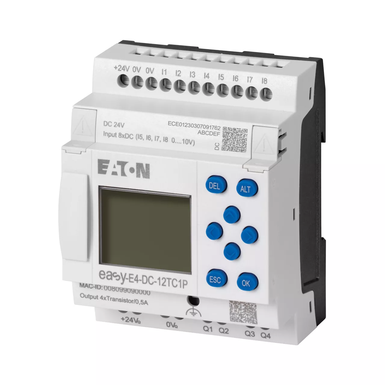 Elektroniczny sterownik o znamionowym napięciu roboczym 24 V DC. Dostępnych jest 8 wejścia cyfrowe o napięciu 24 V DC, można również użyć 4 spośród tych wejść analogowych i 4 wejść jako szybkich liczników. sterownik ma 4 wyjścia tranzystorowe dla napięcia 24 V DC. sterownik easy-E4 jest wyposażony w wyświetlacz, zegar, zintegrowany interfejs Ethernet i zaciski wtykowe. sterownik można rozbudować za pomocą cyfrowych rozszerzeń we/wy serii easyE4.