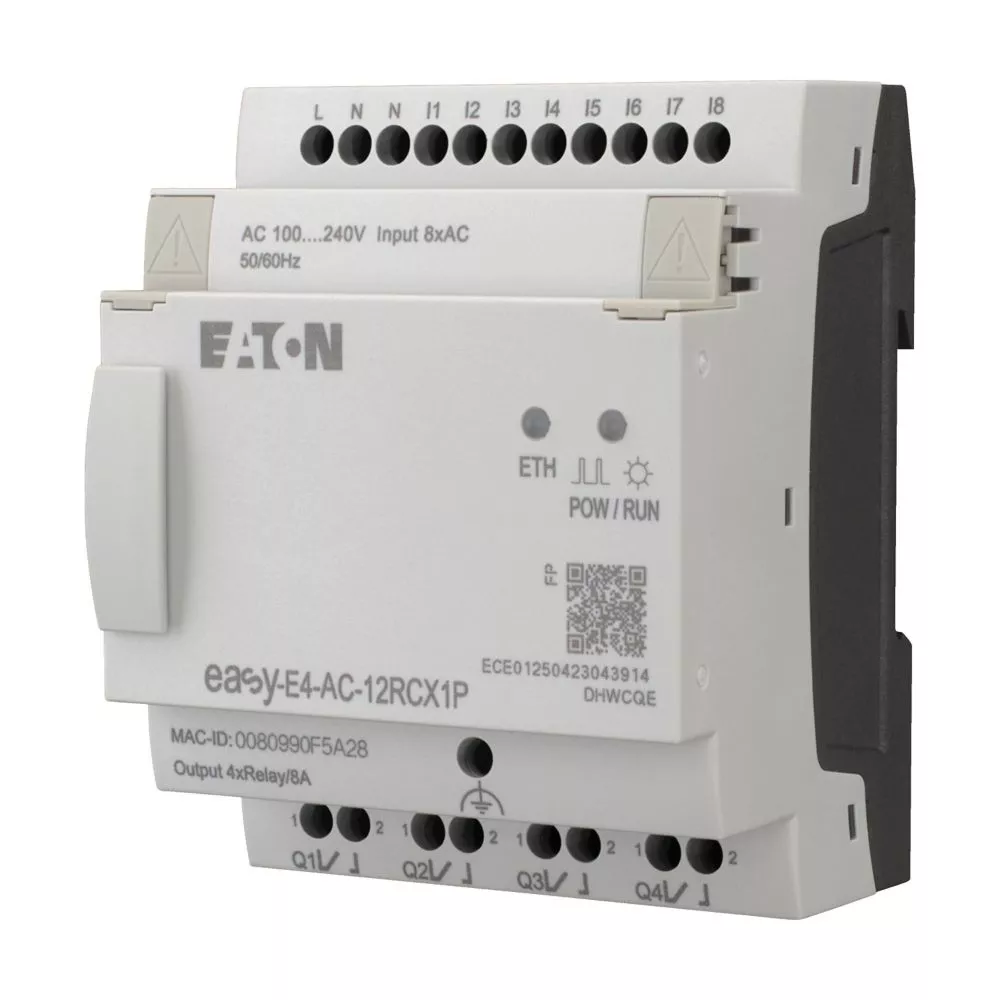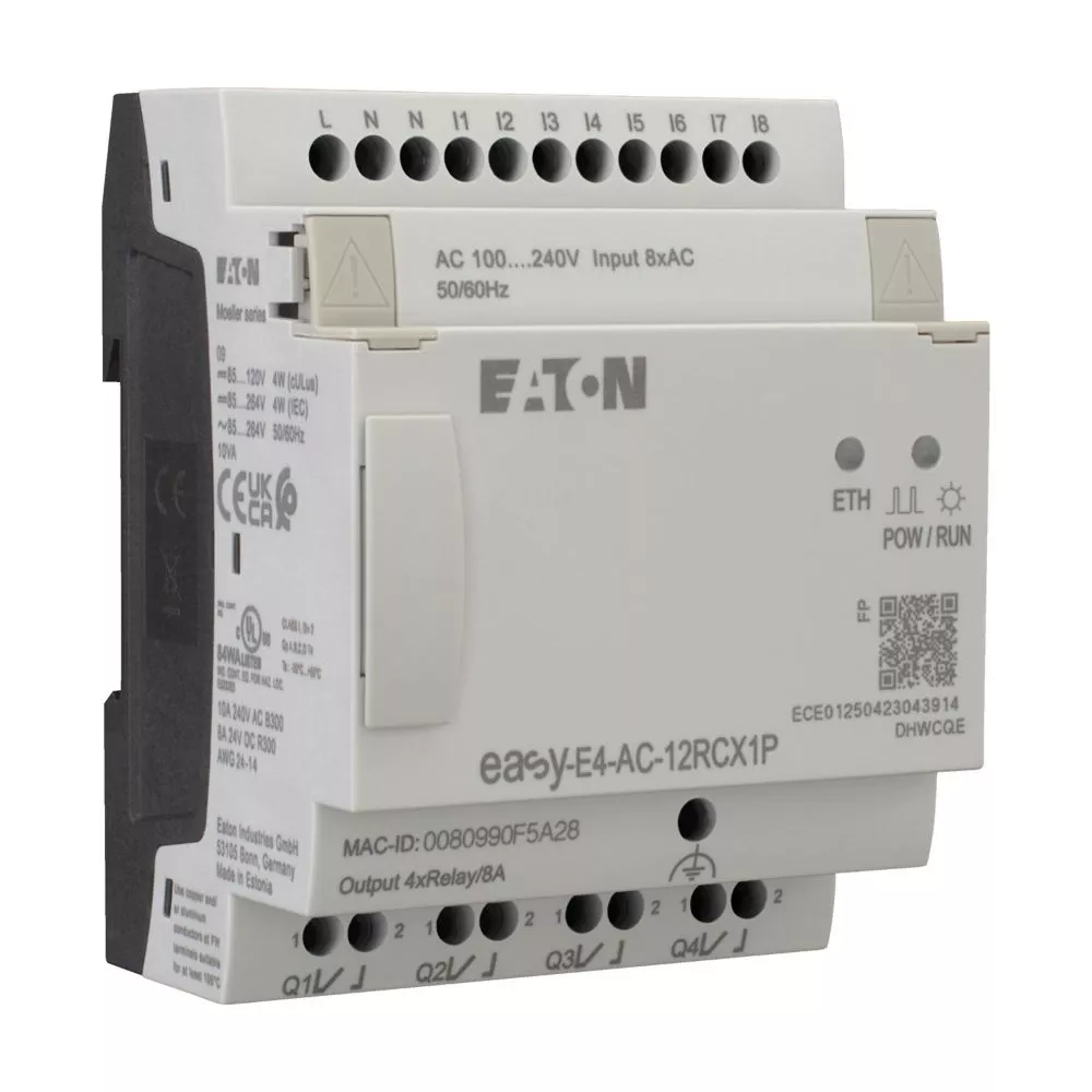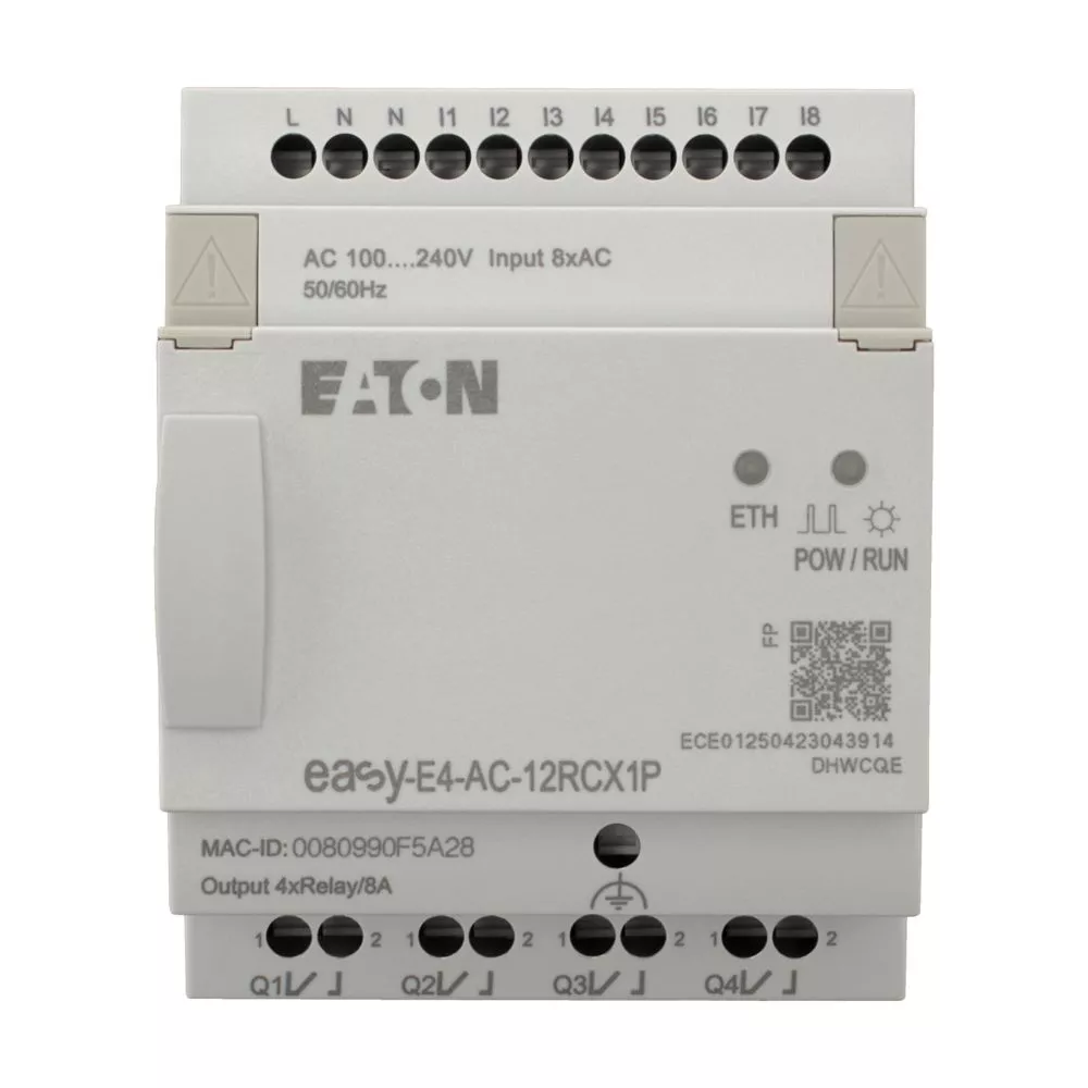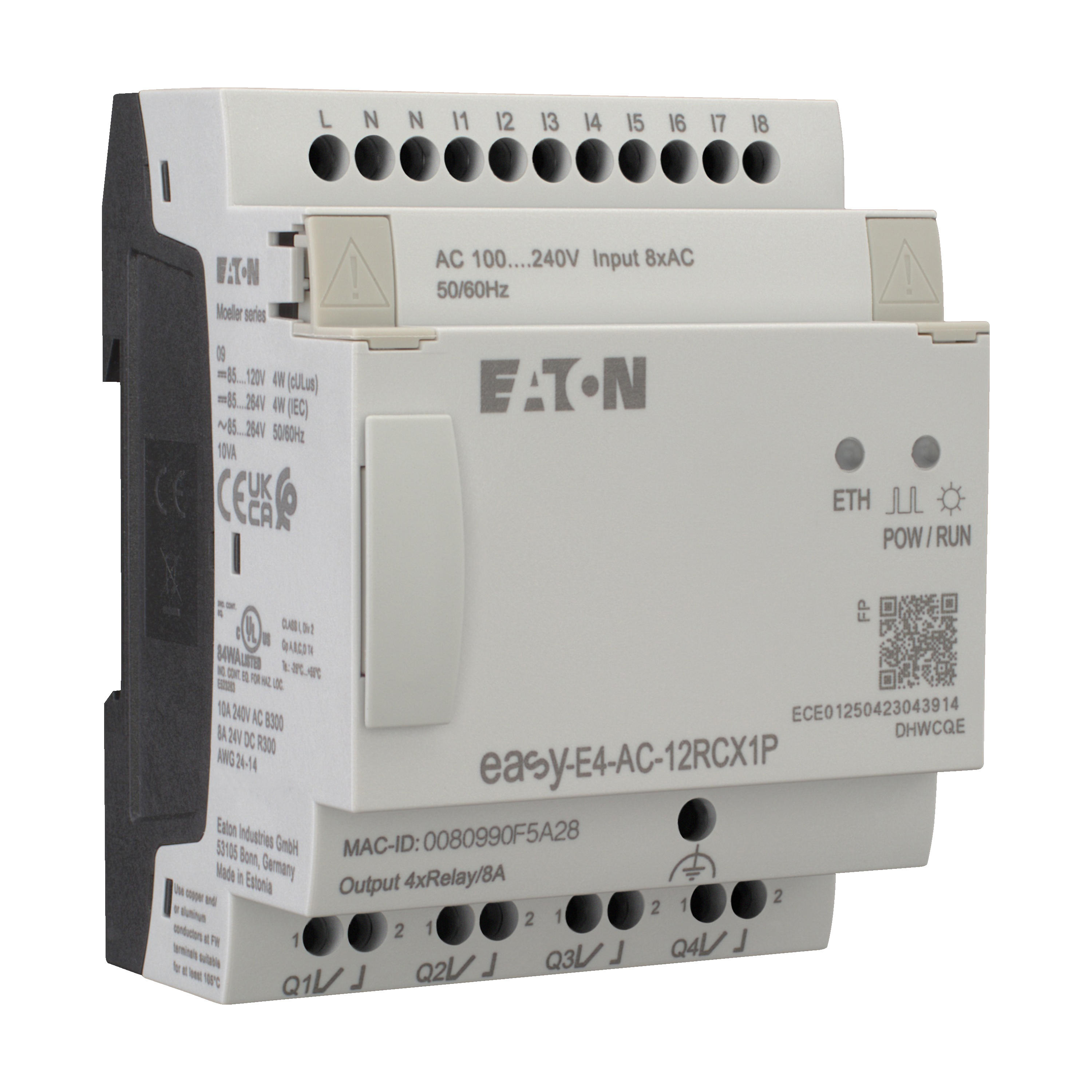 Elektroniczny sterownik o znamionowym napięciu roboczym od 100 do 240 V AC lub od 100 do 240 V DC. Do cULus, Wartość od 100 do 110 V DC ma zastosowanie do wszystkich parametrów V DC. Dostępnych jest 8 wejść cyfrowych o napięciu 100 - 240 V AC lub 100 do 240 V DC. sterownik jest wyposażony w 4 wyjścia przekaźnikowe 12 - 250 V AC lub 12 - 240 V DC. sterownik easy-E4 jest wyposażony w diagnostyczne diody LED, zegar, zintegrowany interfejs Ethernet i zaciski wtykowe. sterownik easy-E4 można rozbudować za pomocą cyfrowych rozszerzeń we/wy serii easyE4. Może być dostarczany z dostosowanym programem użytkownika, należy użyć numeru katalogowego 2010781 EASY-COMBINATION.