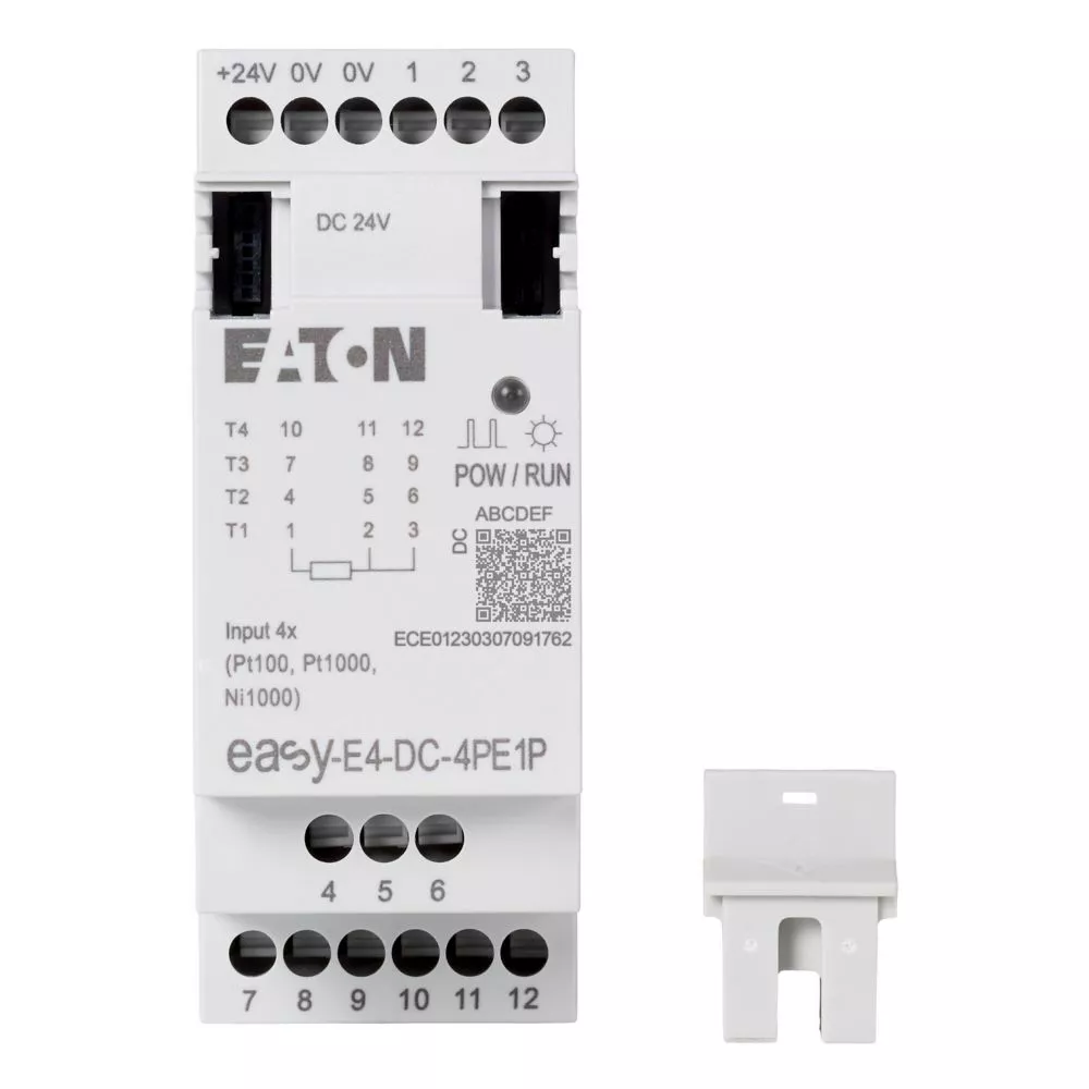 Rozszerzenie we/wy dla przekaźników sterowania serii easyE4 o znamionowym napięciu roboczym 24 V DC. To rozszerzenie zapewnia 4 wejścia analogowe, które mogą być wykorzystane dla Pt100, Rezystancyjne czujniki temperatury Pt1000 lub Ni1000. Wejścia Pt100, Pt1000 lub Ni1000 nadają się do połączeń dwużyłowych i trójżyłowych. Połączenia są ustanawiane przy użyciu zacisków wtykowych. Połączenie ze sterownikiem lub innym rozszerzeniem z serii easyE4 jest nawiązywane za pomocą złącza EASY-E4-CONNECT1 (poz. 197225), standardowo w zestawie.