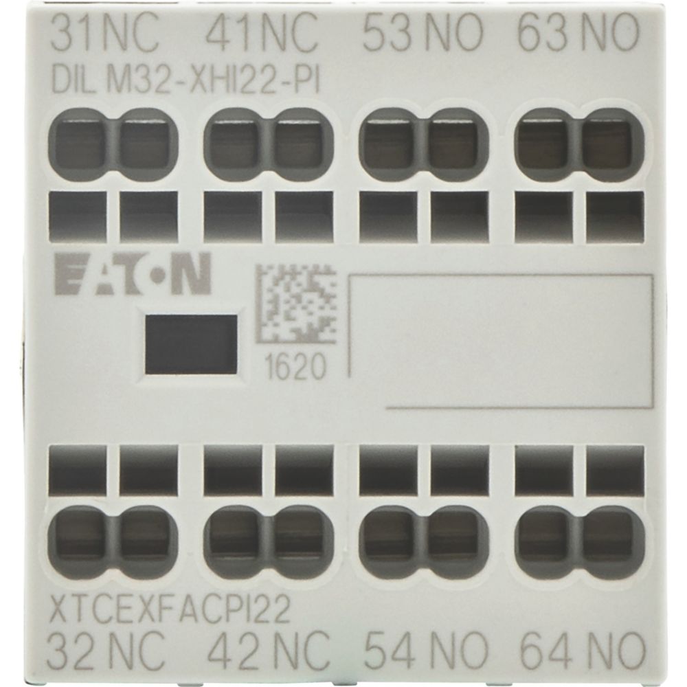Hulpcontactblok, met onderling vergrendelde tegenoverliggende contacten, functie: voor standaard toepassingen, 4-polig, aansluittechniek: Push-in klemmen, Ith 16 A, nominale bedrijfsstroom AC-15 220 V 230 V 240 V: Ie= 4 A, nominale bedrijfsstroom AC-15 380 V 400 V 415 V: Ie= 4 A, contacten no = normaal open: 2 no, contacten nc = normaal gesloten: 2 nc, type montage: Frontbevestiging, voor gebruik met: DILA…-PI, DILM7…-PI, DILM9…-PI, DILM12…-PI, DILM15…-PI, DILM17…-PI, DILM25…-PI, DILM32…-PI, DILM38…-PI, DILMP20…-PI, DILMP32…-PI, DILMP45…-PI, DILM8…-PI, DILM11…-PI, DILM14…-PI, Type: Hulpcontact voor frontmontage