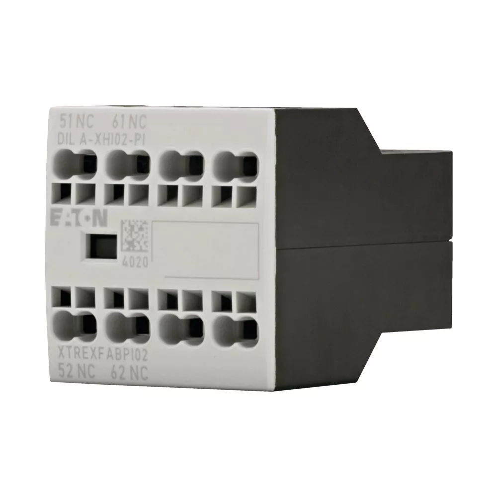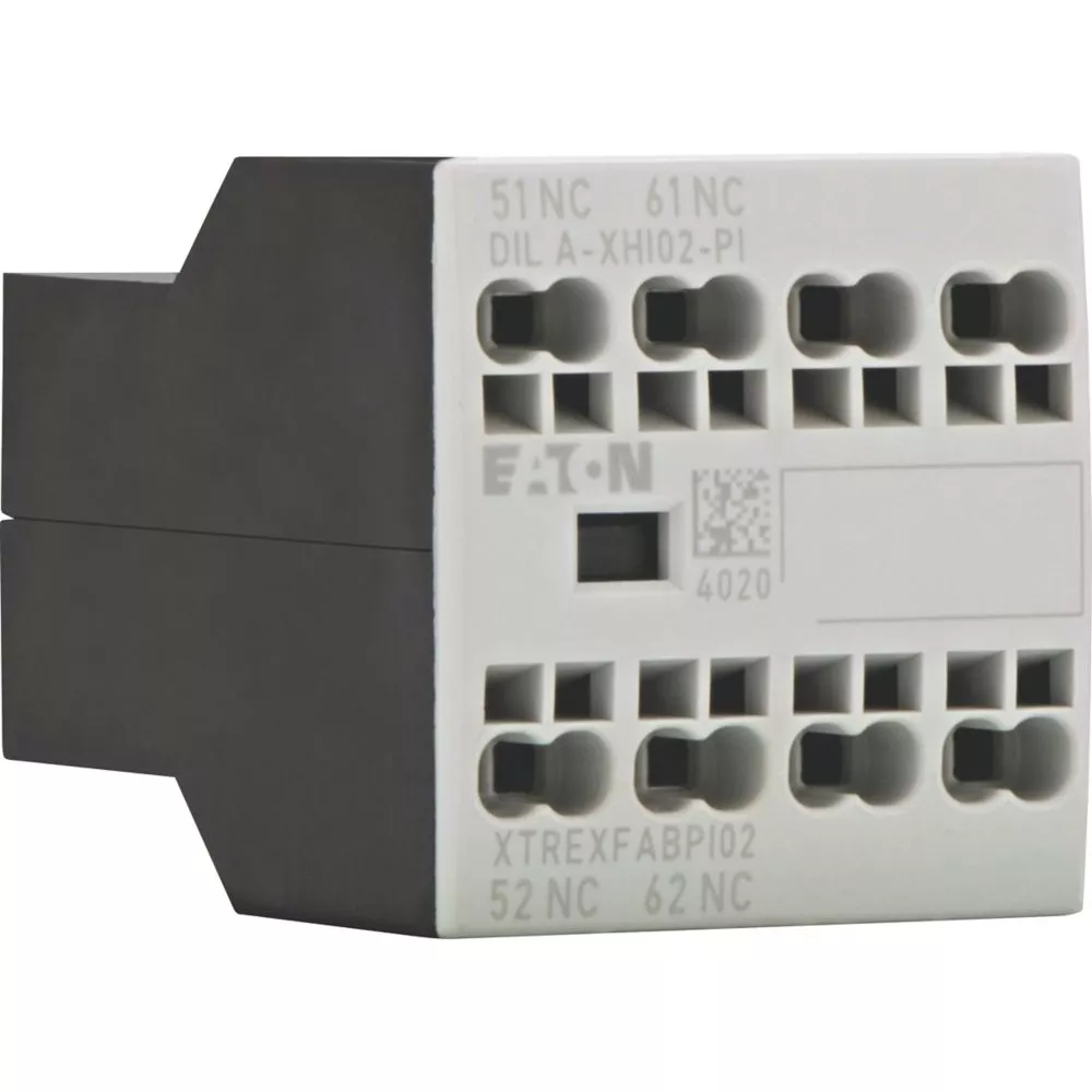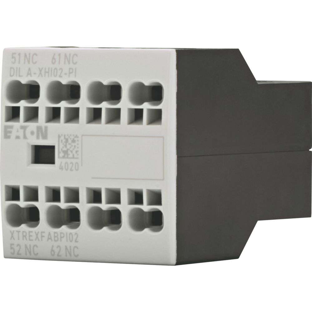 Moduły styków pomocniczych, z przeciwstawnymi sprzężonymi stykami, Funkcja: do zastosowań standardowych, 2-biegunowy, Sposób podłączenia: Zaciski wtykowe Push-In, Ith = 16 A, Znamionowy prąd roboczy AC-15, 220 V 230 V 240 V: Ie = 4 A, Znamionowy prąd roboczy AC-15, 380 V 400 V 415 V: Ie= 4 A, Zestyki R = rozwierne: 2 R, Typ mocowania: Mocowanie z przodu, Do zastosowania z: DILA…-PI, DILM7…-PI, DILM9…-PI, DILM12…-PI, DILM15…-PI, DILM17…-PI, DILM25…-PI, DILM32…-PI, DILM38…-PI, DILMP20…-PI, DILMP32…-PI, DILMP45…-PI, DILM8…-PI, DILM11…-PI, DILM14…-PI, Typ: Styk pomocniczy do montażu przedniego