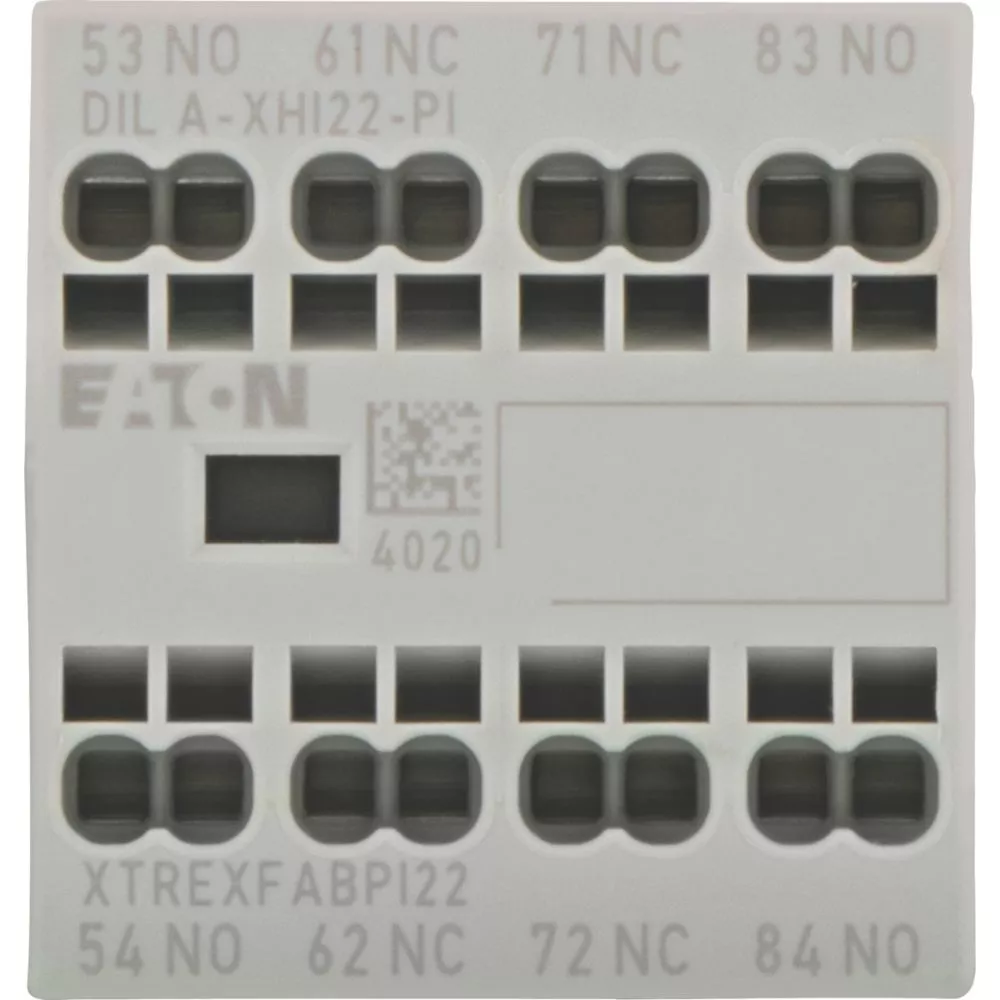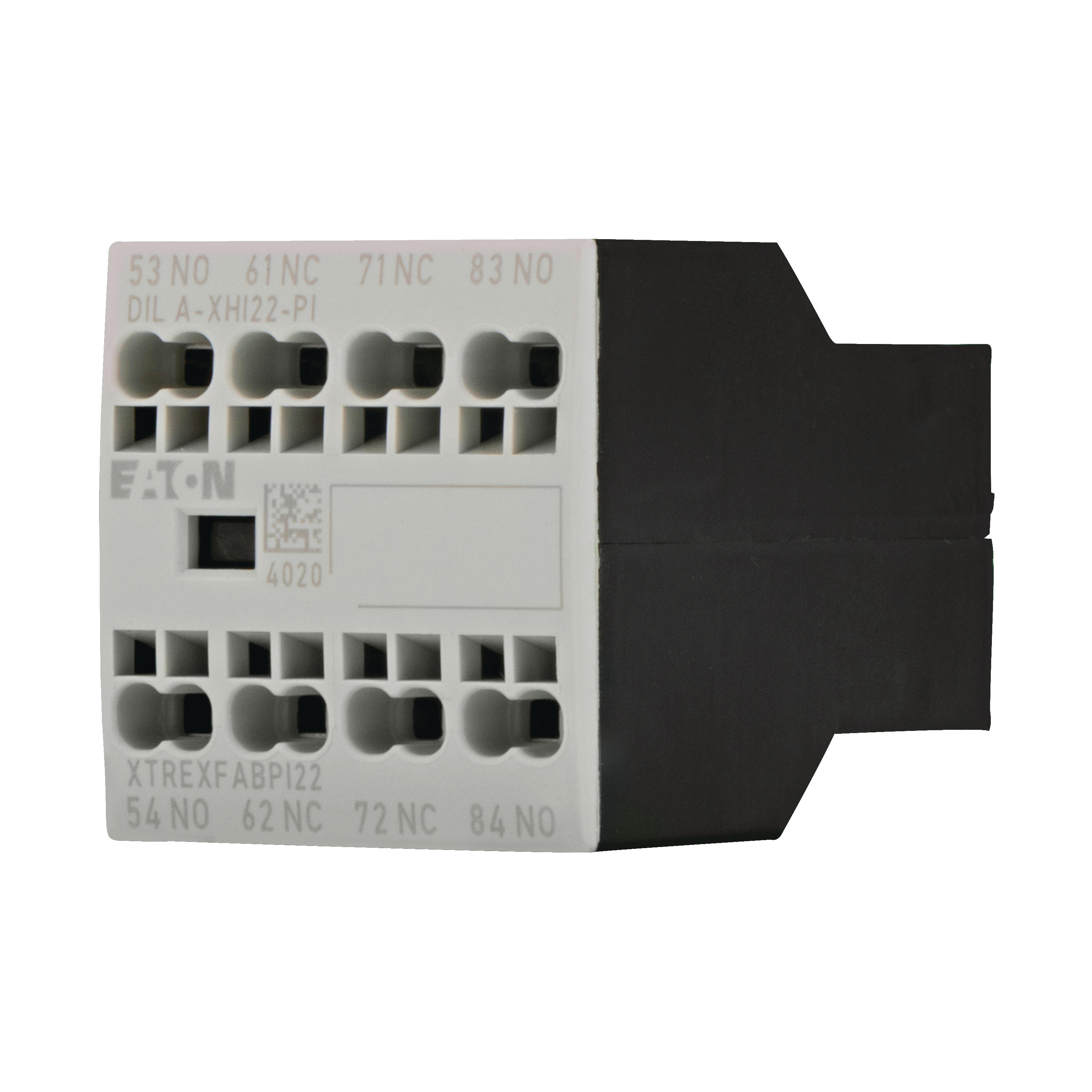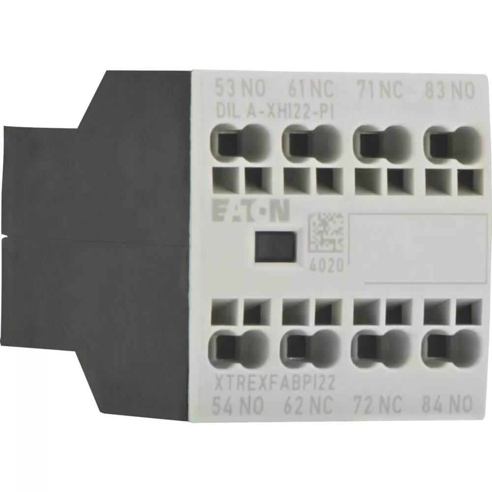 Moduły styków pomocniczych, z przeciwstawnymi sprzężonymi stykami, Funkcja: do zastosowań standardowych, 4-biegunowy, Sposób podłączenia: Zaciski wtykowe Push-In, Ith = 16 A, Znamionowy prąd roboczy AC-15, 220 V 230 V 240 V: Ie = 4 A, Znamionowy prąd roboczy AC-15, 380 V 400 V 415 V: Ie = 4 A, Zestyki Z = zwierne: 2 Z, Zestyki R = rozwierne: 2 R, Typ mocowania: Mocowanie z przodu, Do zastosowania z: DILA…-PI, DILM7…-PI, DILM9…-PI, DILM12…-PI, DILM15…-PI, DILM17…-PI, DILM25…-PI, DILM32…-PI, DILM38…-PI, DILMP20…-PI, DILMP32…-PI, DILMP45…-PI, DILM8…-PI, DILM11…-PI, DILM14…-PI, Typ: Styk pomocniczy do montażu przedniego