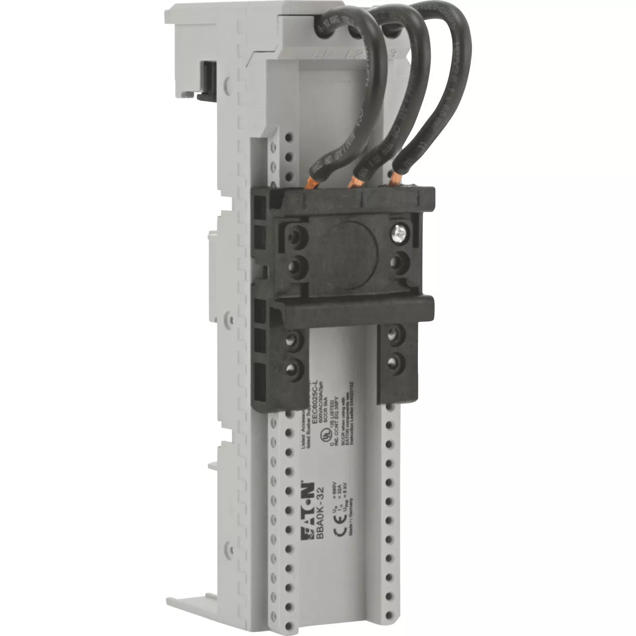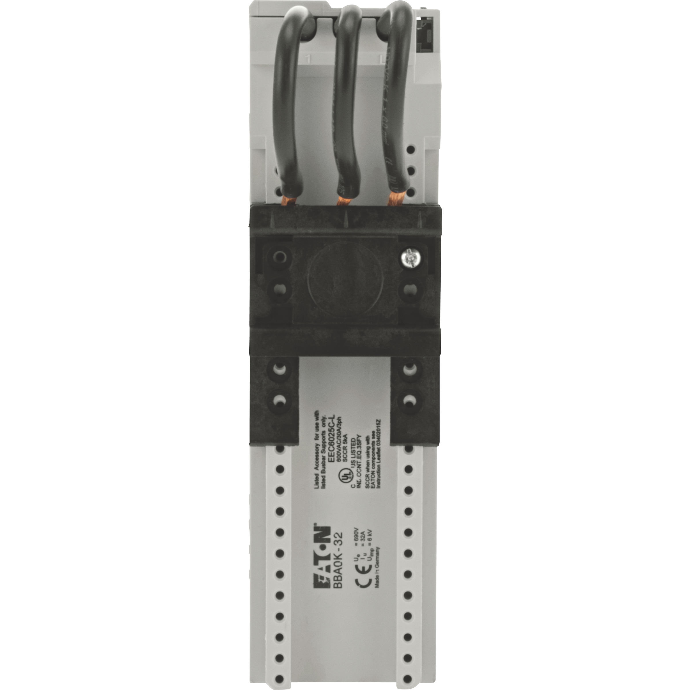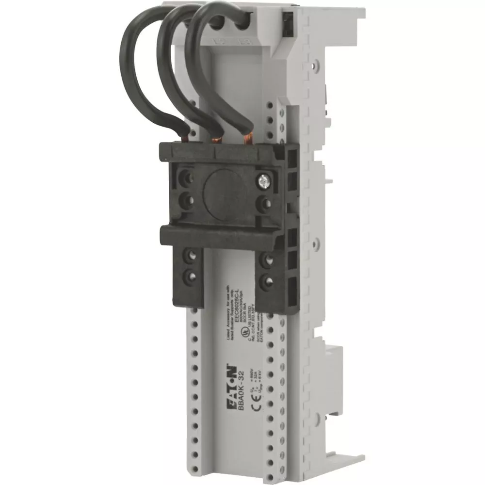 45 mm adapter do systemu szyn zbiorczych 60 mm, jedna szyna montażowa, trzy prefabrykowane przewody (AWG10/6 mm²) do podłączenia wyłącznika silnikowego PKZM0, PKE lub stycznika o wielkości od DILM7 do DILM32, znamionowy prąd roboczy: 32 A