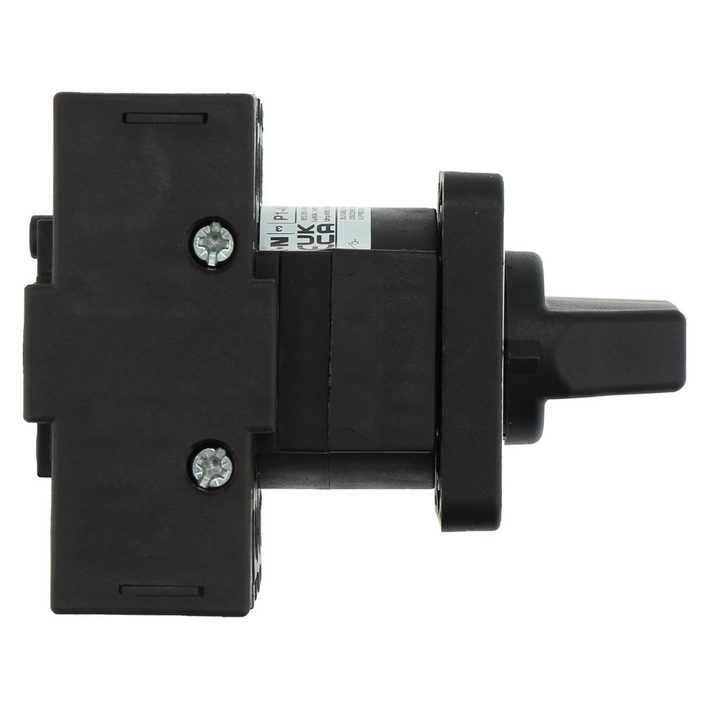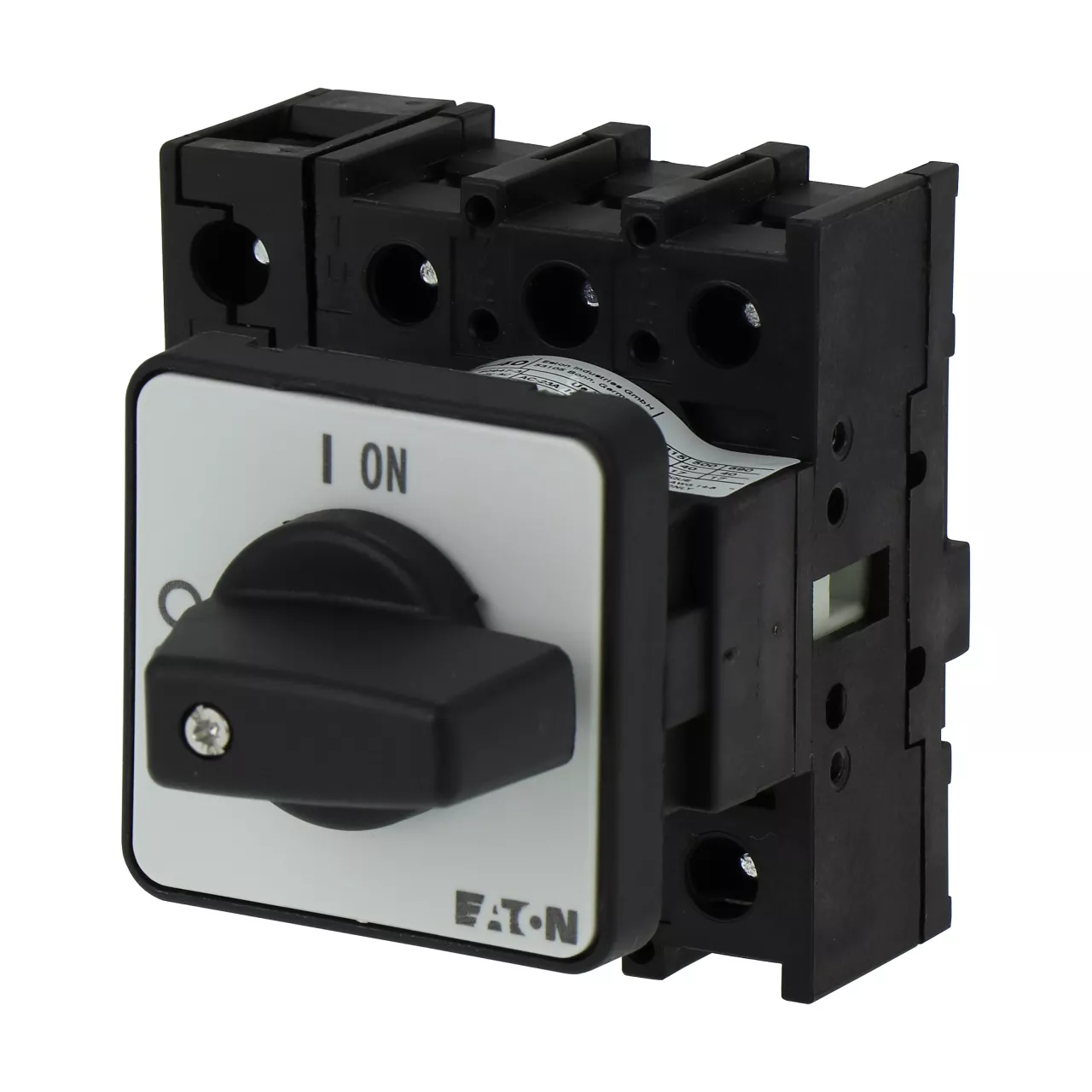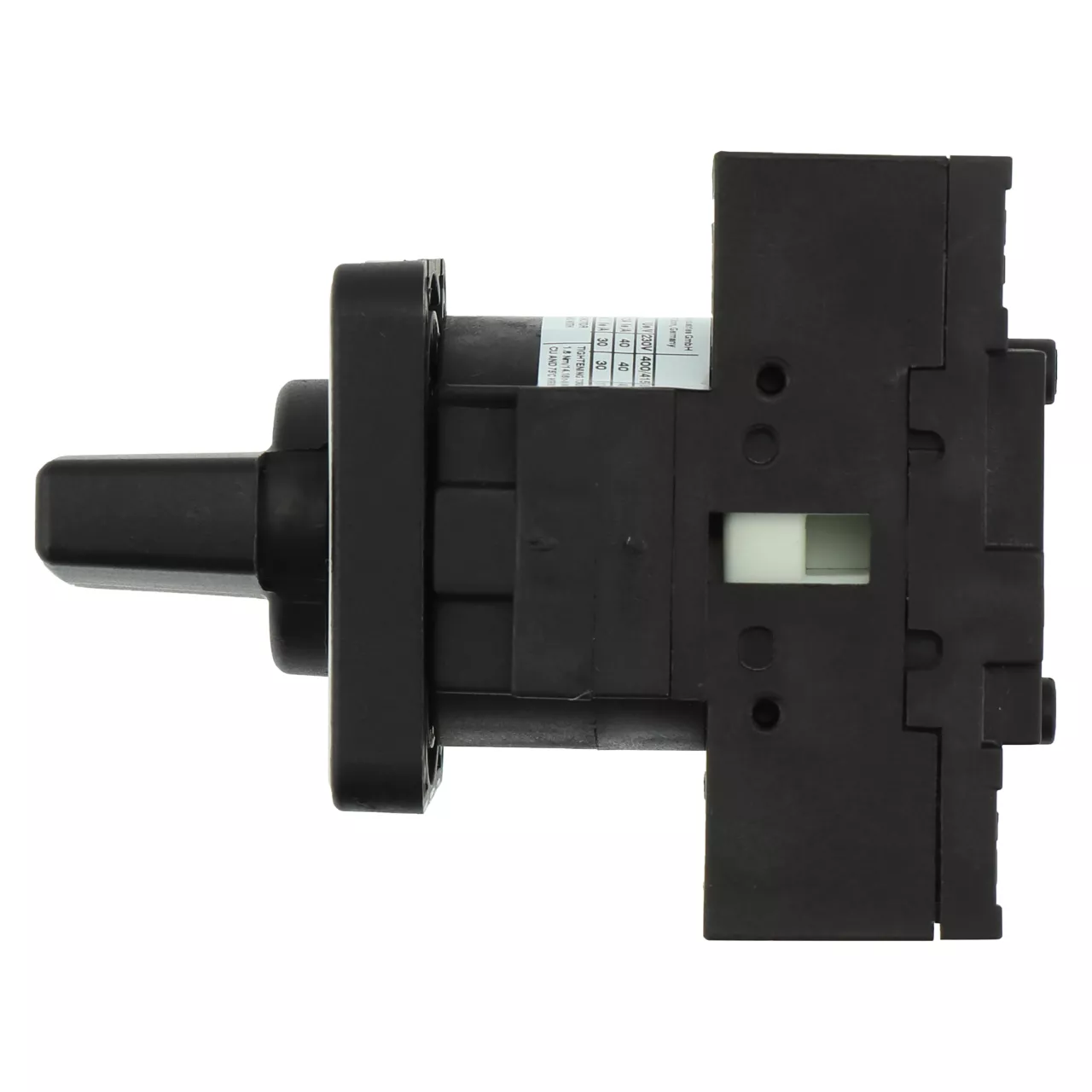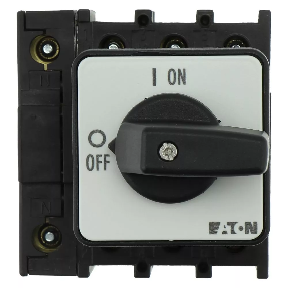 Spínač zapnuto-vypnuto, P1, Jmenovitý trvalý proud (Iu): 40 A, Osazeno: Černá t-rukojeť a čelní plech, Pomocný kontakt, Metoda montáže: Zapuštěná montáž, Počet pólů: Tři póly + N, Stupeň krytí: IP65