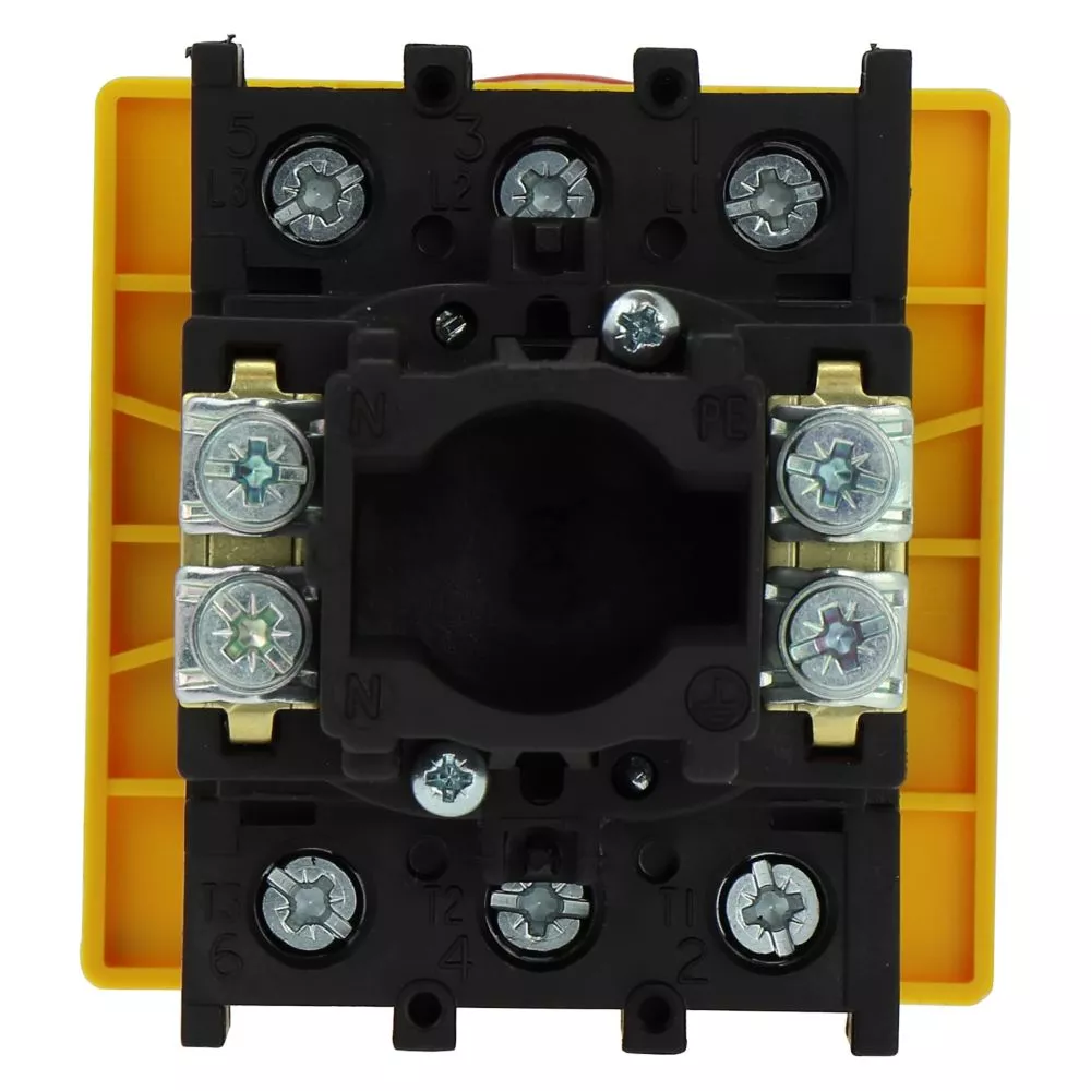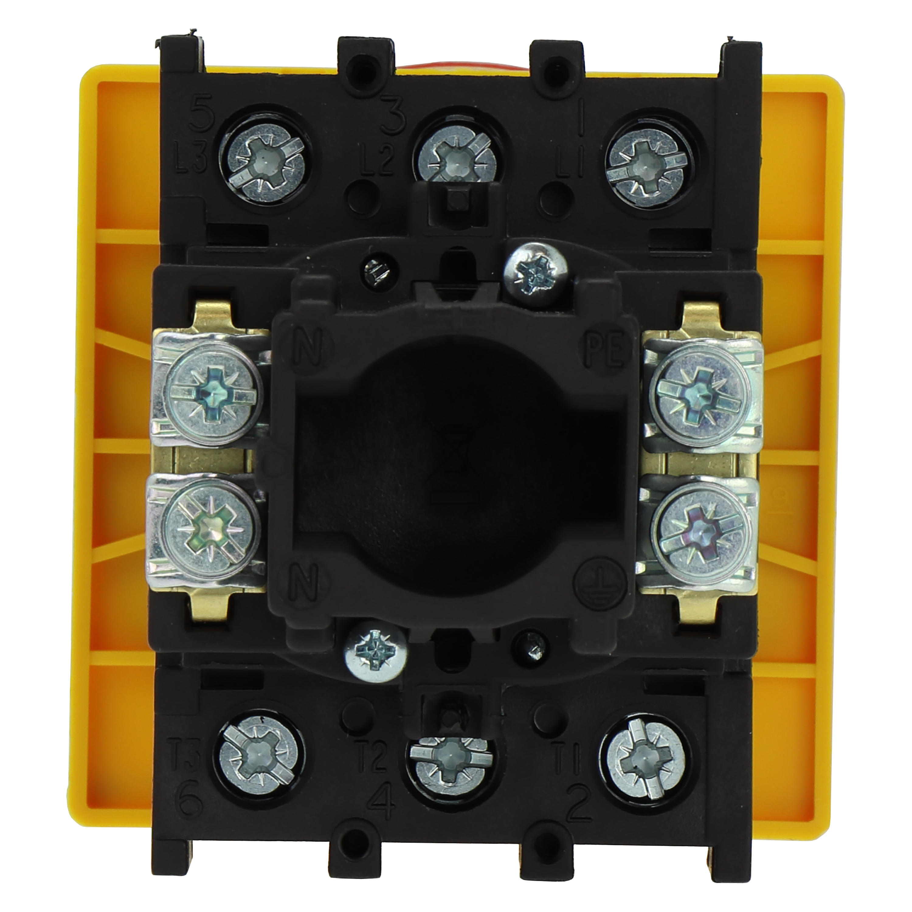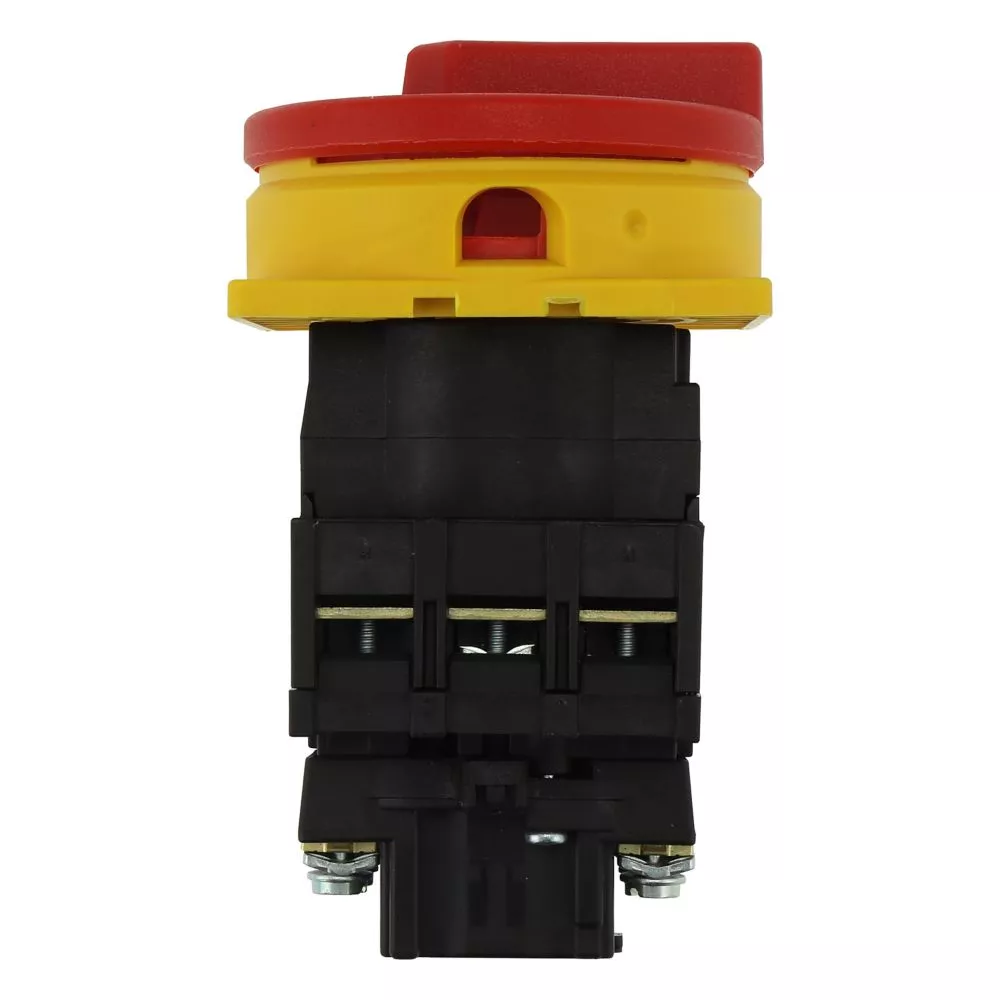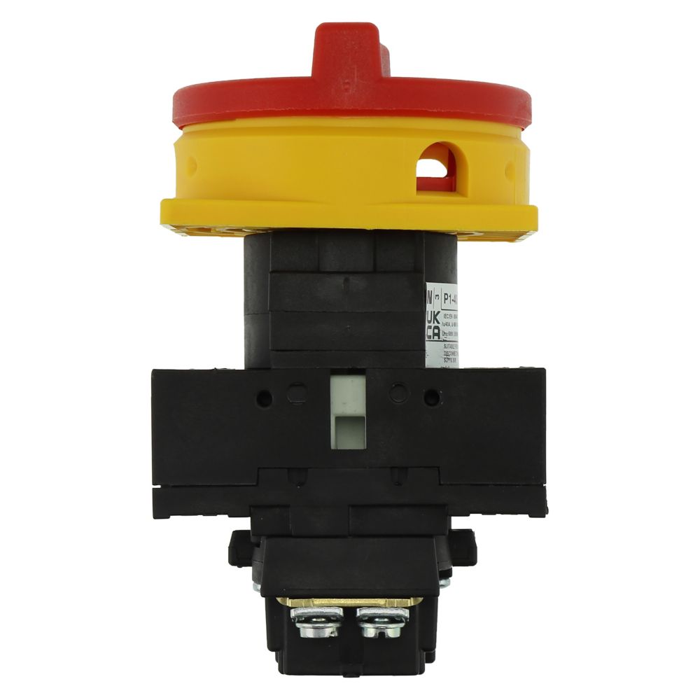 Hlavní vypínač, P1, Jmenovitý trvalý proud (Iu): 40 A, Funkce: Funkce nouzového vypnutí, Se vzájemným blokováním, Osazeno: Červená otočná rukojeť a žlutý zajišťovací kroužek, Pomocný kontakt, Metoda montáže: Zapuštěná montáž, Počet pólů: Tři póly, Uzamykací mechanismus: Možnost uzamčení v poloze 0 (vypnuto), Stupeň krytí: IP65