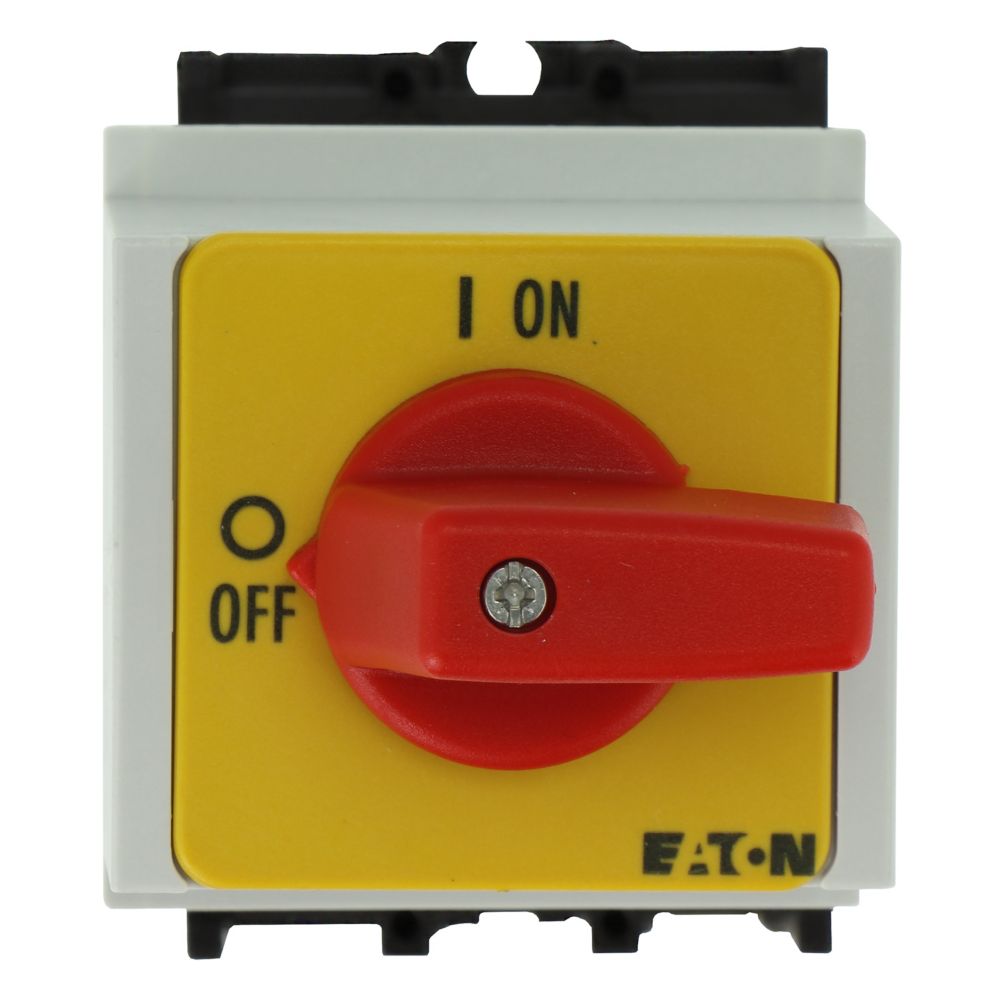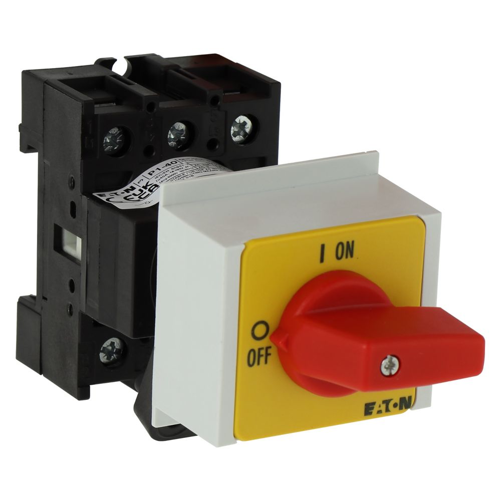Aan-/uitschakelaar, P1, Nominale ononderbroken stroom (Iu): 40 A, Functies: Nooduitschakelfunctie, Uitgerust met: Rode duimgreep en gele voorplaat, Hulpcontact, Montagewijze: Installatie-verdelerinbouw, Aantal polen: Driepolig, Beschermingsgraad: IP30