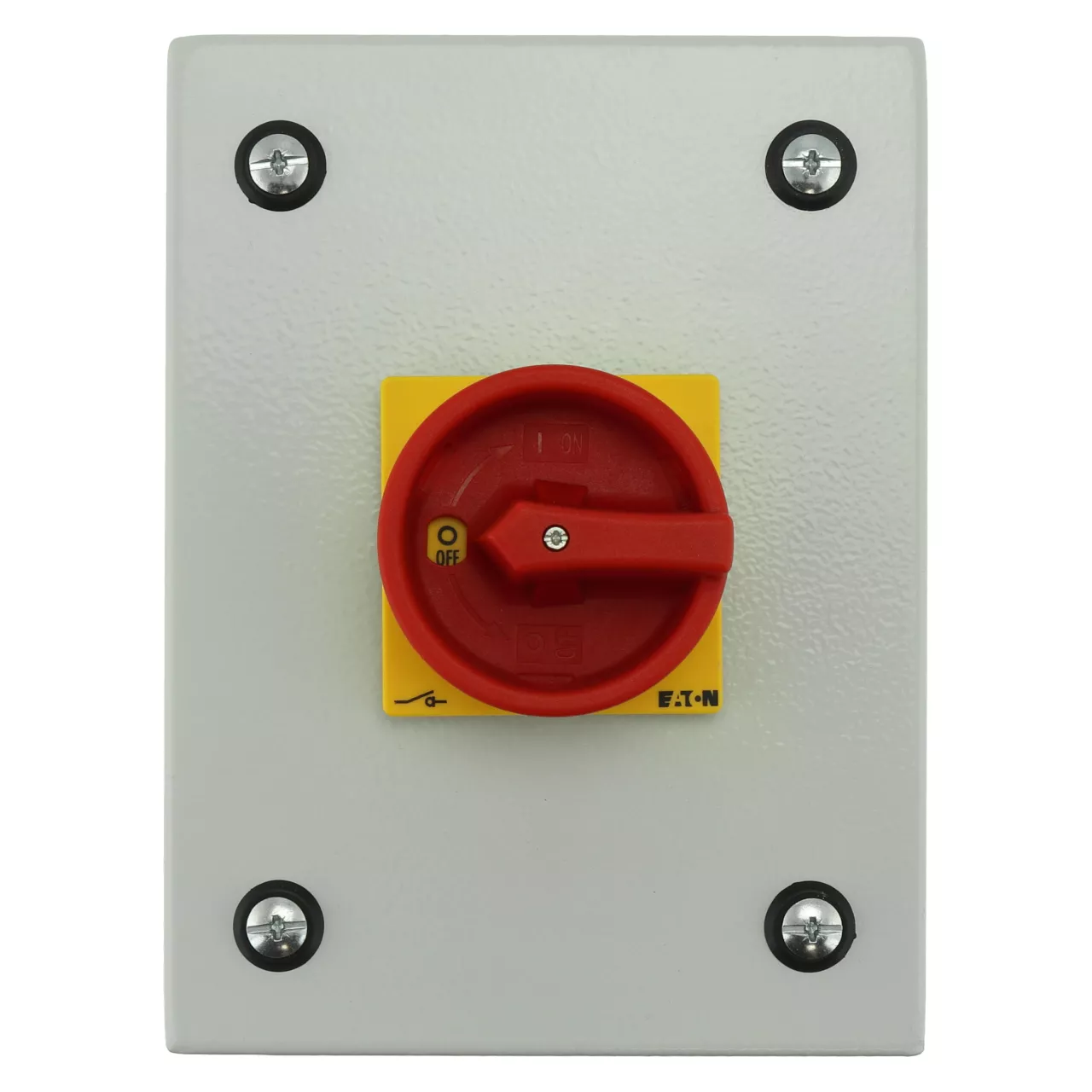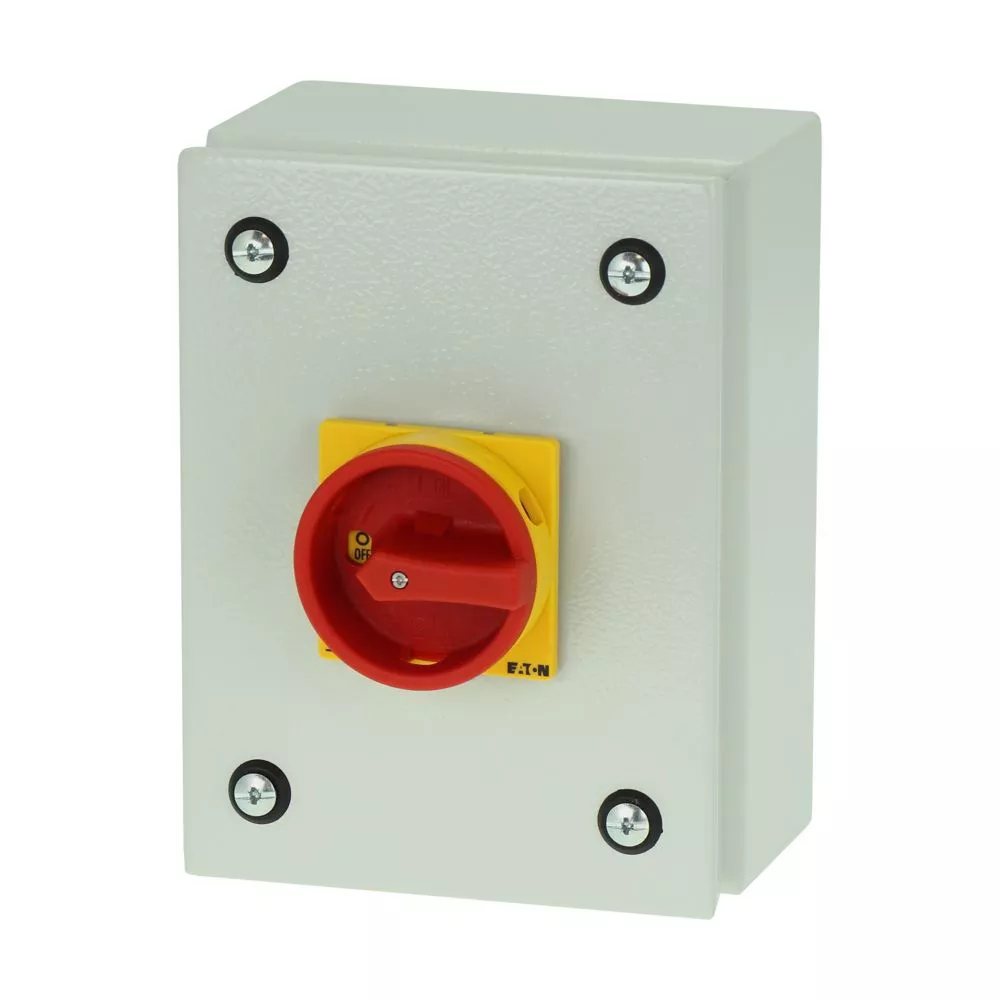 P1-40/SE1/SVB/N Rozłącznik ZAŁ-WYŁ, 3 bieg.+N, 40A, w obudowie ze stali, pokrętło czerwono-żółte z blokadą na kłódkę
